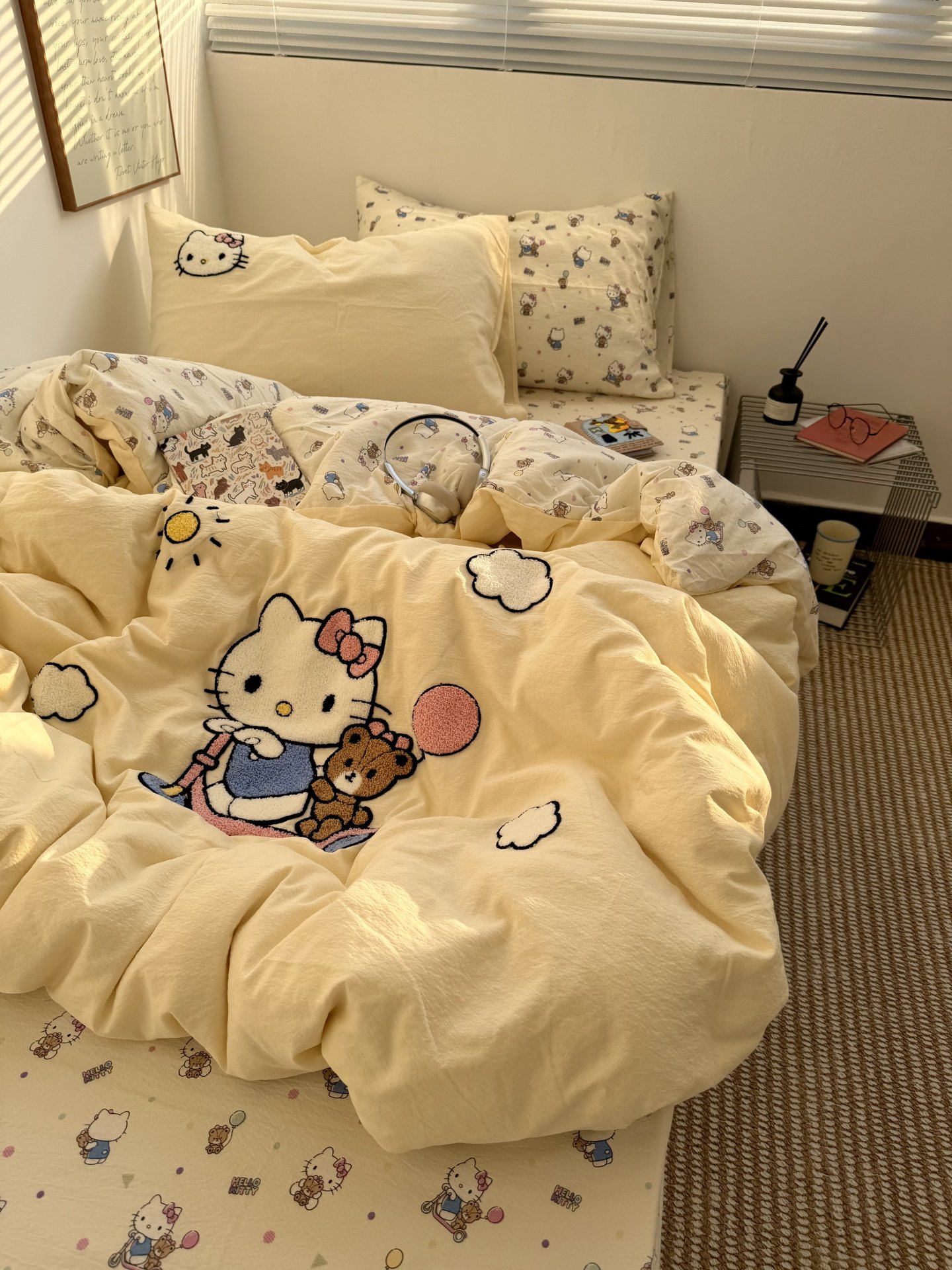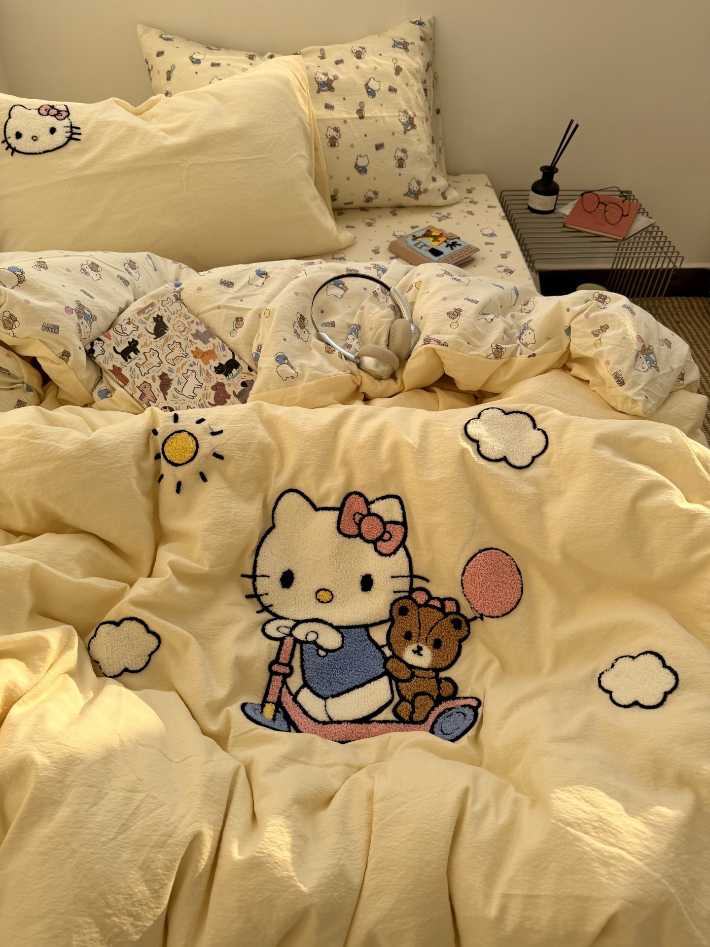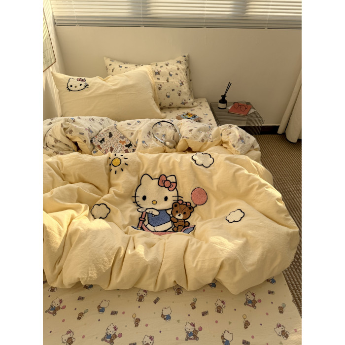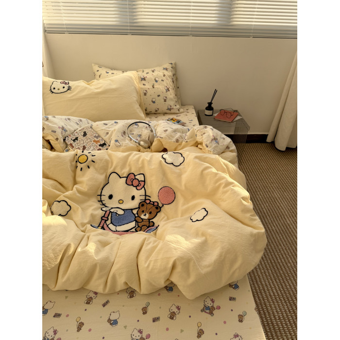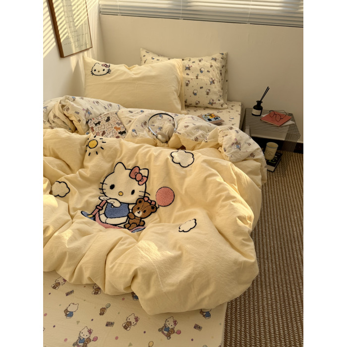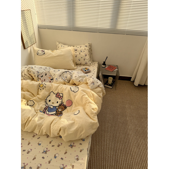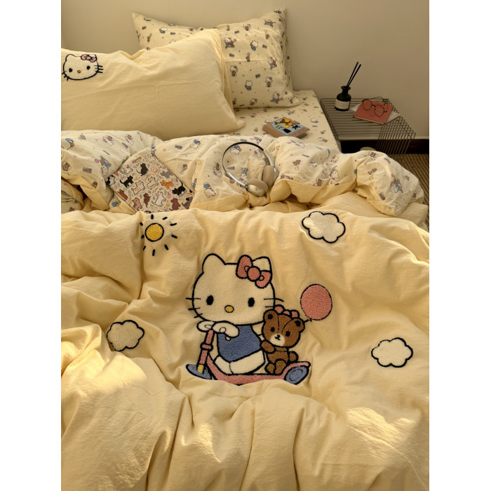 ins奶油黃可愛滑板kt毛巾綉水洗棉床單四件套純棉被套全棉三件套