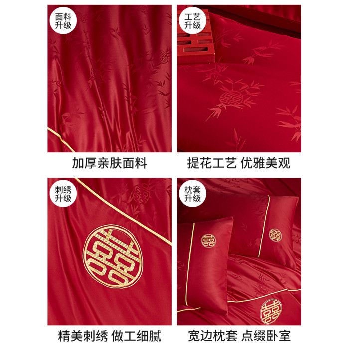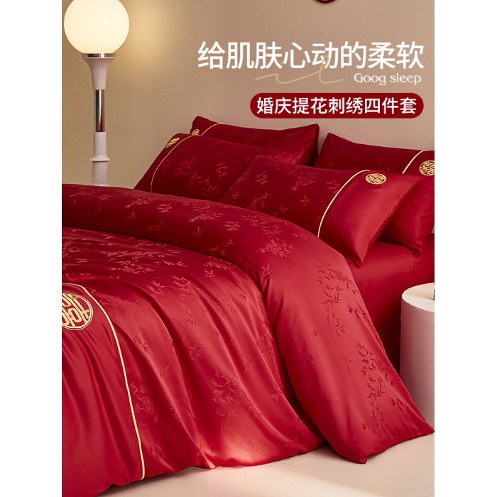 高檔提花結婚床上四件套婚慶大紅色非純棉全棉被套新婚房喜被床單