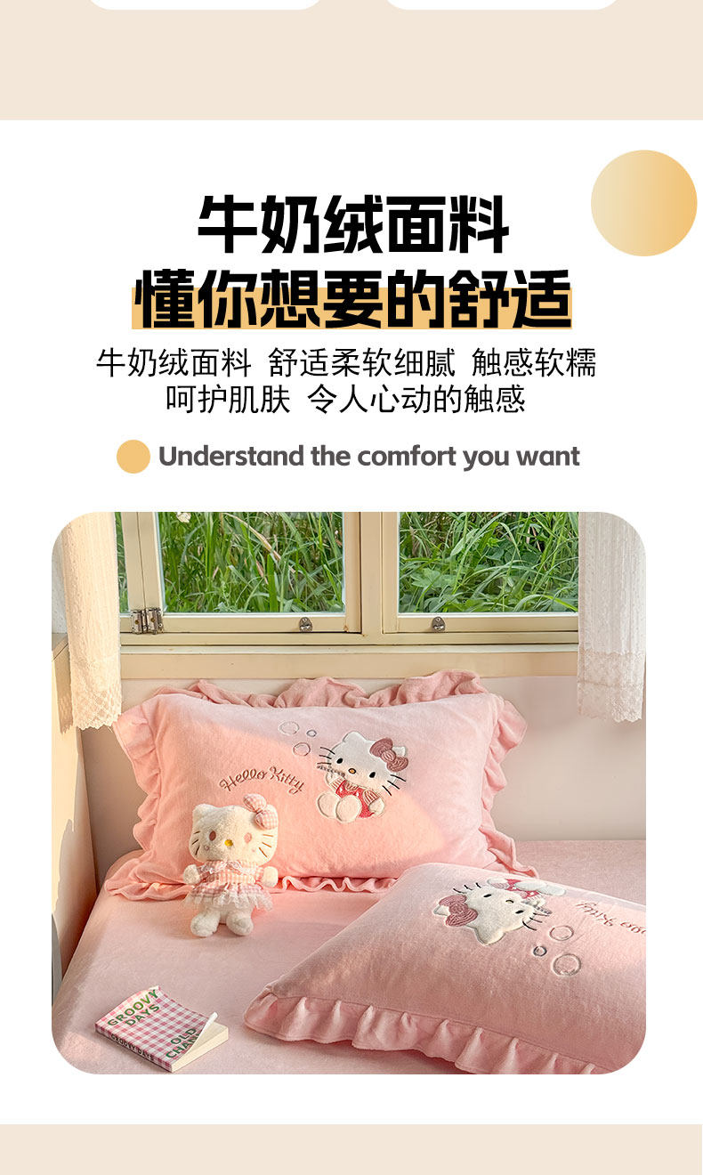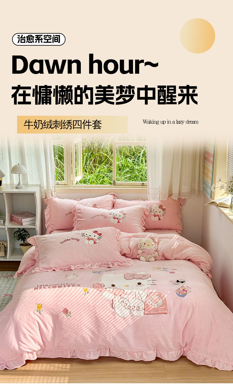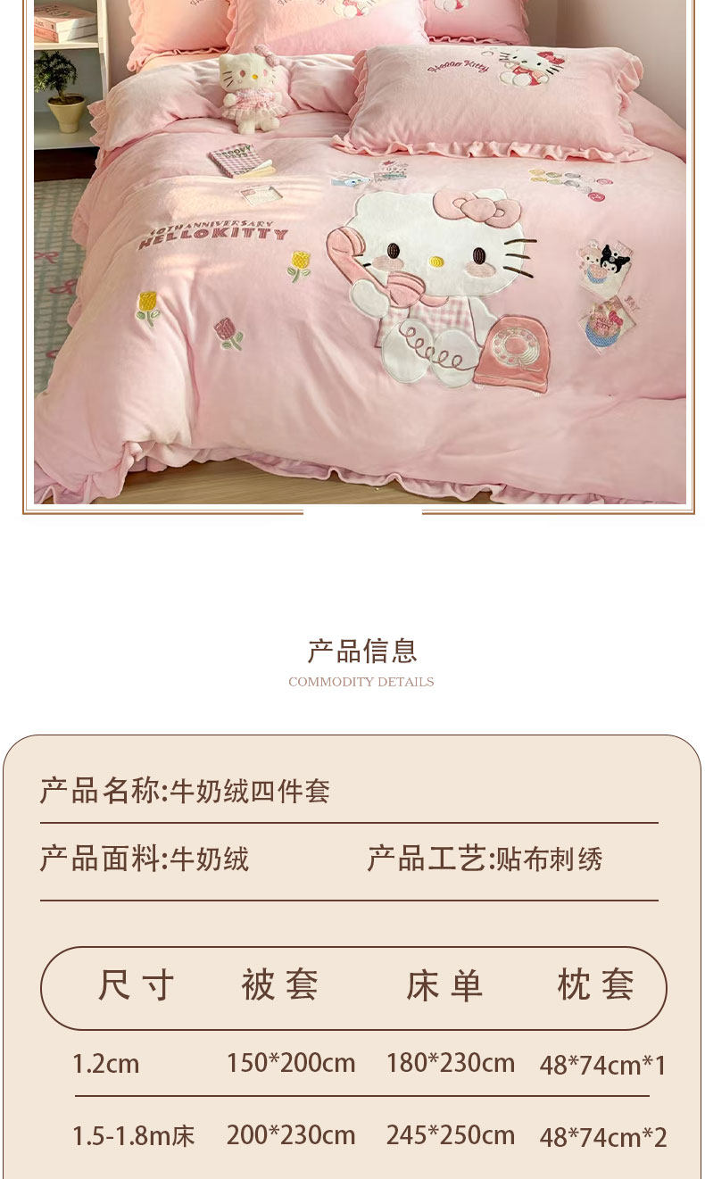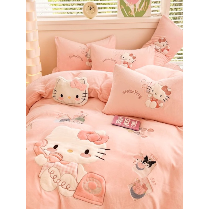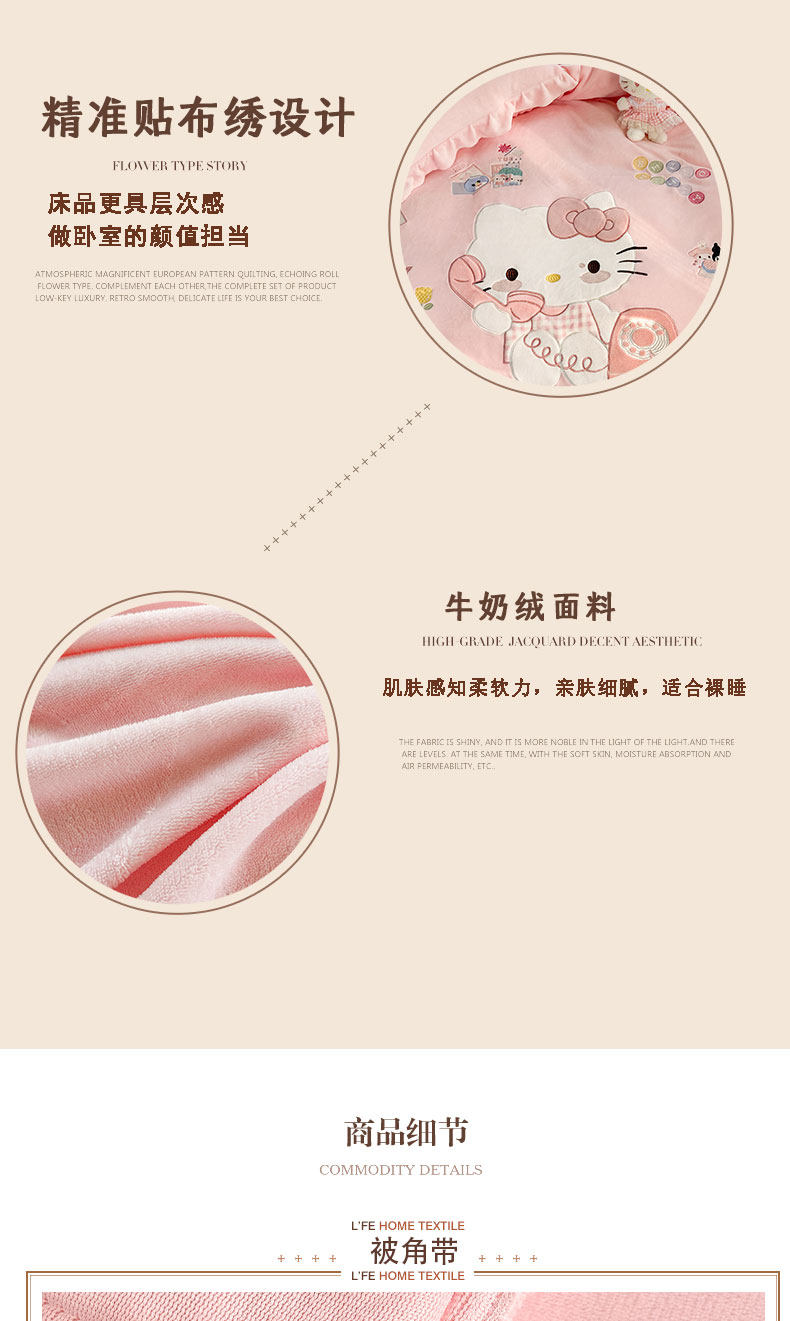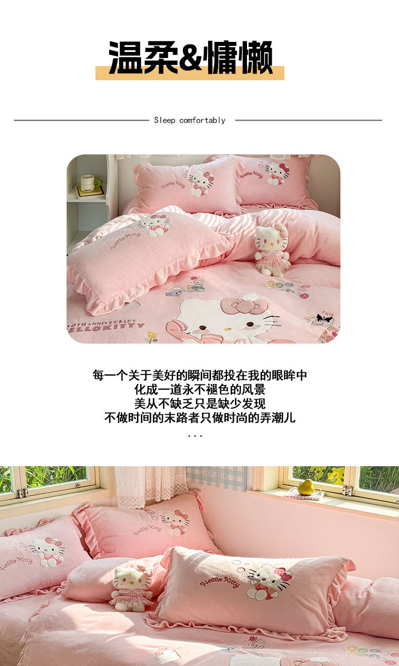 hellokitty牛奶絨床上四件套兒童女孩雙面加絨被套珊瑚絨床單三件
