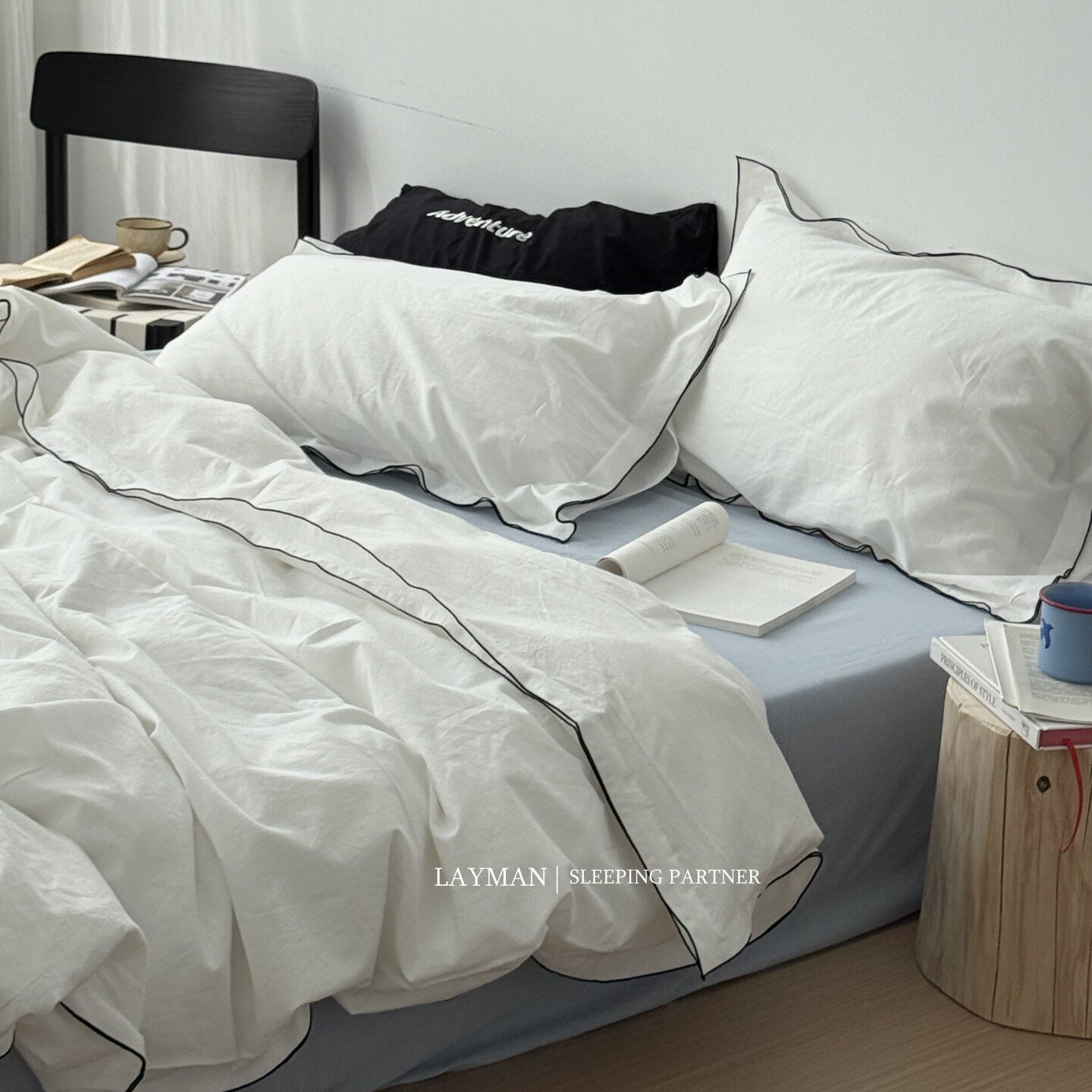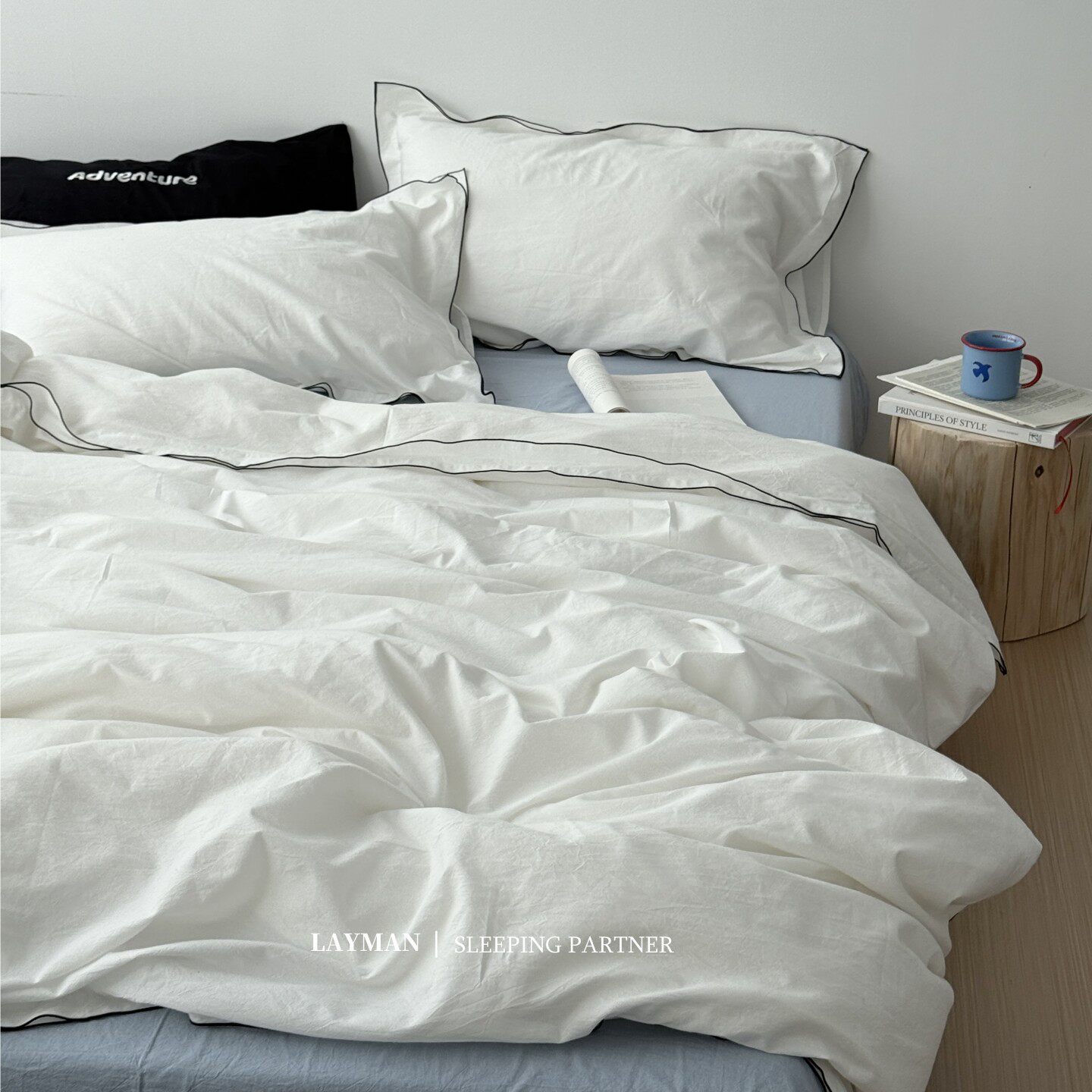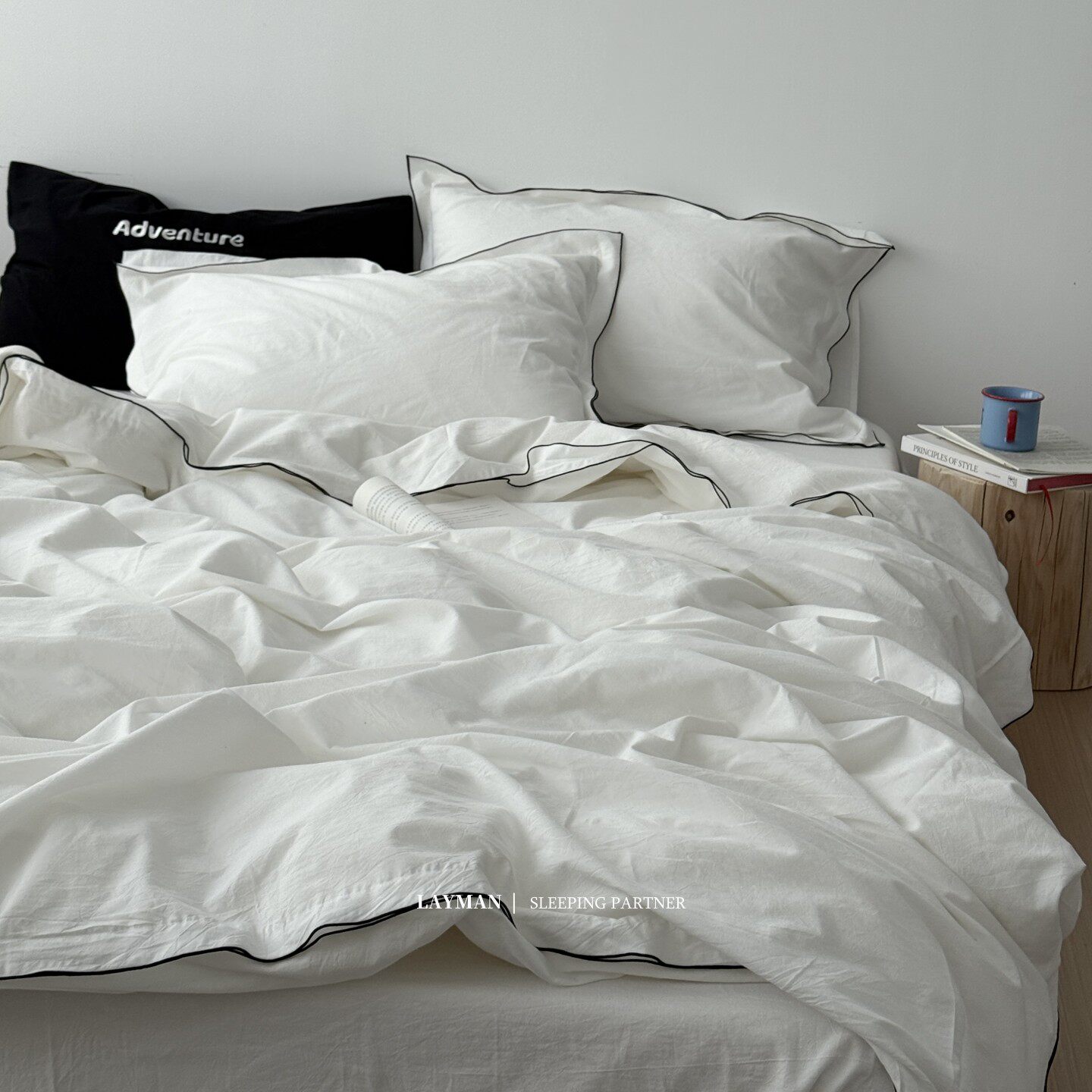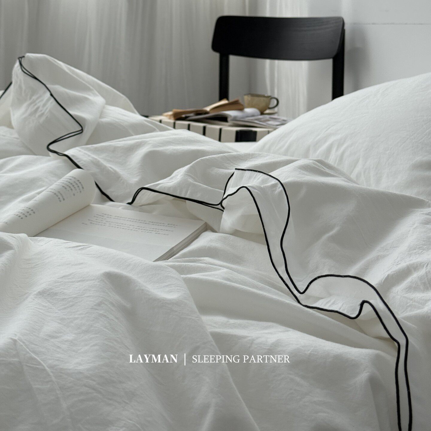 Layman外行 【白梨水】黑邊密拷白色全棉水洗棉四件套酒店民宿風