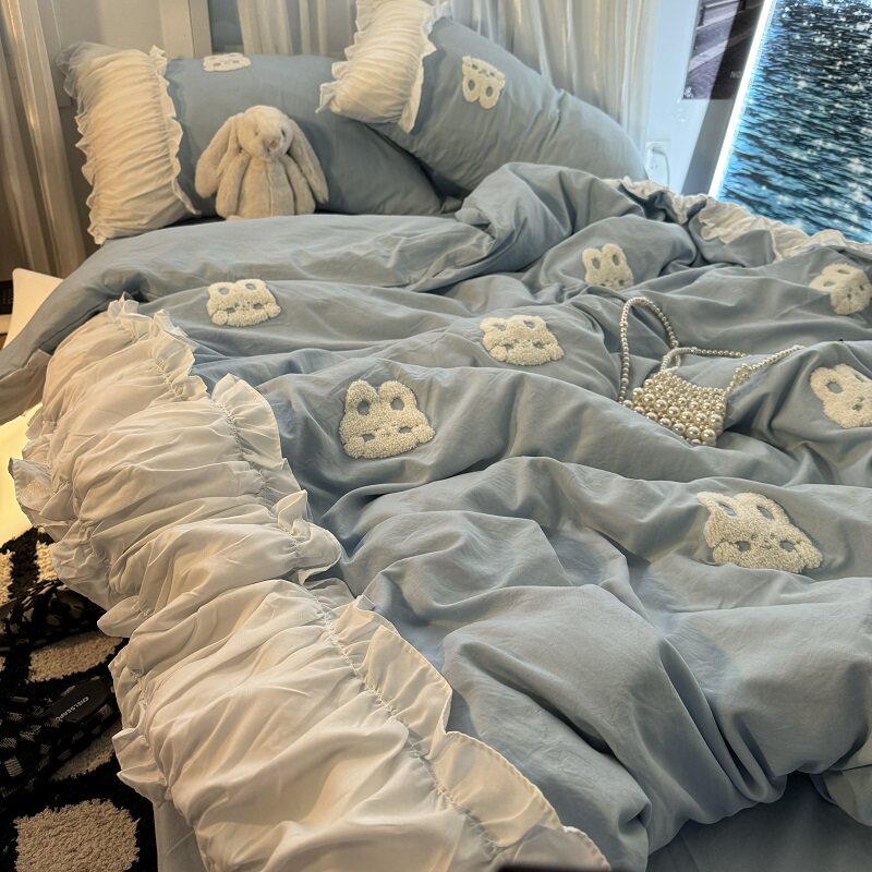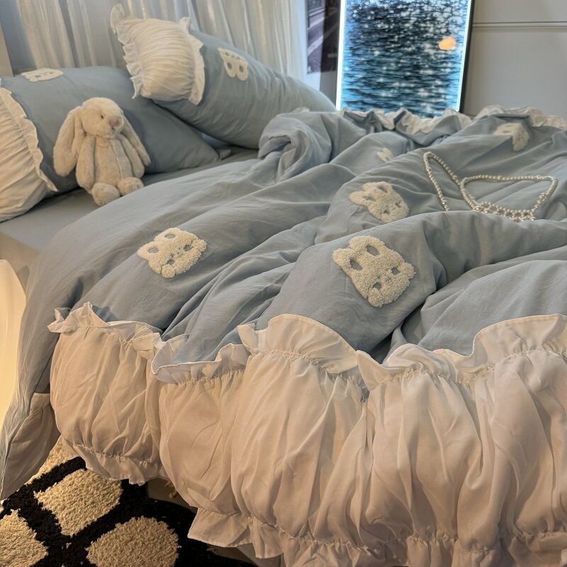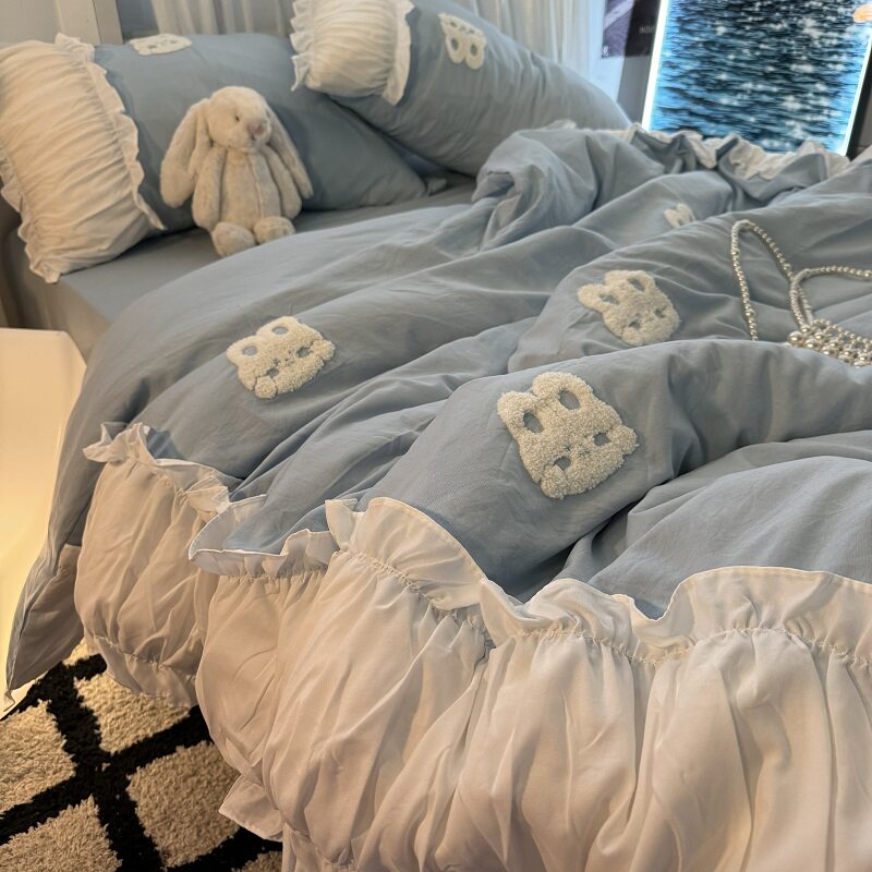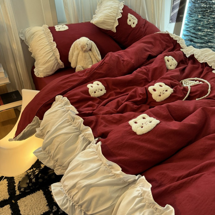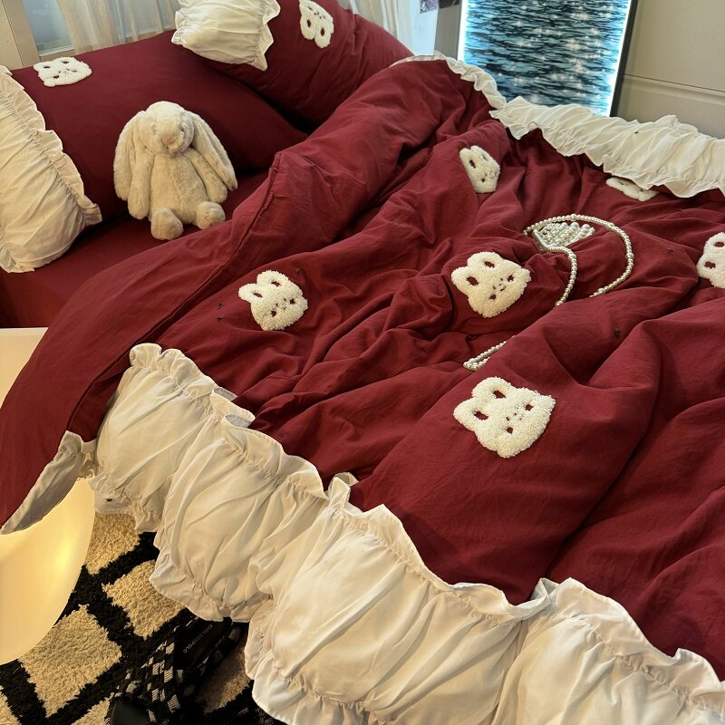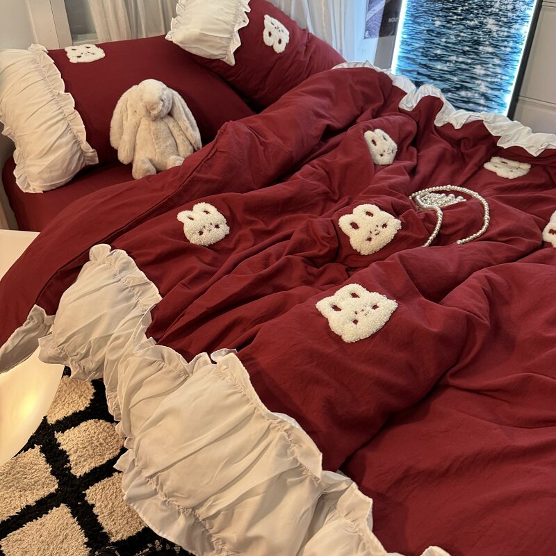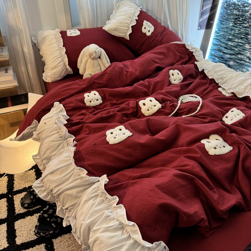 復古紅色女生大花邊公主被套水洗棉床單純棉四件套床品宿捨三件套