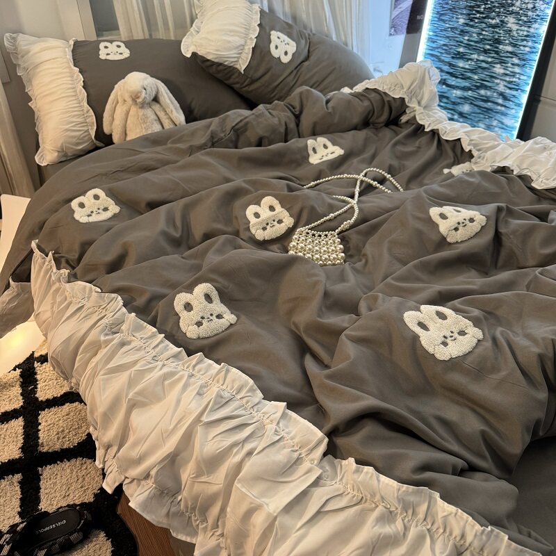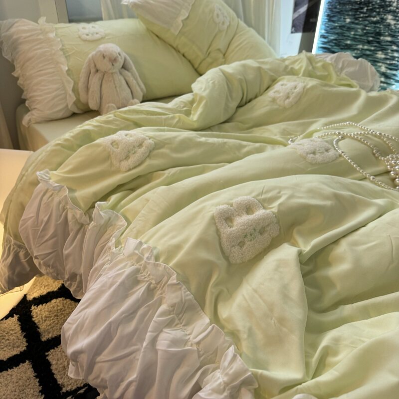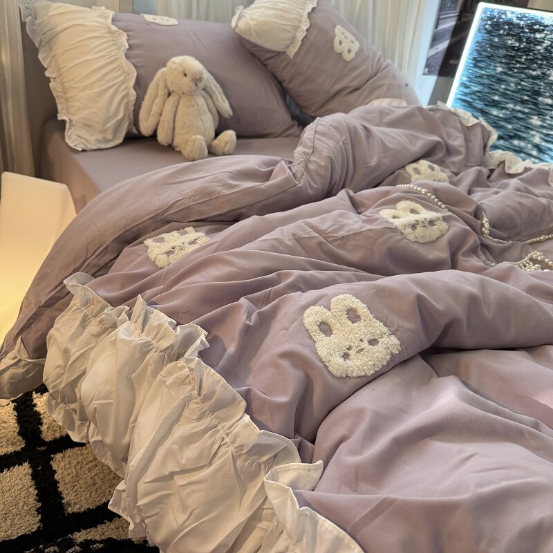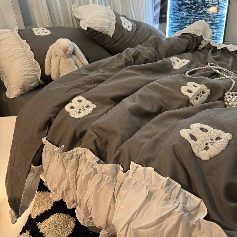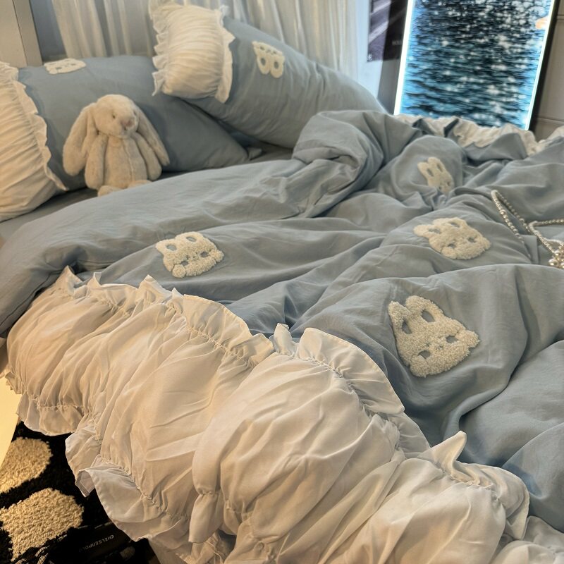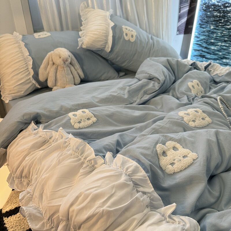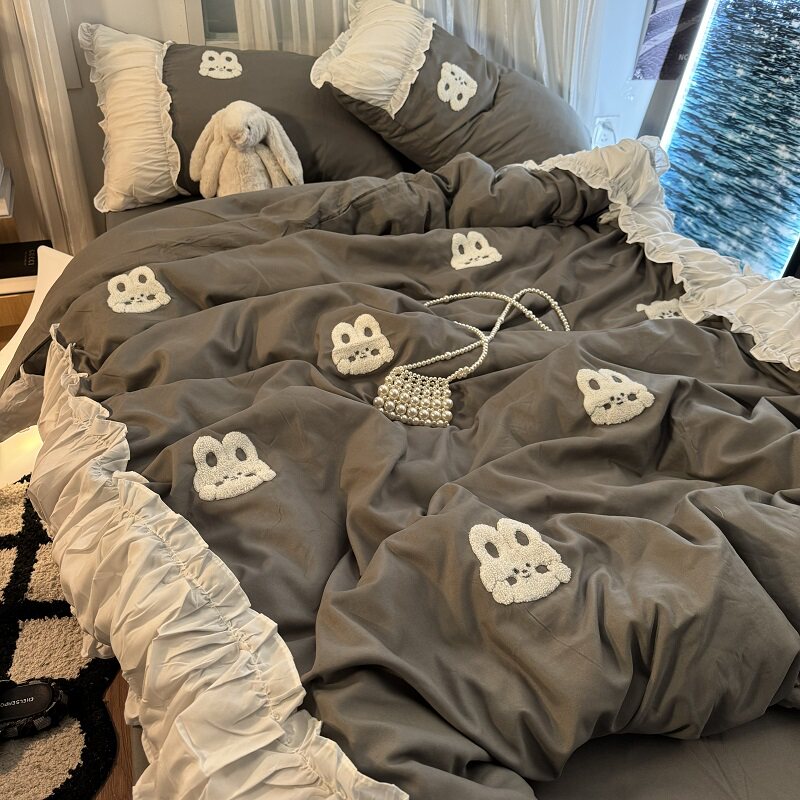 復古紅色女生大花邊公主被套水洗棉床單純棉四件套床品宿捨三件套