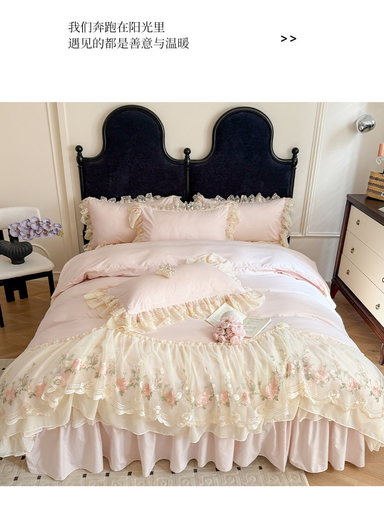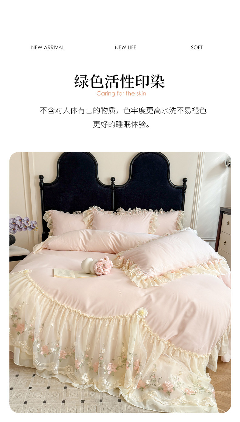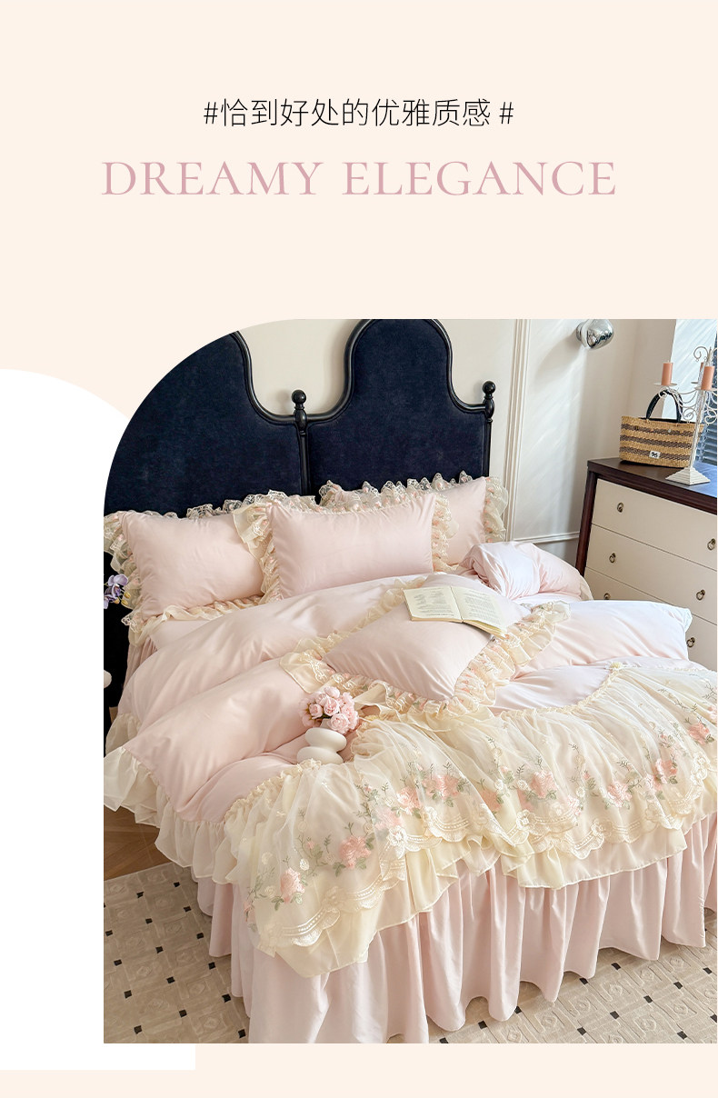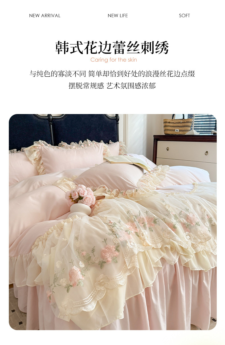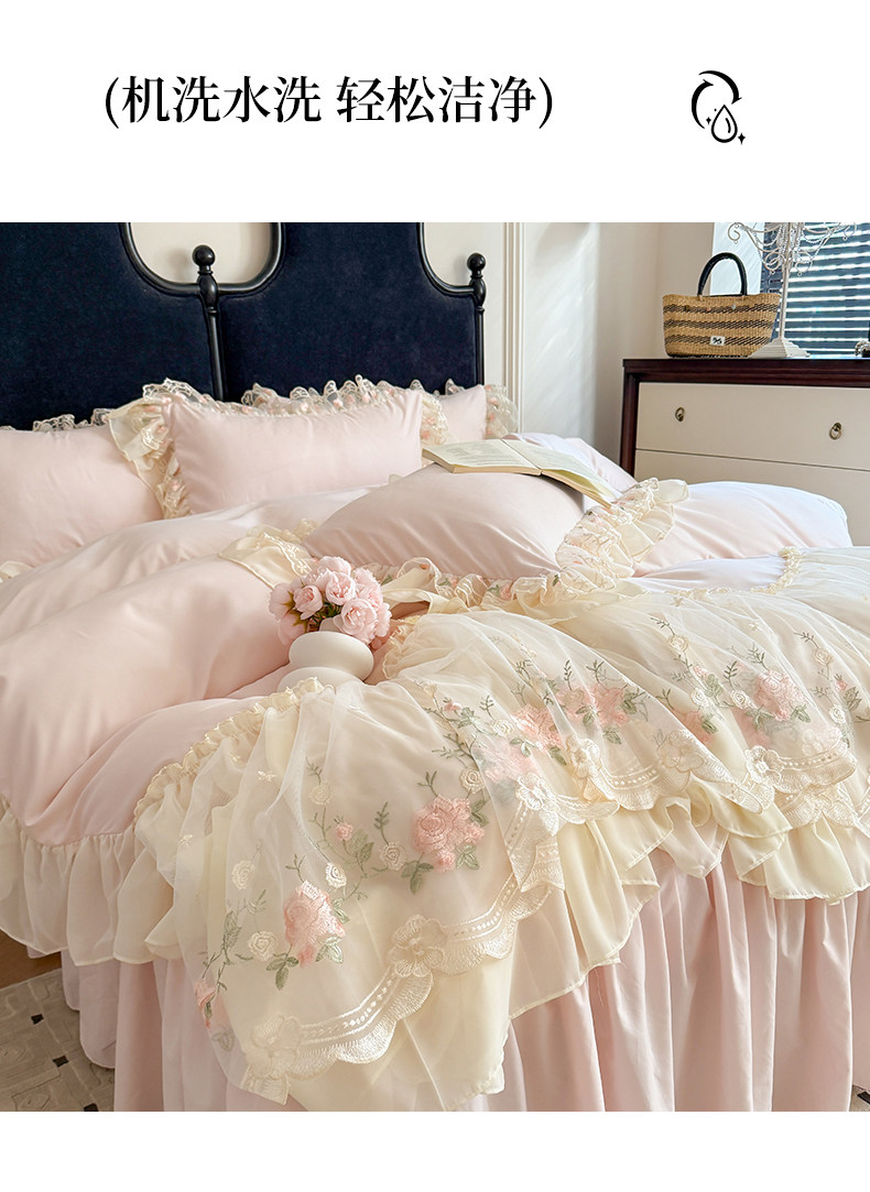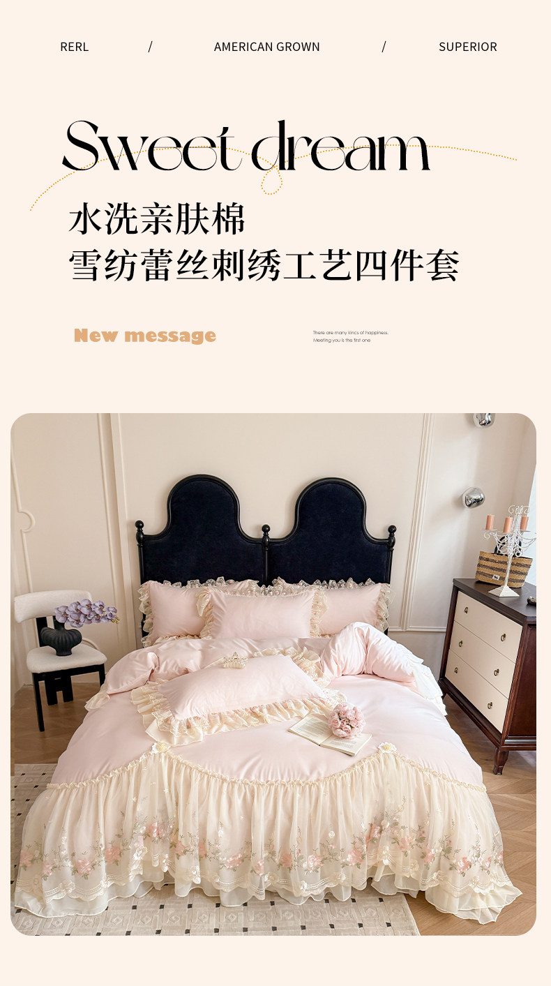 法式輕奢公主風水洗棉四件套2025新款蕾絲刺綉花邊款被套床單床品