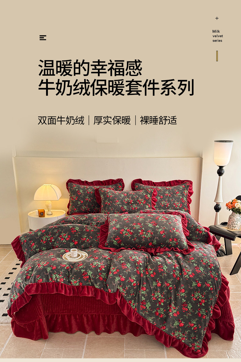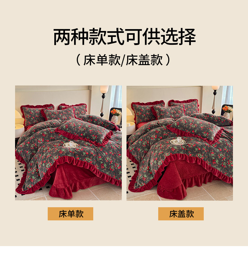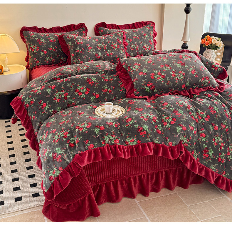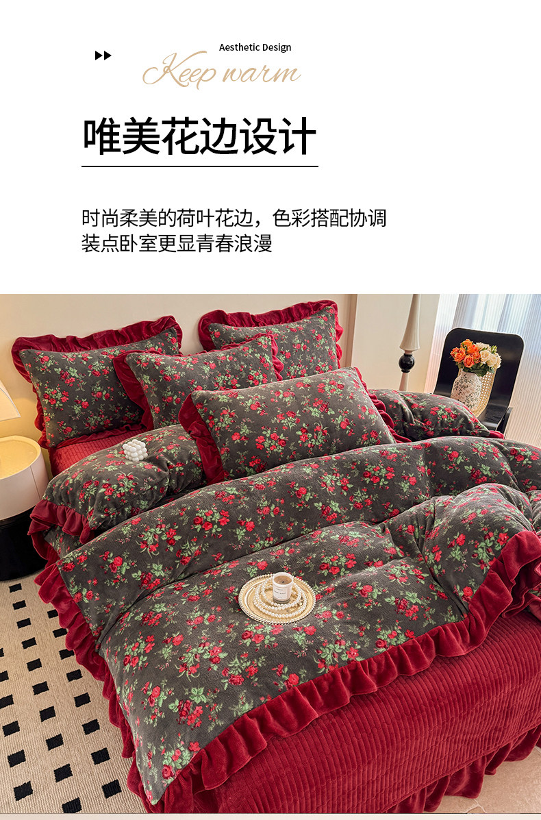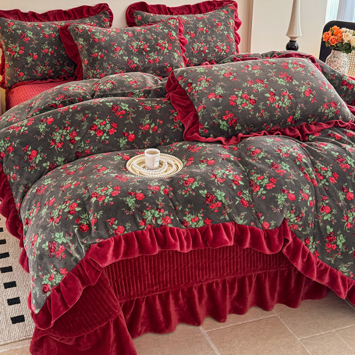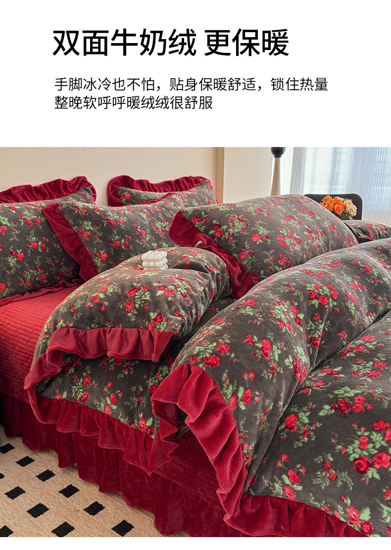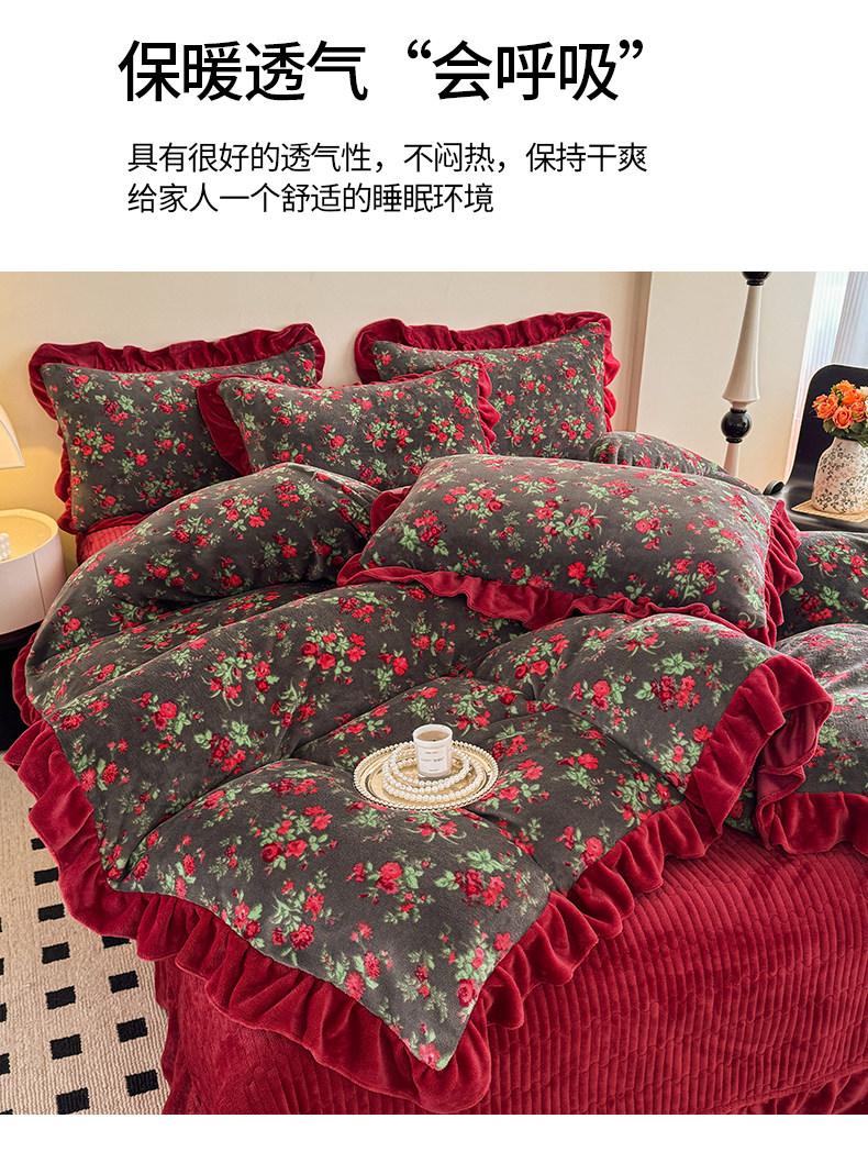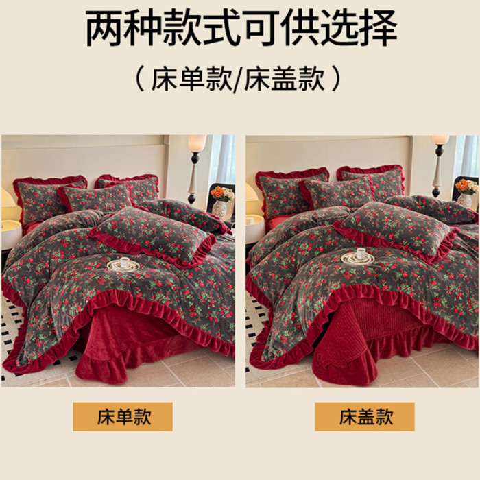 法式復古風小碎花牛奶絨四件套花邊冬季加厚珊瑚絨被套床單