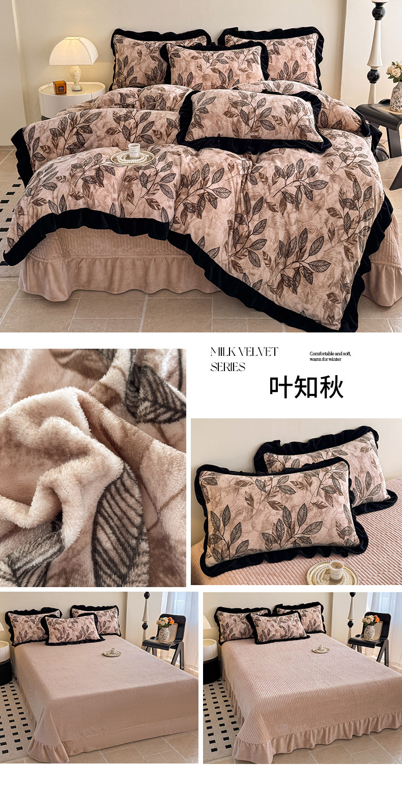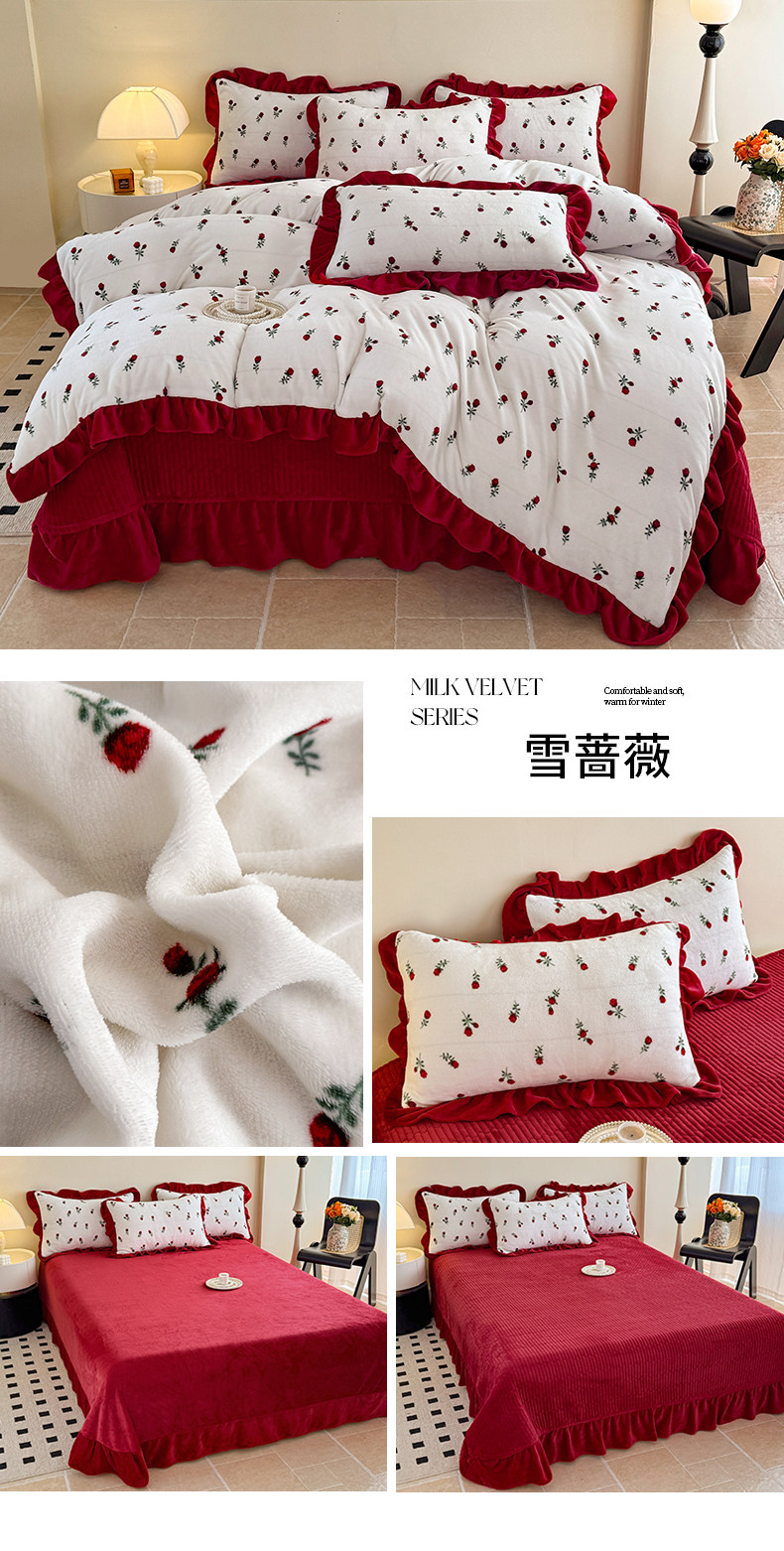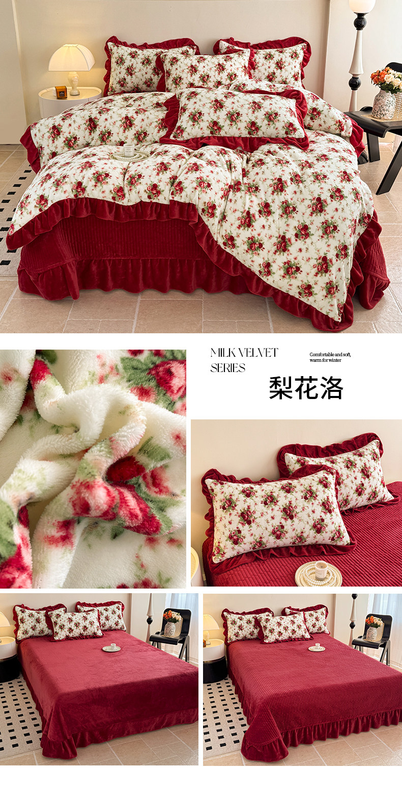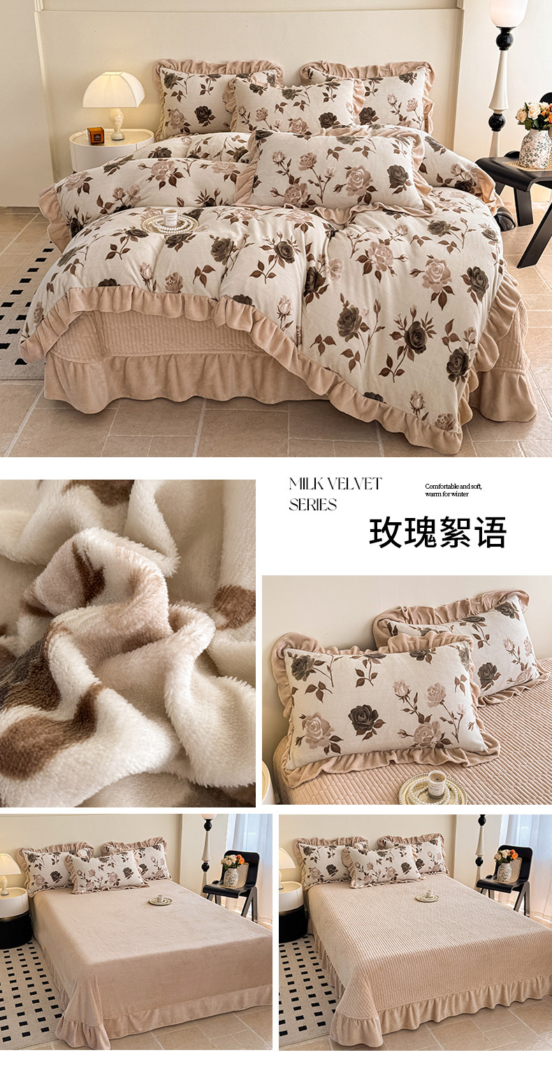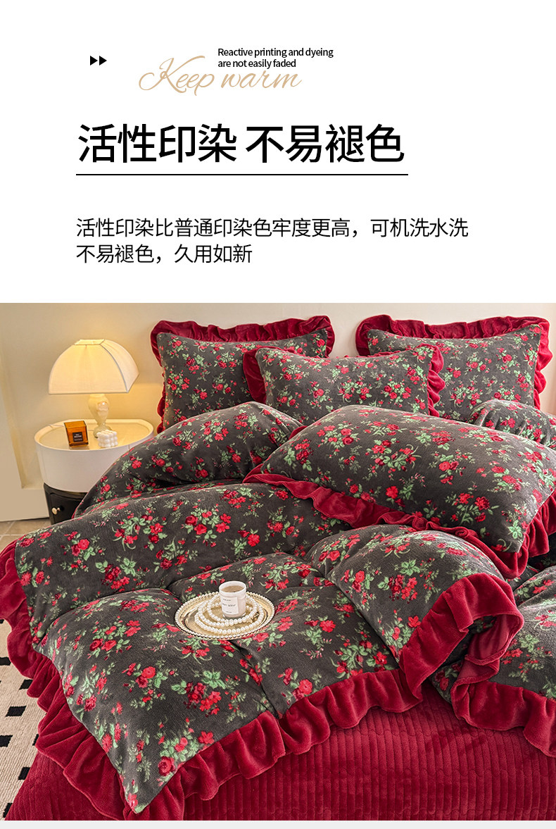 法式復古風小碎花牛奶絨四件套花邊冬季加厚珊瑚絨被套床單