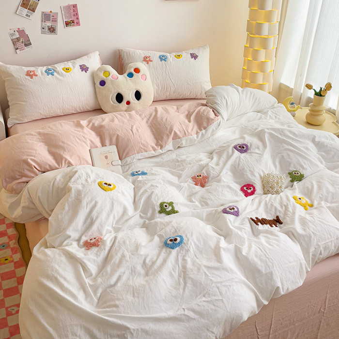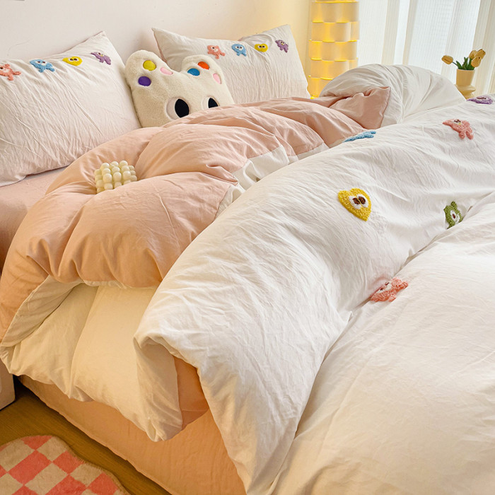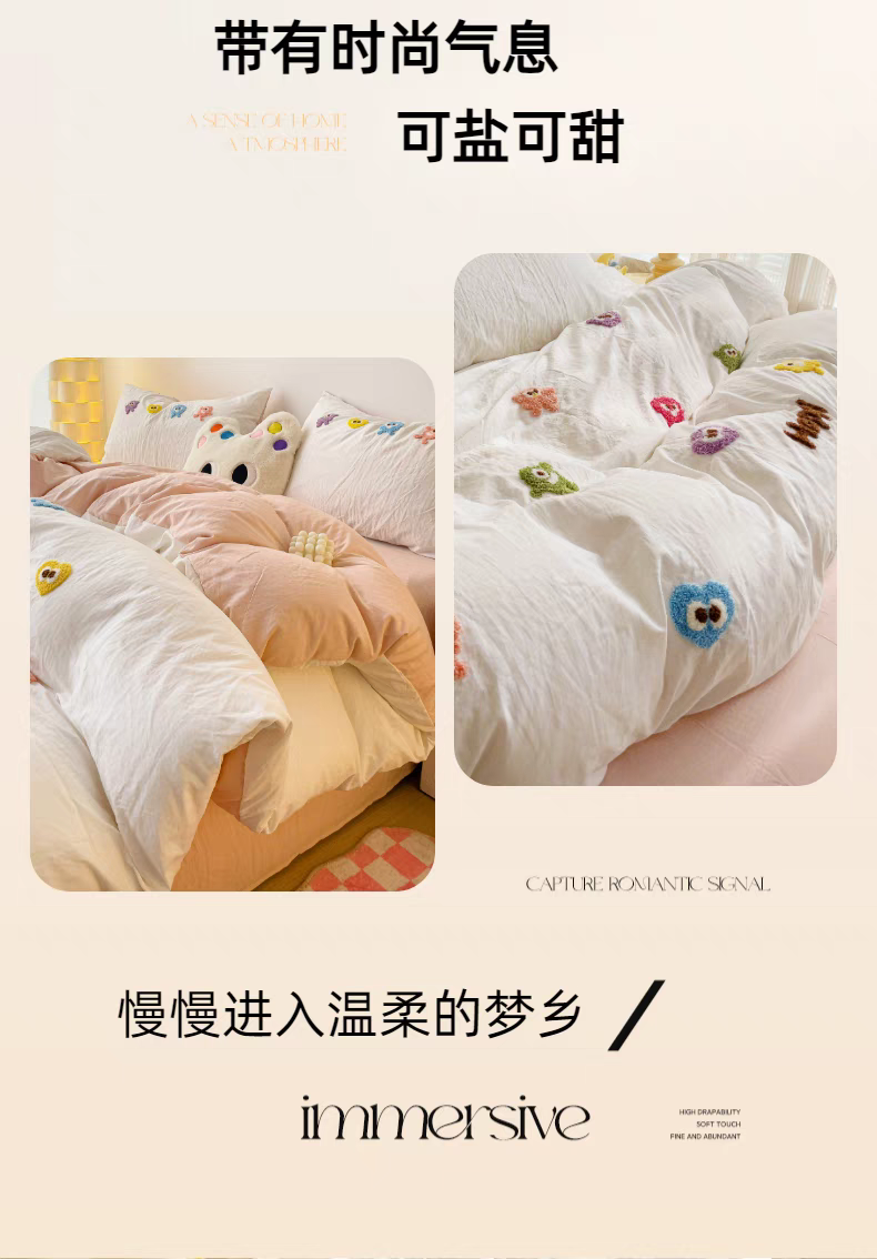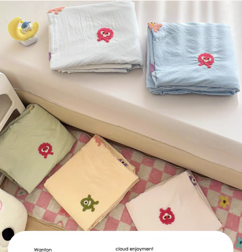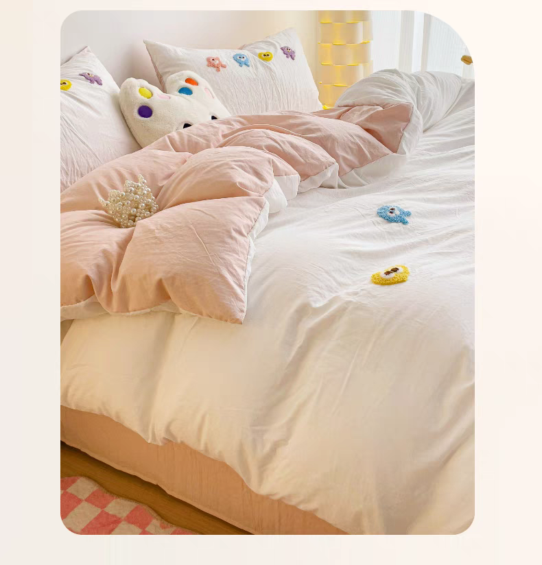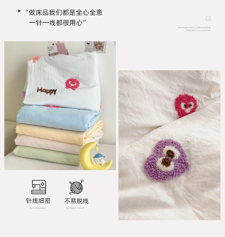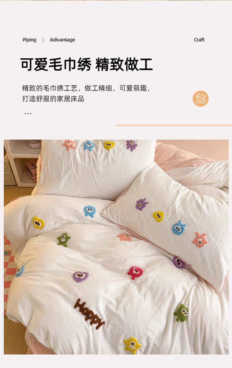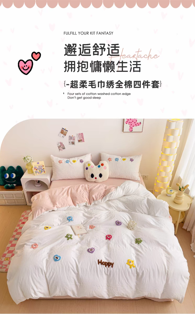 奶油多巴胺純棉毛巾綉四件套ins全棉被套床單宿捨三件套床上用品4