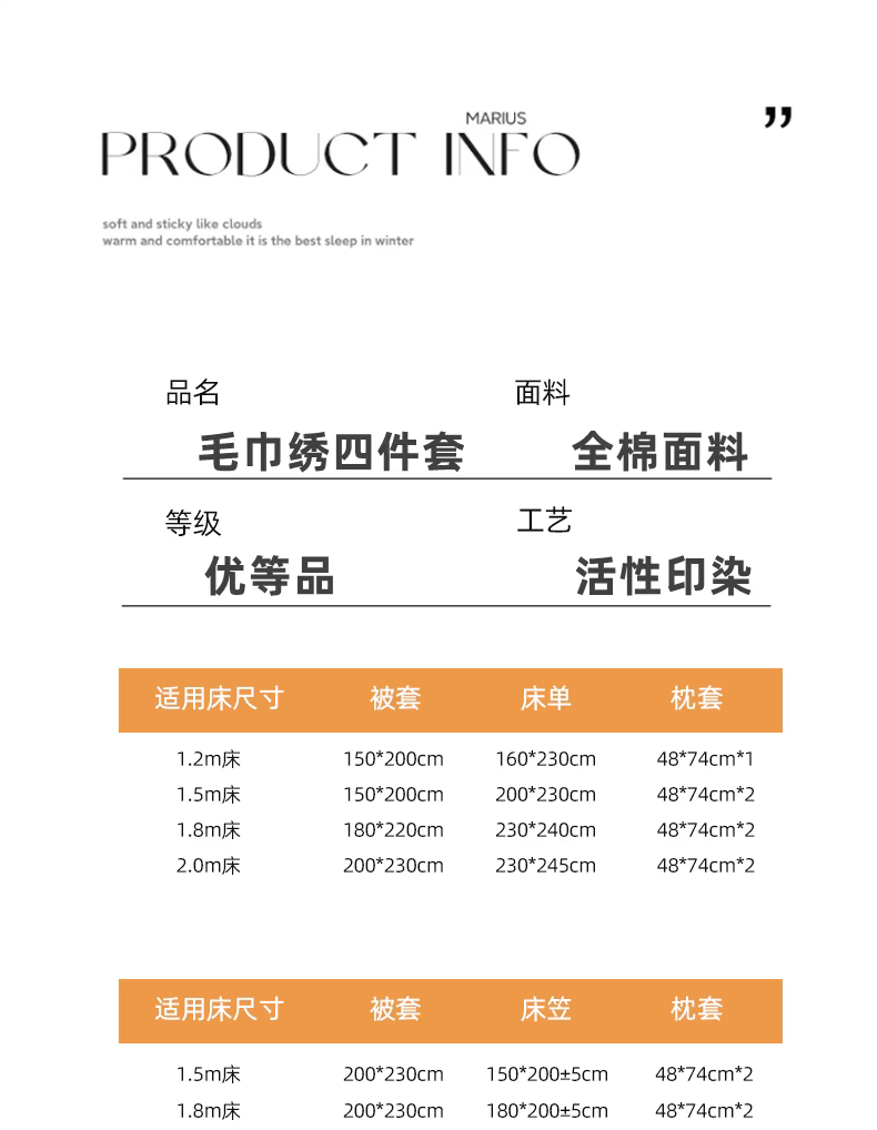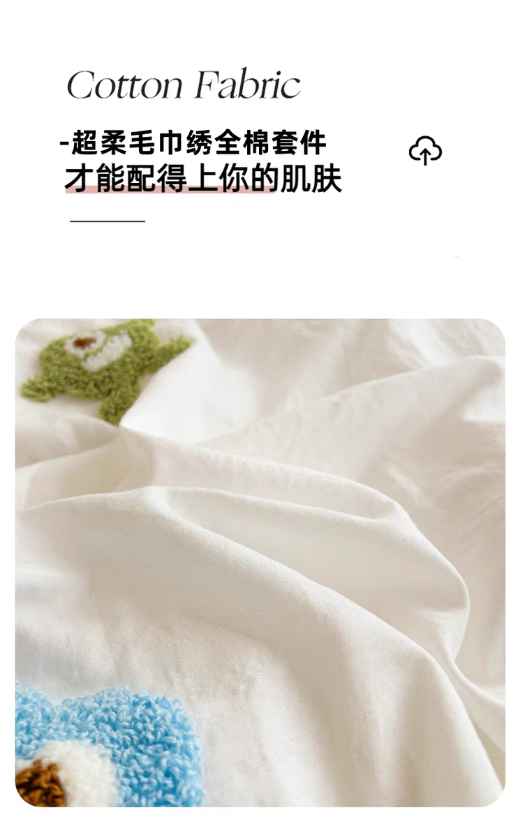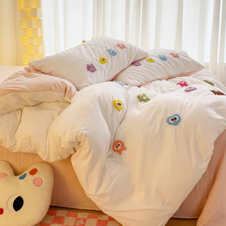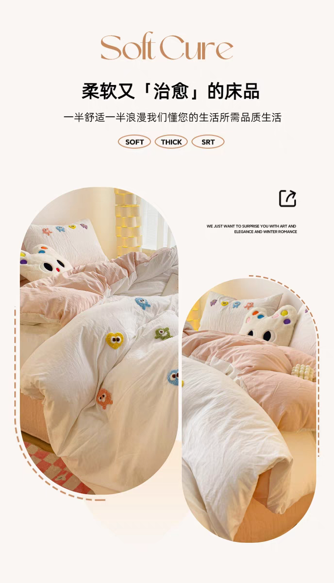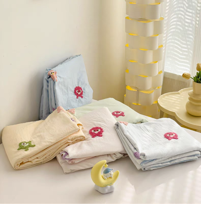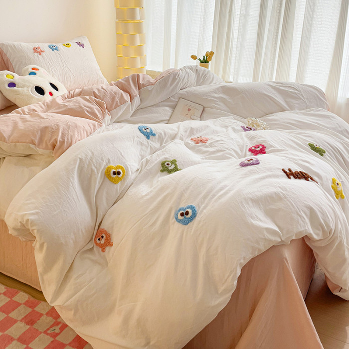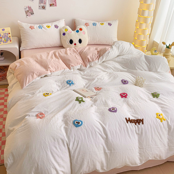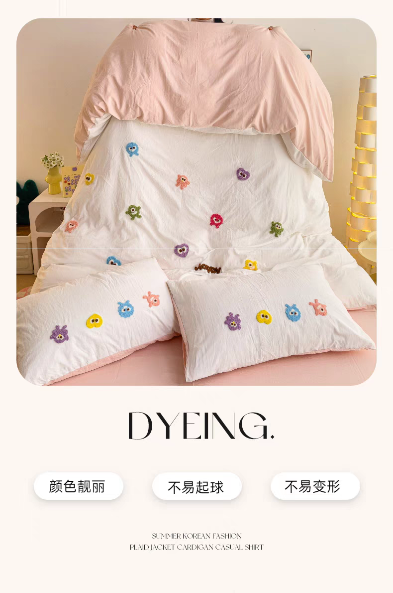 奶油多巴胺純棉毛巾綉四件套ins全棉被套床單宿捨三件套床上用品4