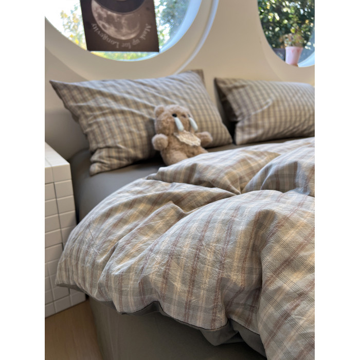 簡約日式灰格子純棉水洗棉四件套公寓床上全棉被套三件套1.5m家用