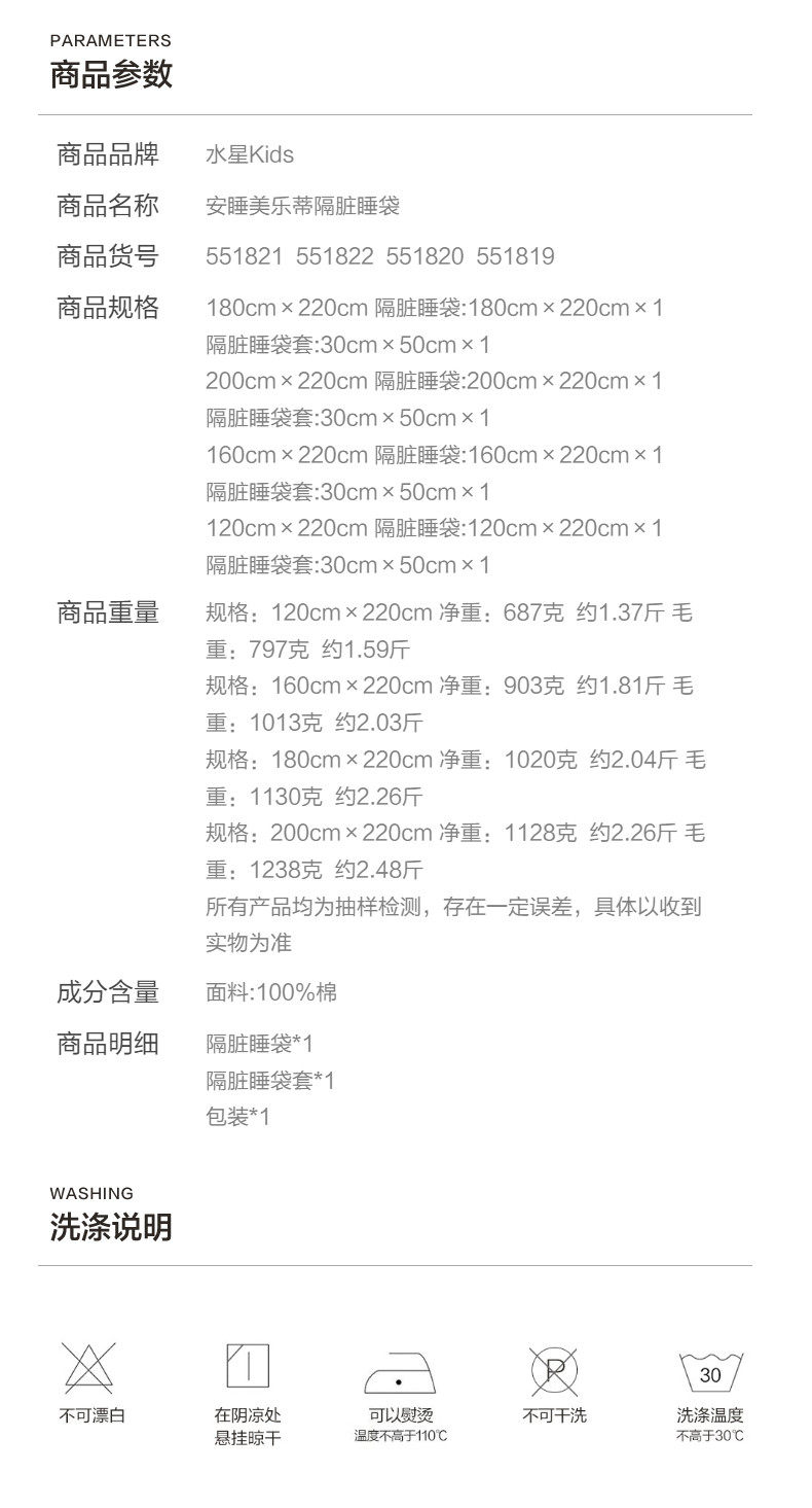 水星家紡兒童隔髒睡袋母嬰A類全棉抗菌床單被套出差旅行可攜式床品