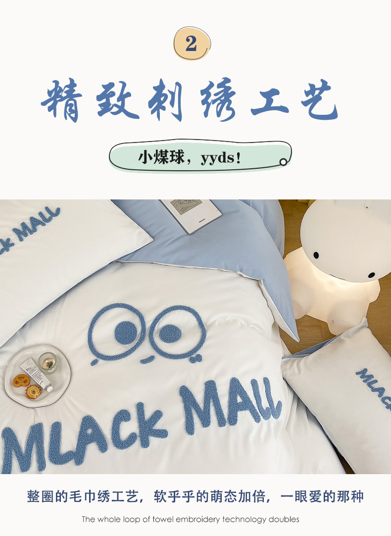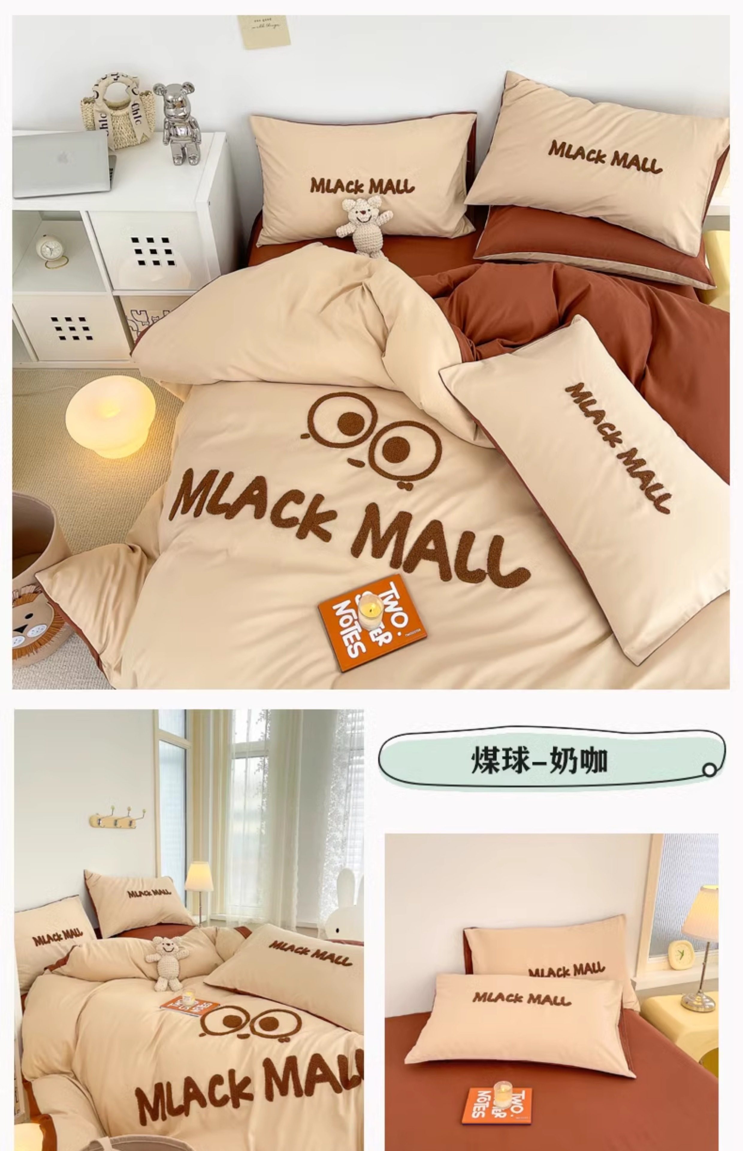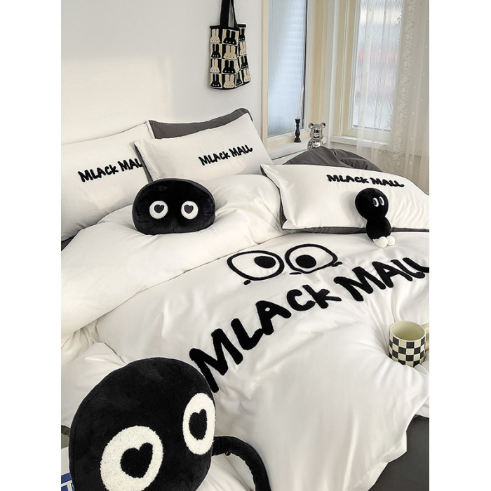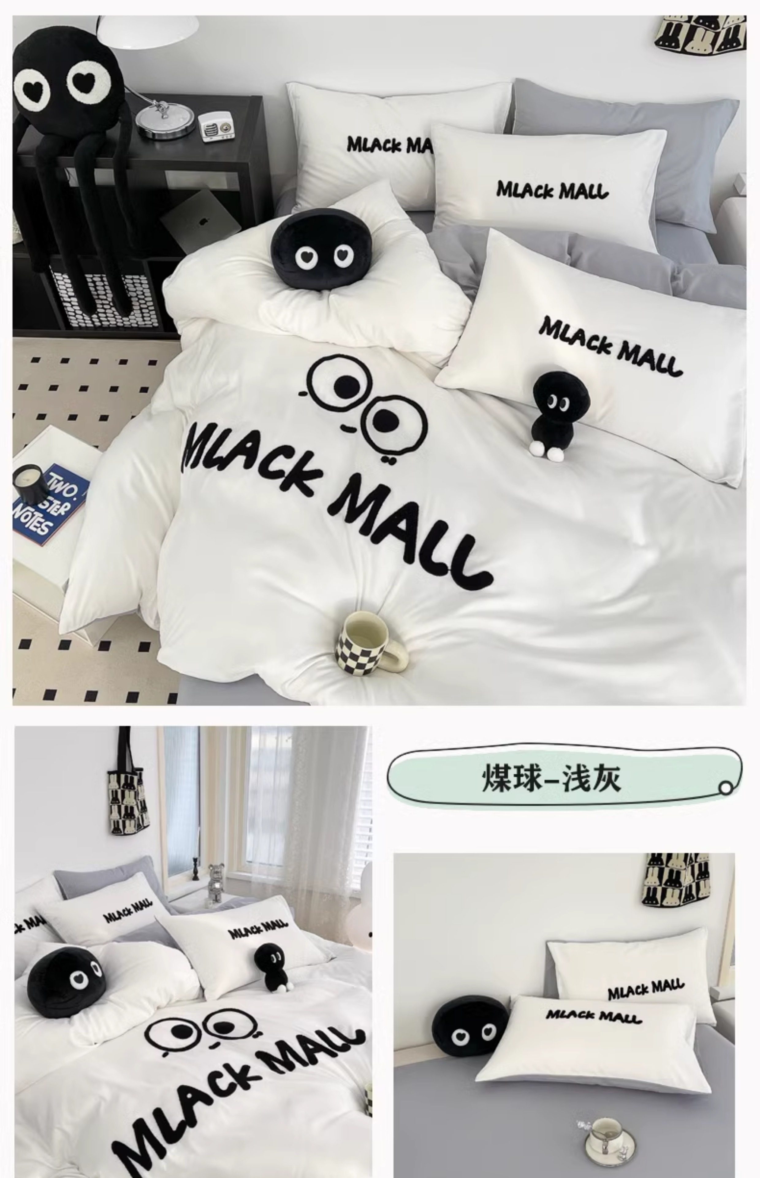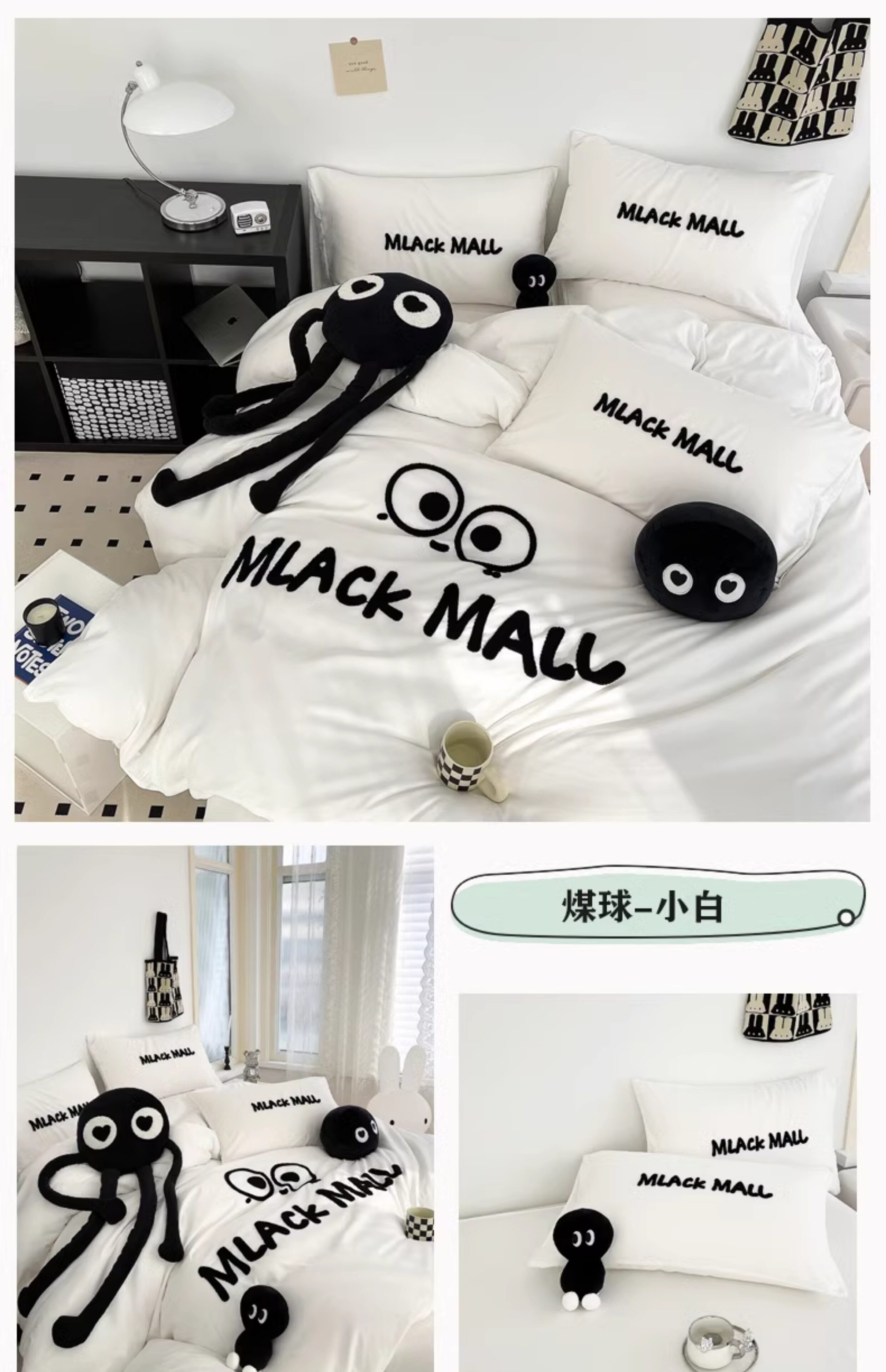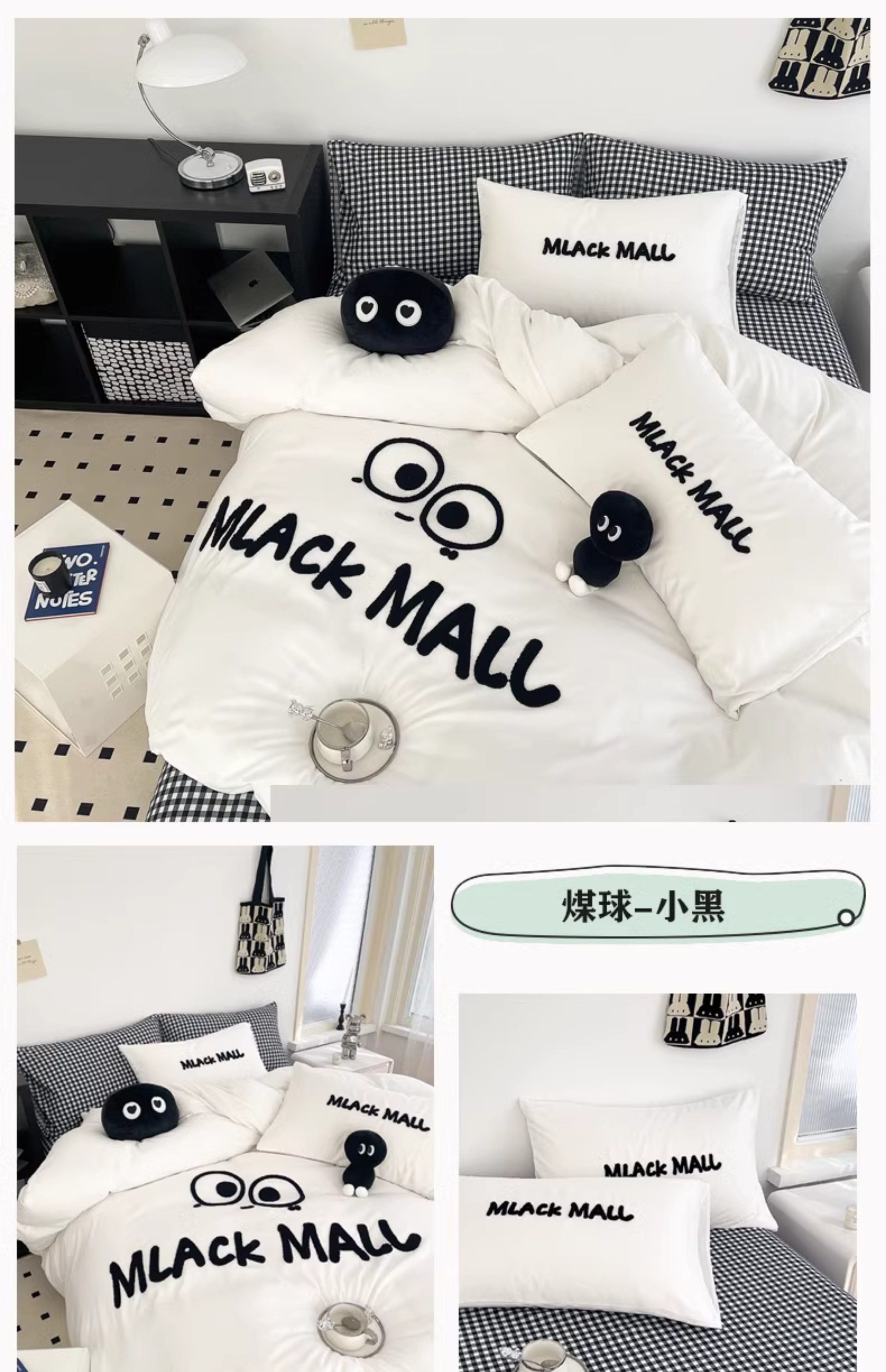 日系風可愛小黑怪黑煤球裸睡水洗棉四件套床包卡通床單宿捨三件套