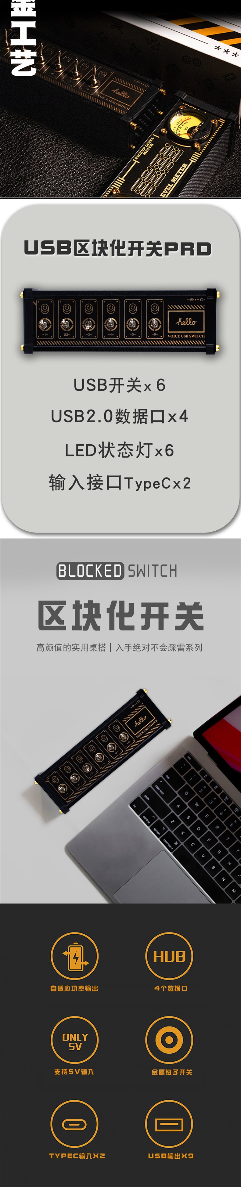 桌面區塊化區塊開關6路桌面排插獨立控製復古鍍金送男友禮物桌搭