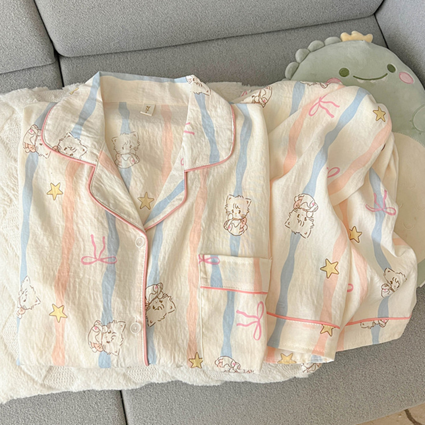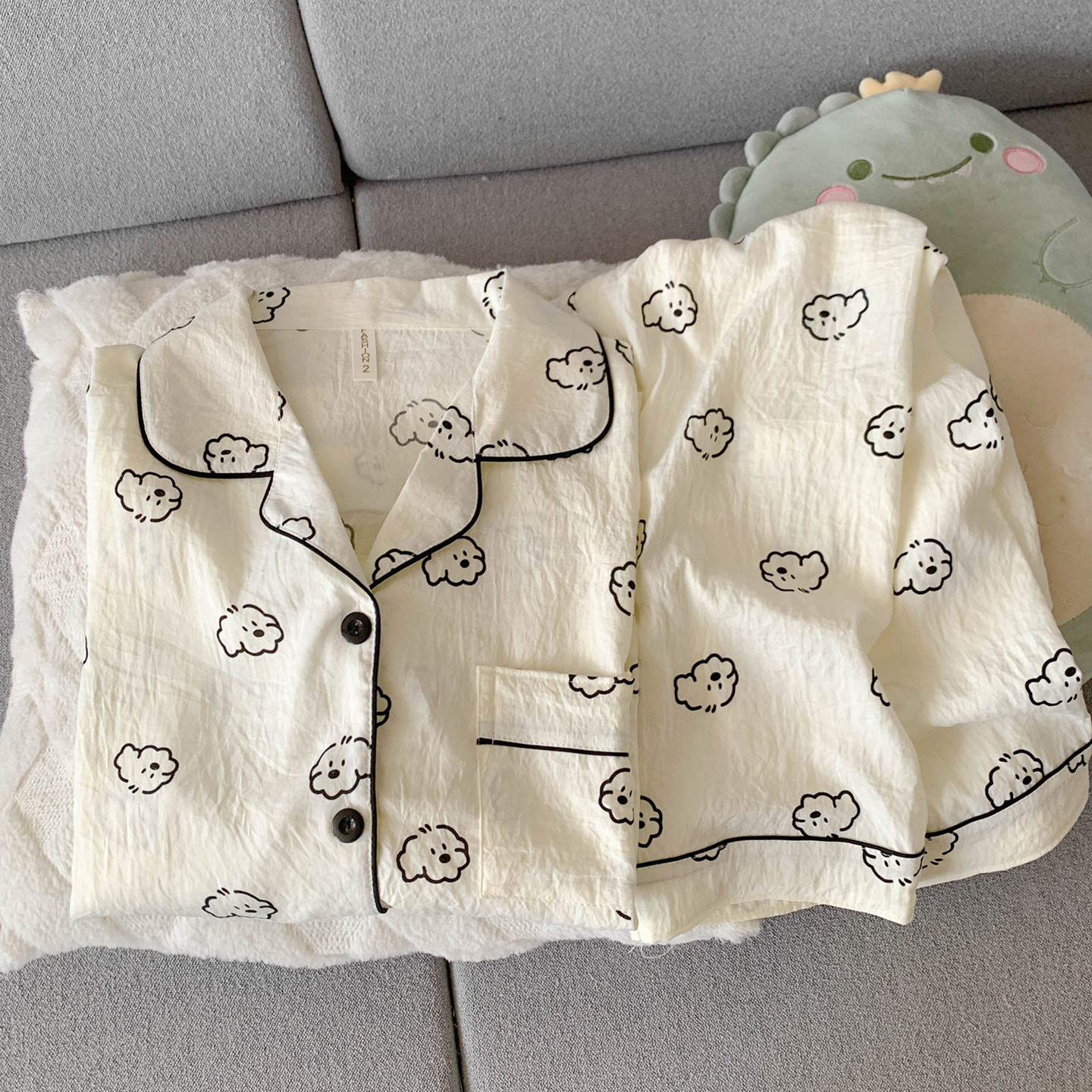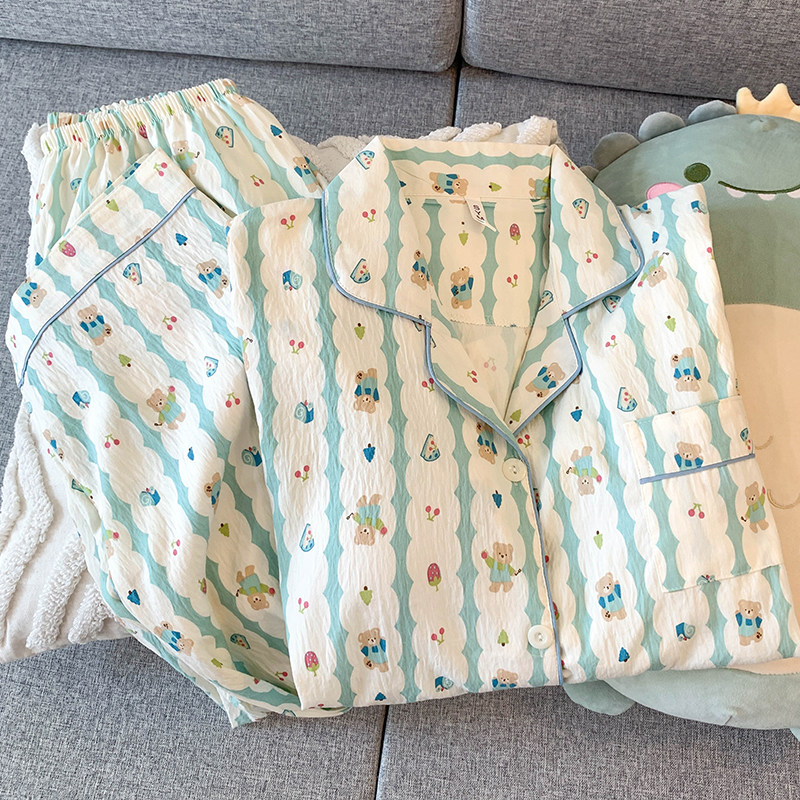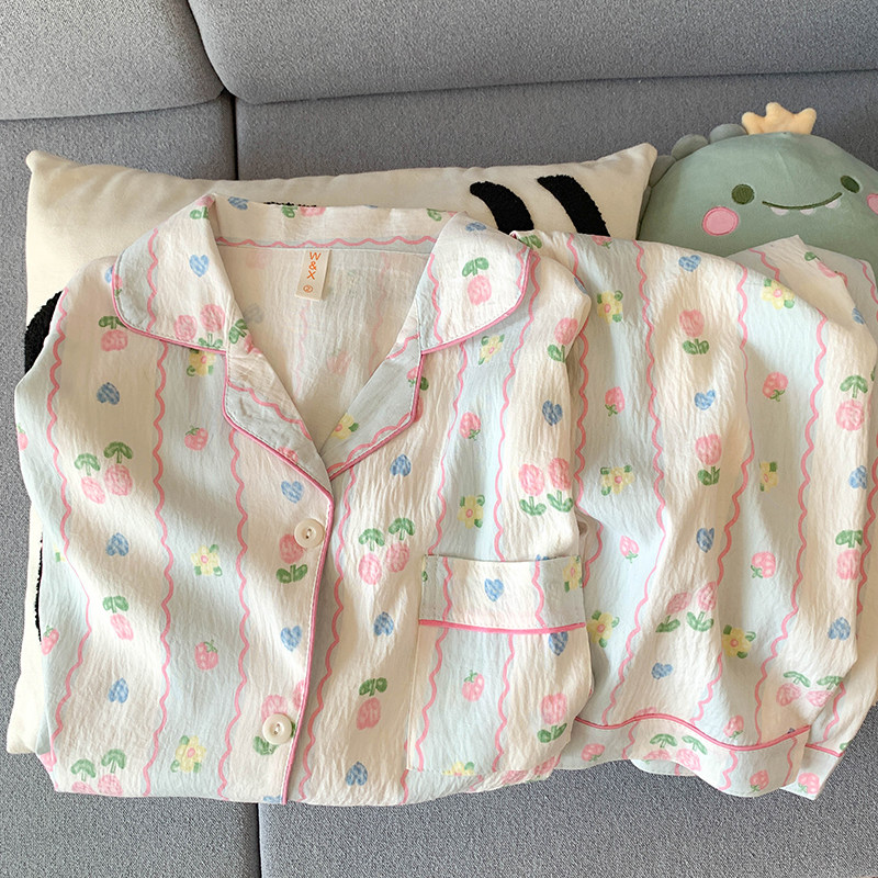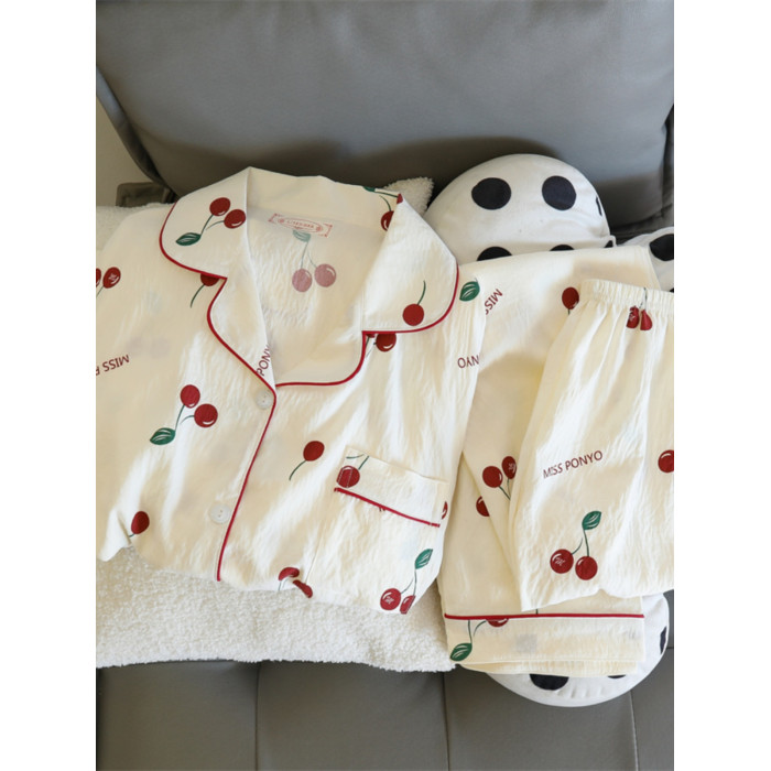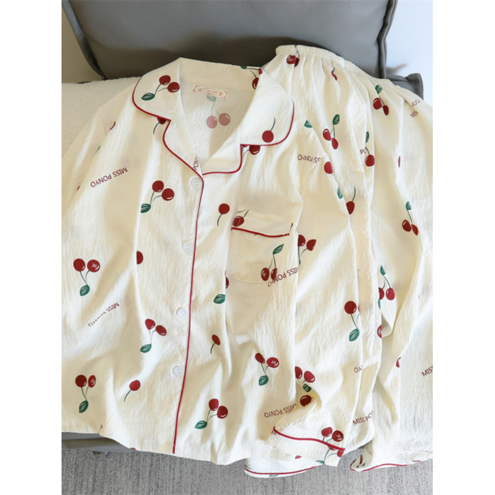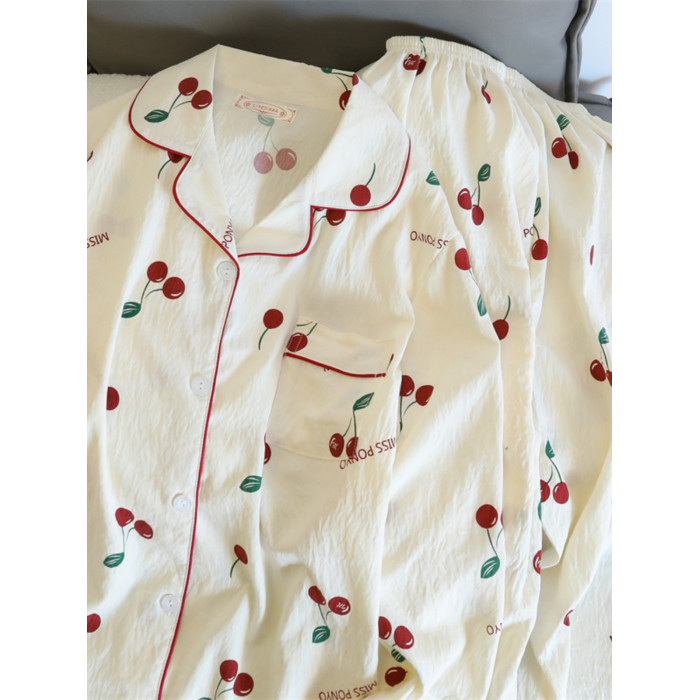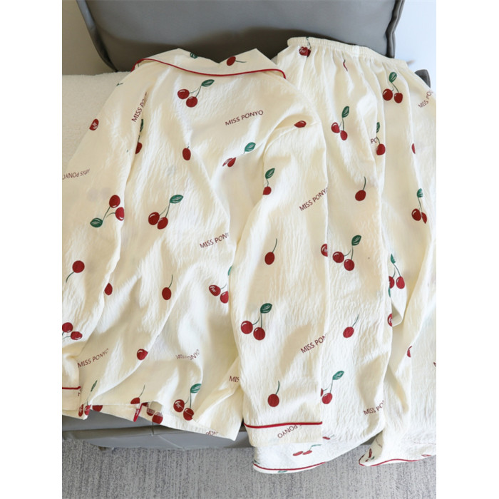 純棉紗布睡衣女長袖長褲春秋款套裝甜美櫻桃可外穿開衫家居服夏季