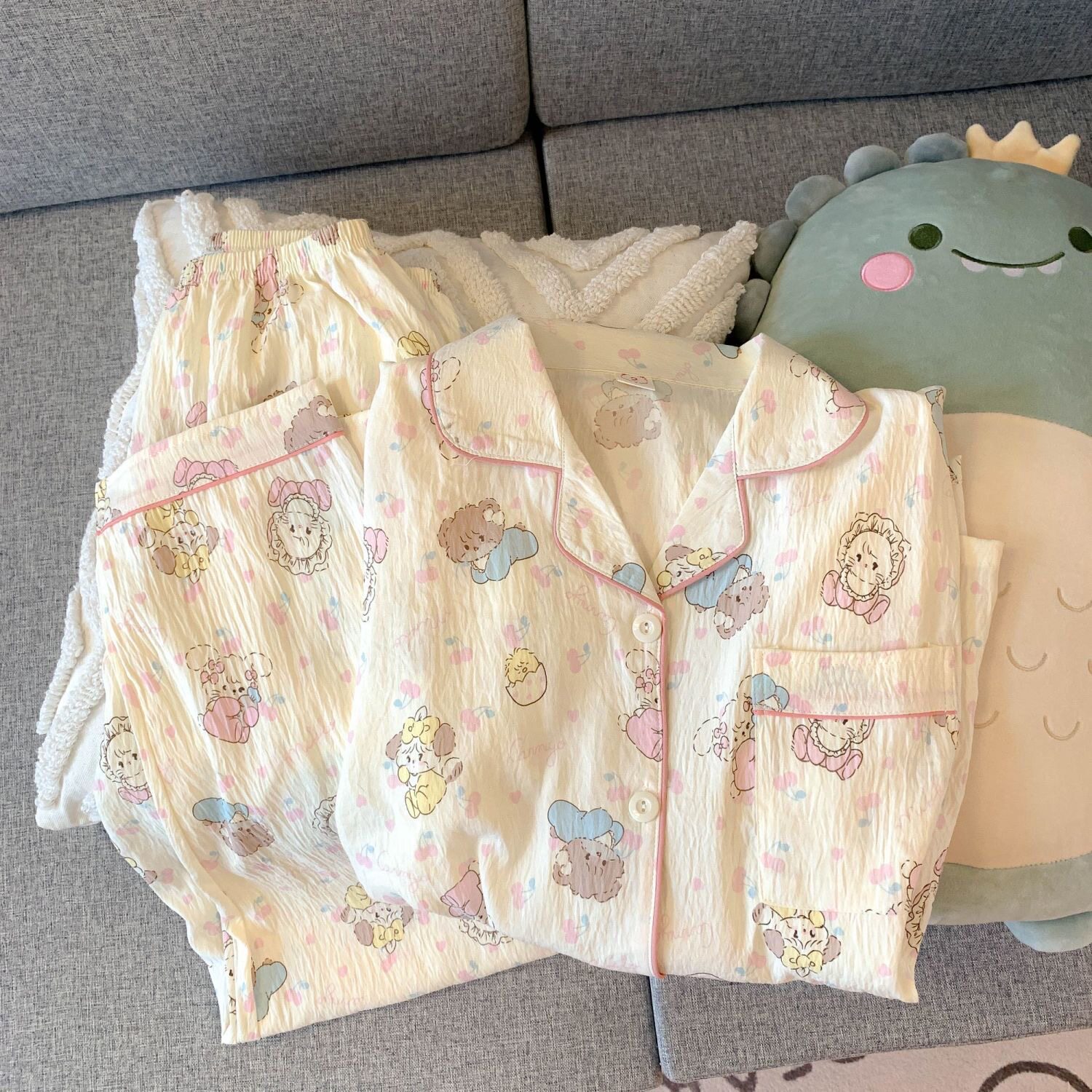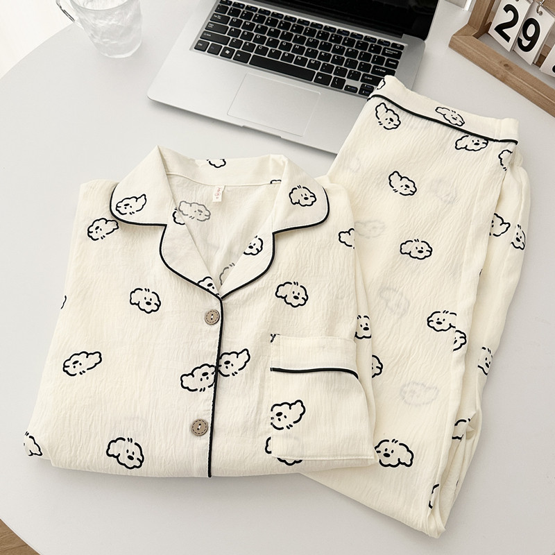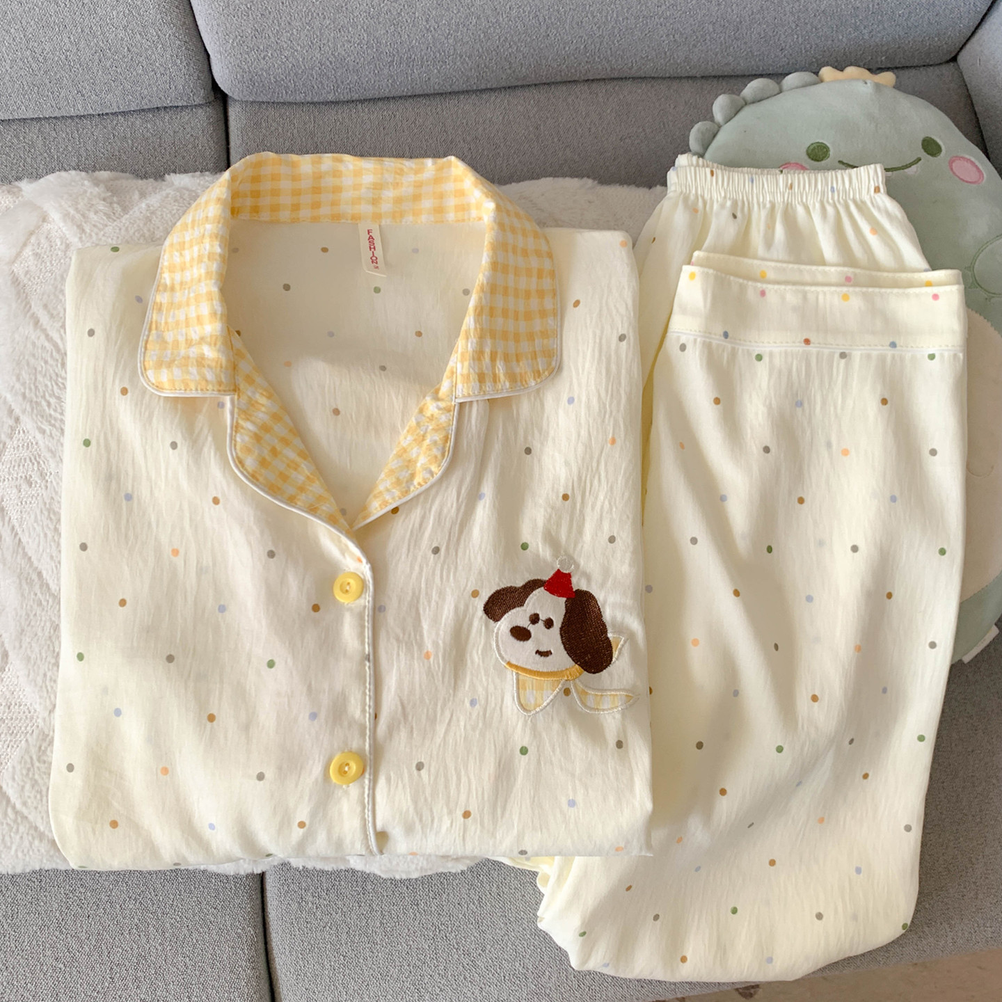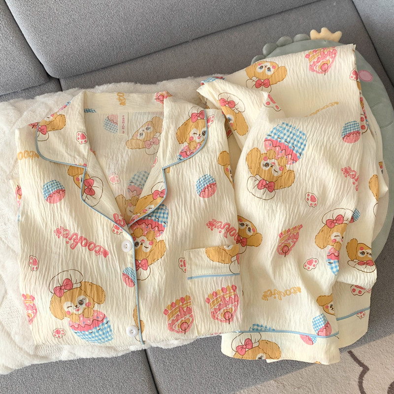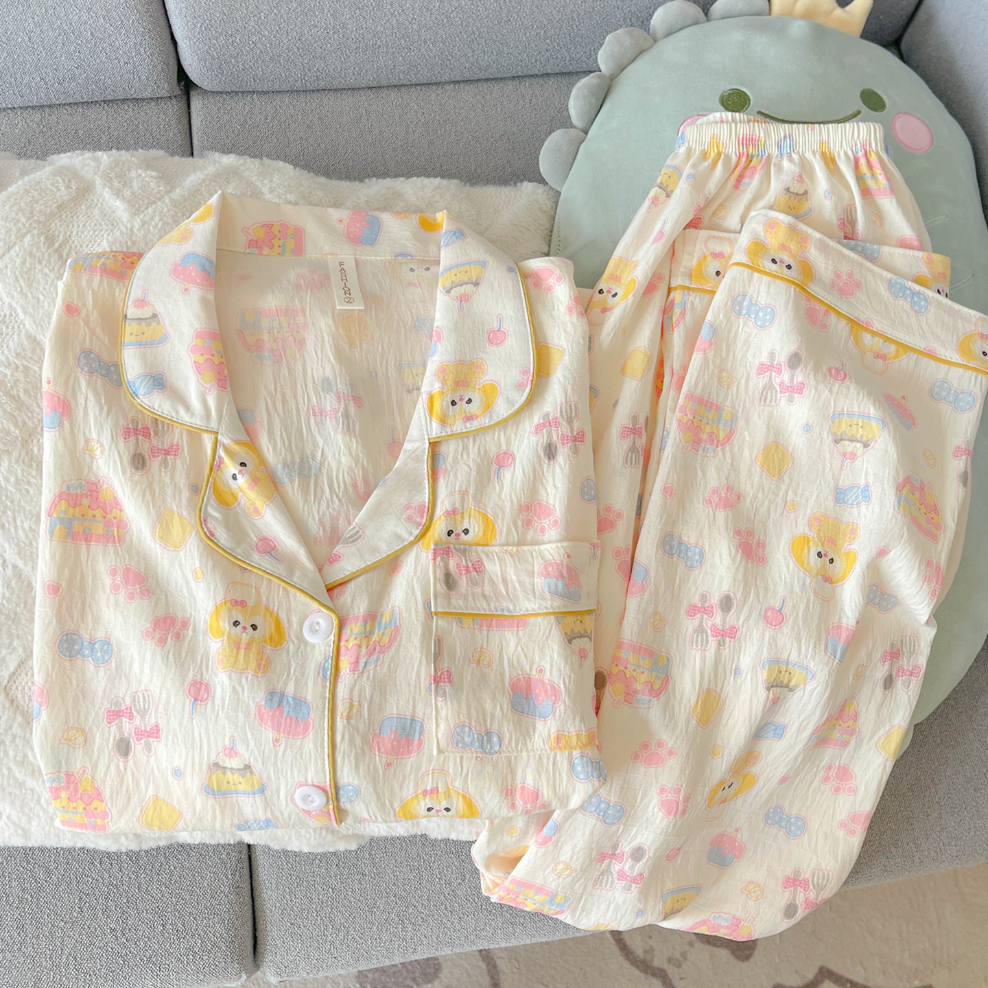 純棉紗布睡衣女長袖長褲春秋款套裝甜美櫻桃可外穿開衫家居服夏季