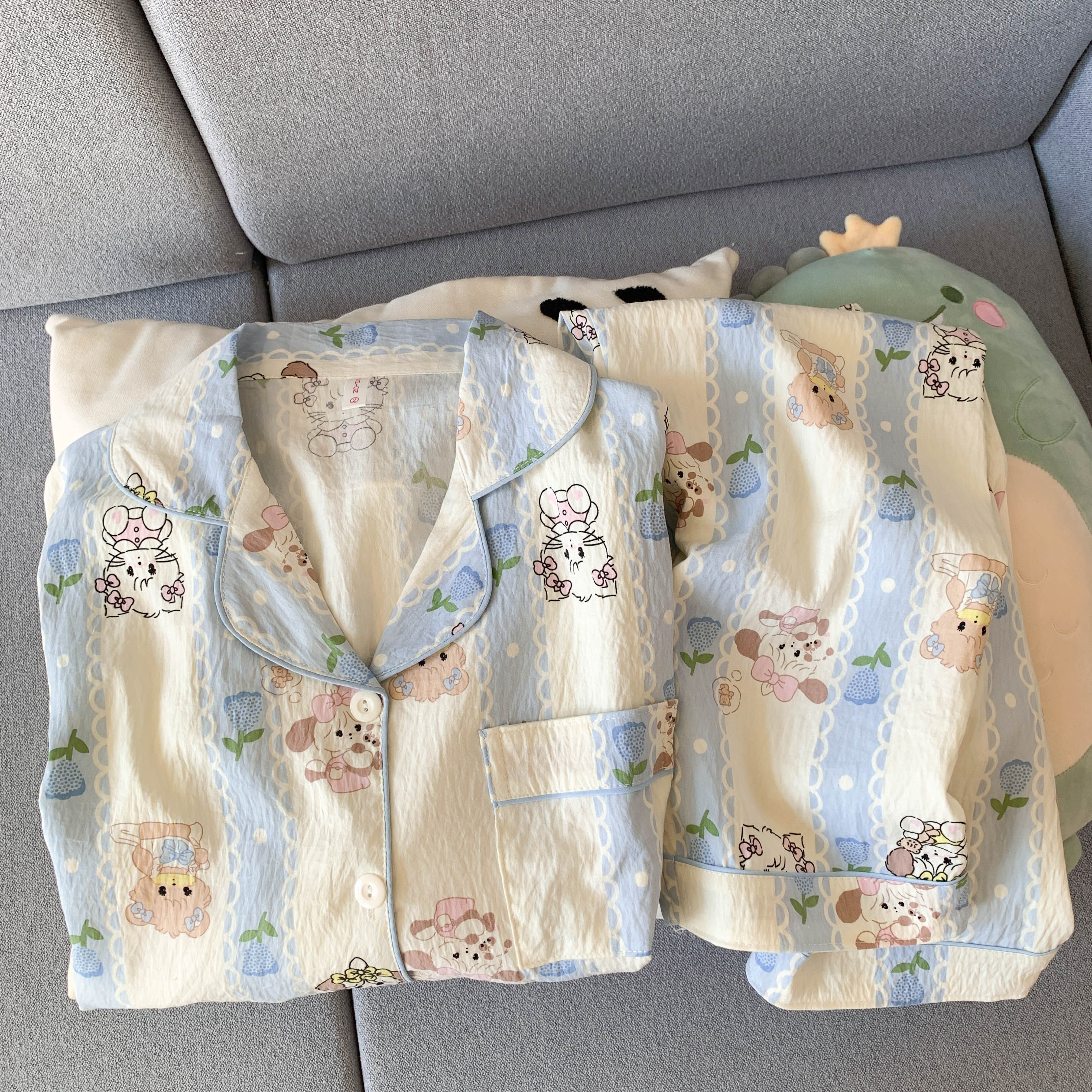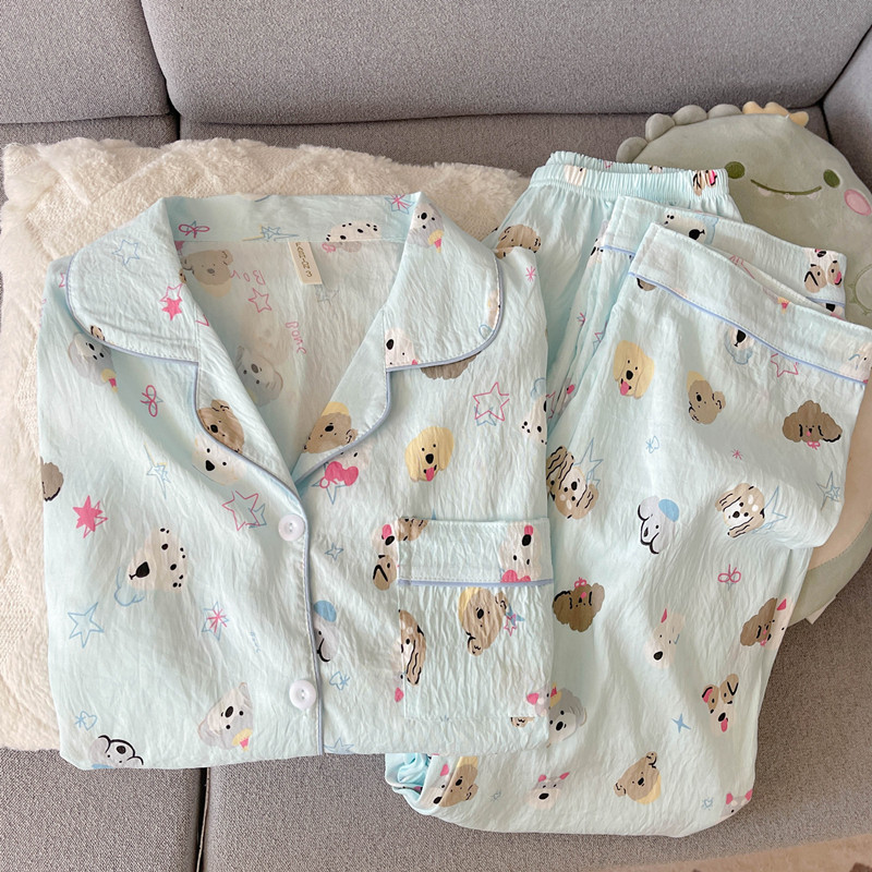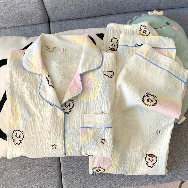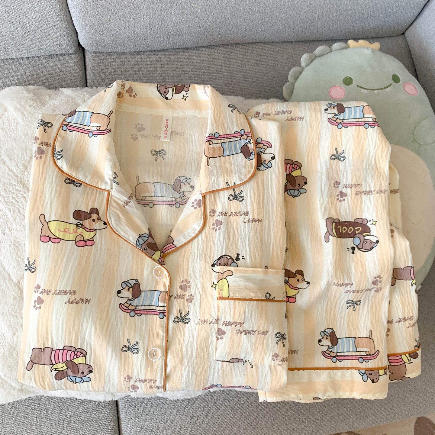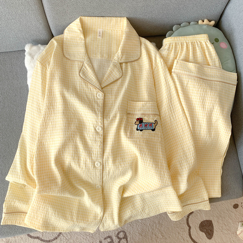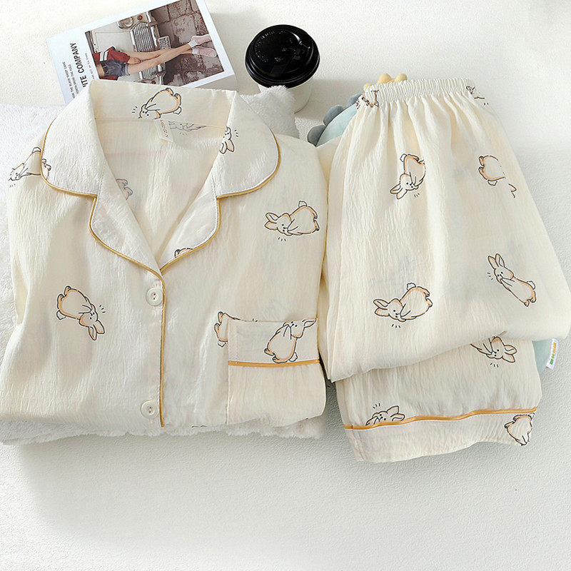 純棉紗布睡衣女長袖長褲春秋款套裝甜美櫻桃可外穿開衫家居服夏季