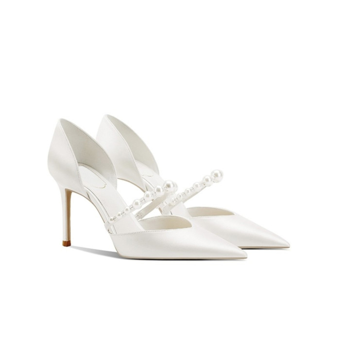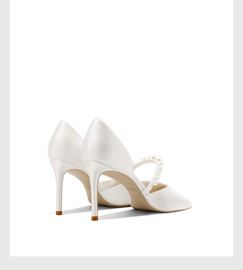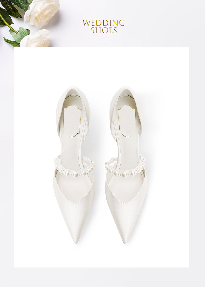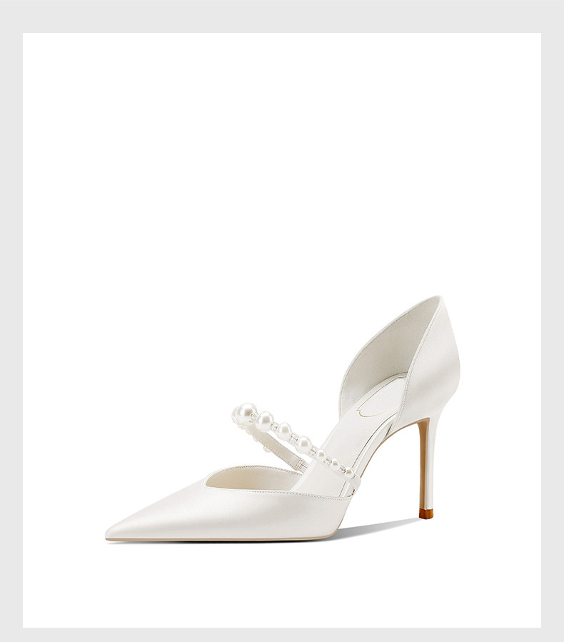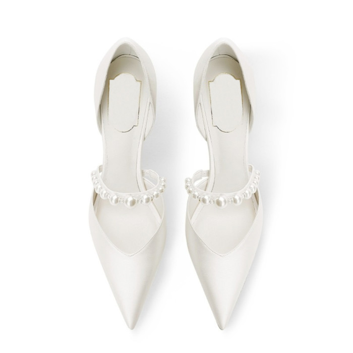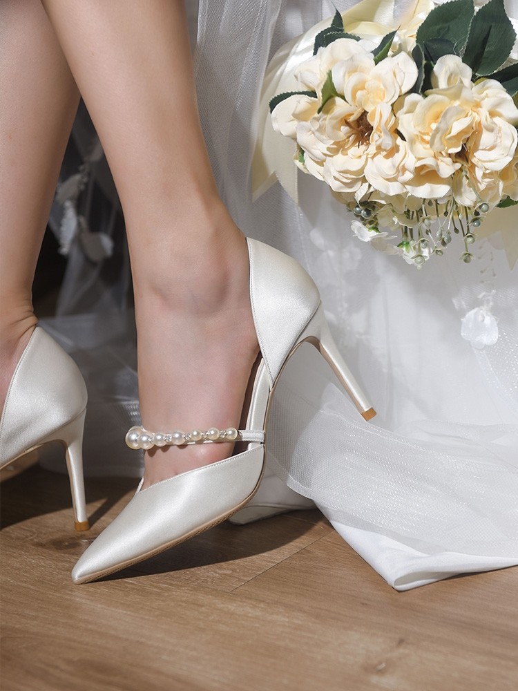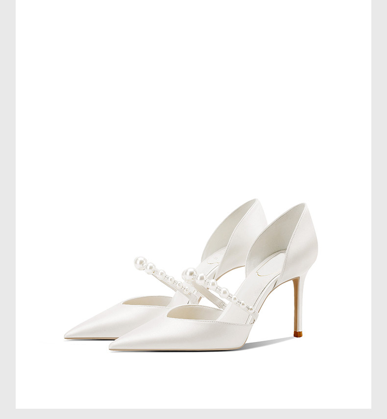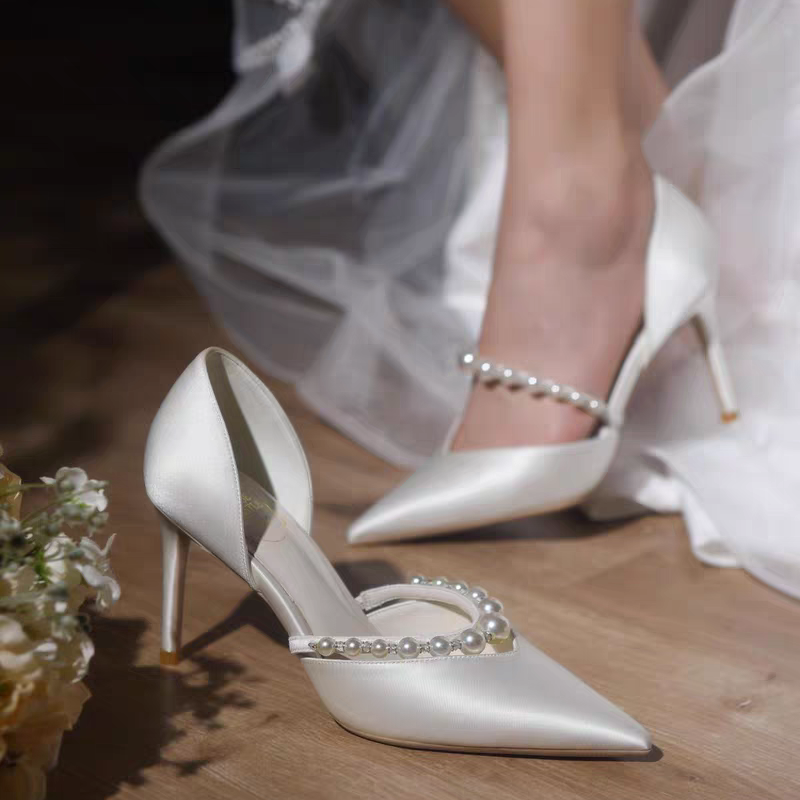 婚宴鞋女2025年新款白色綢緞面細高跟鞋中空絆帶氣質新娘禮服單鞋
