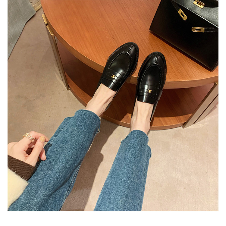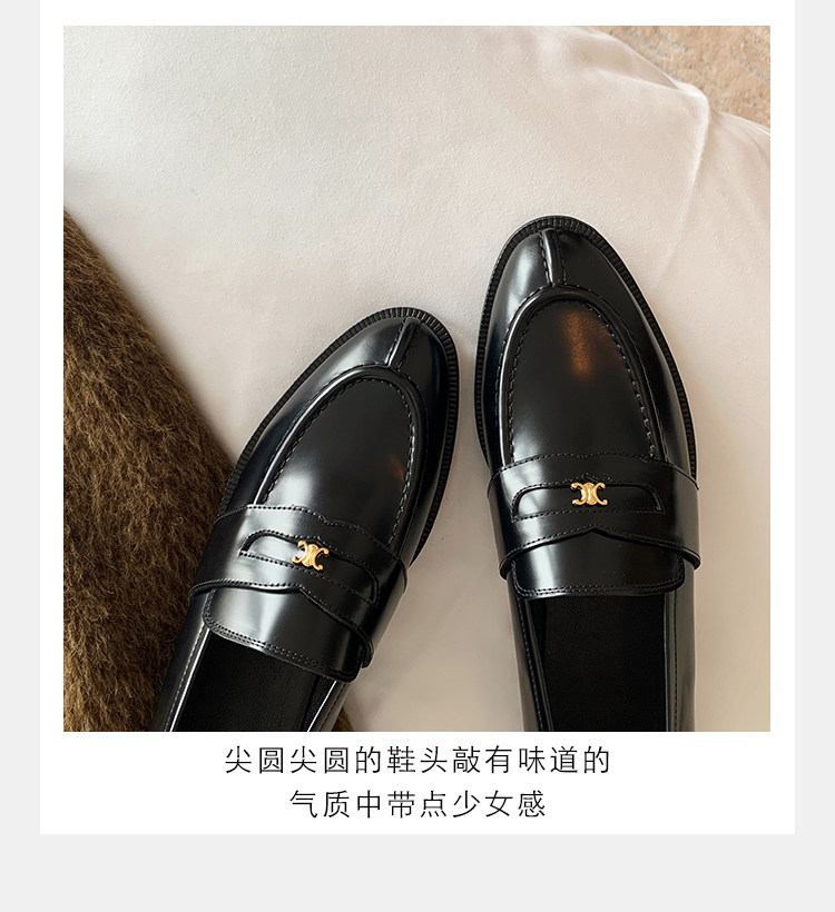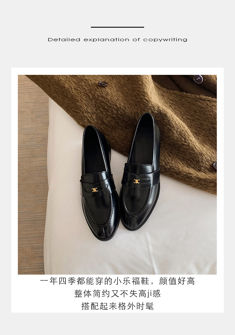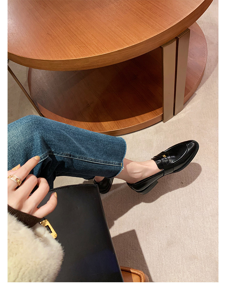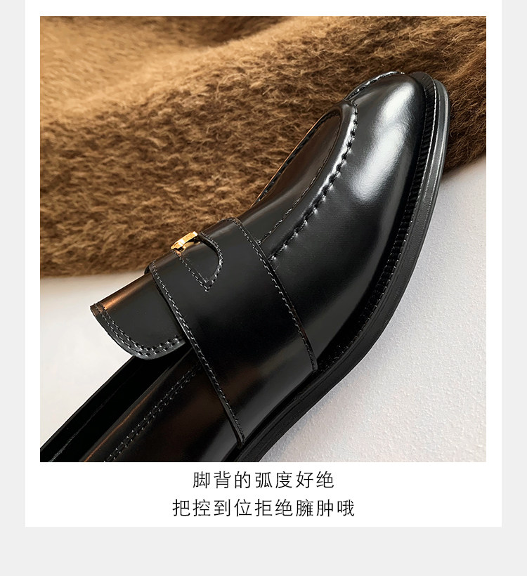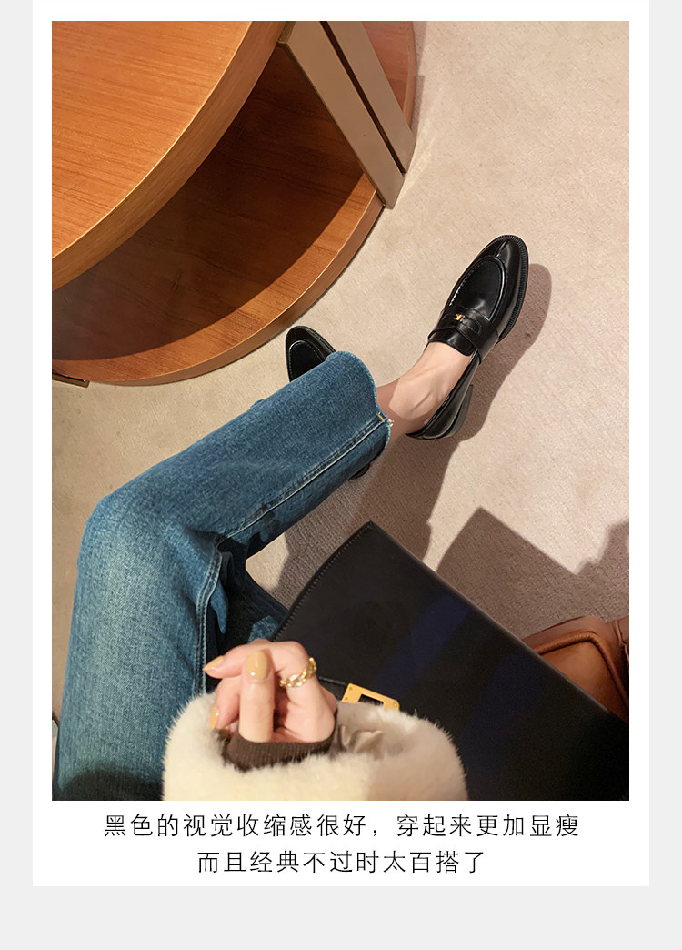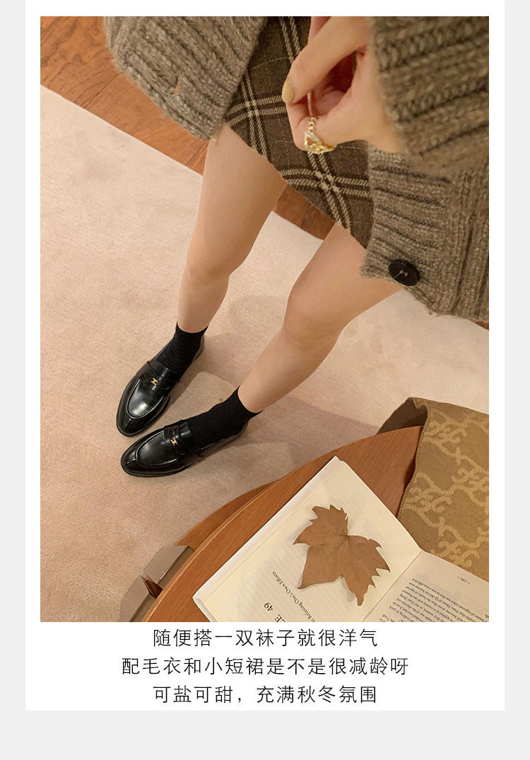 全牛皮~復古風小金釦真皮樂福鞋女圓頭平底單鞋一腳蹬粗跟小皮鞋