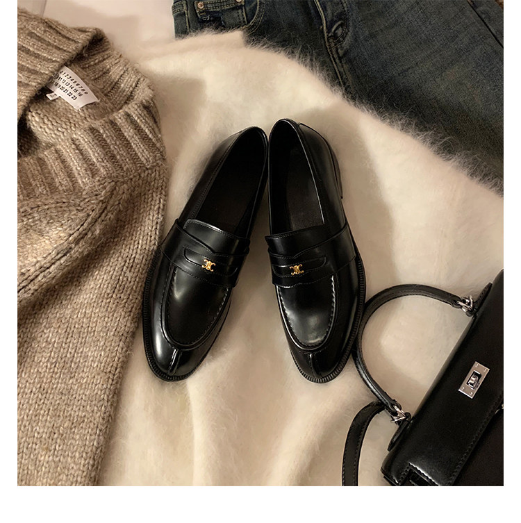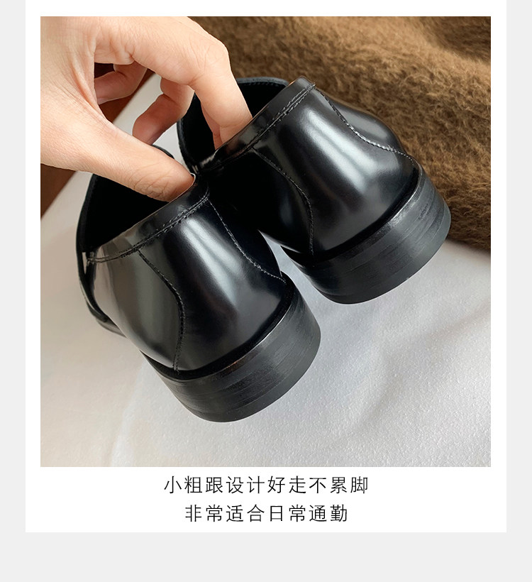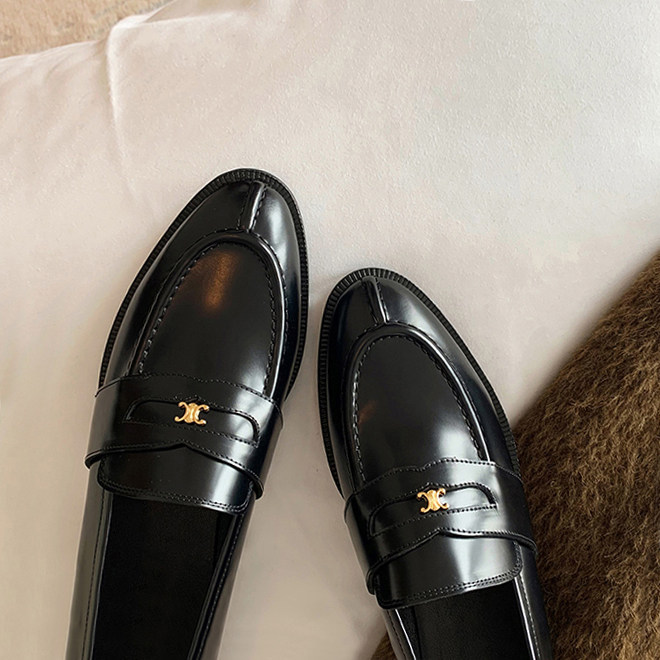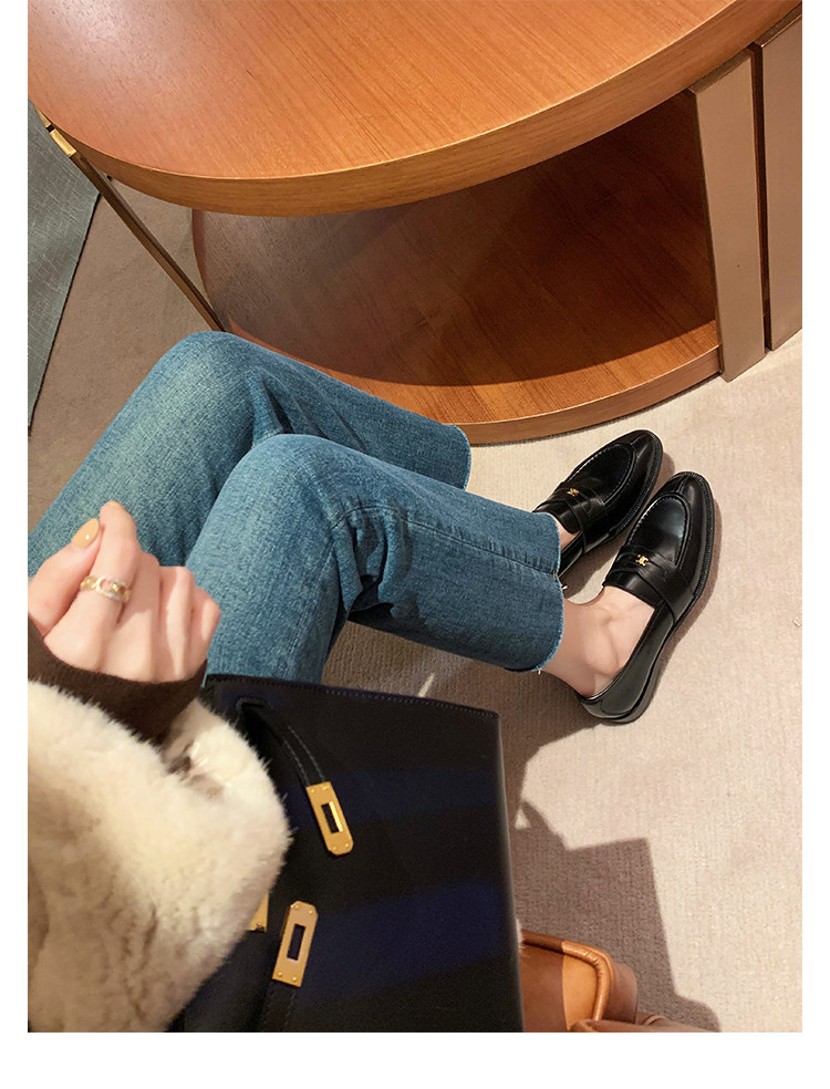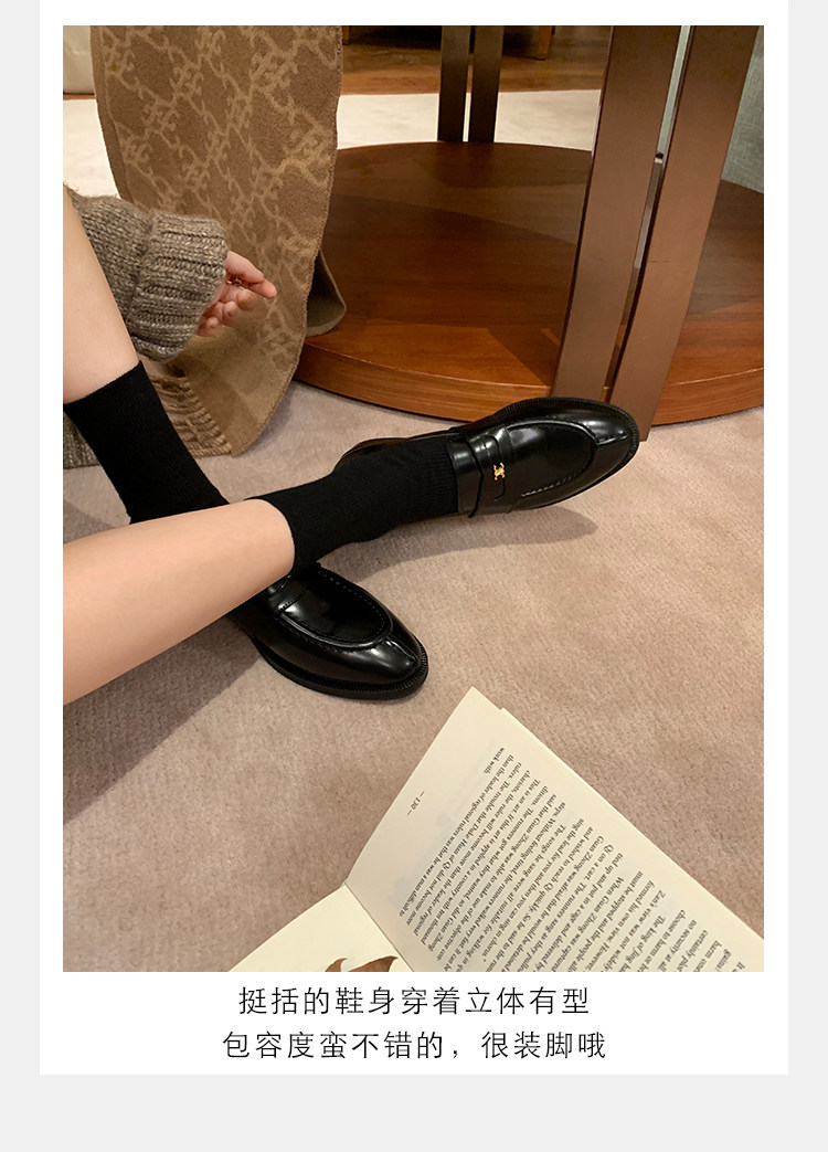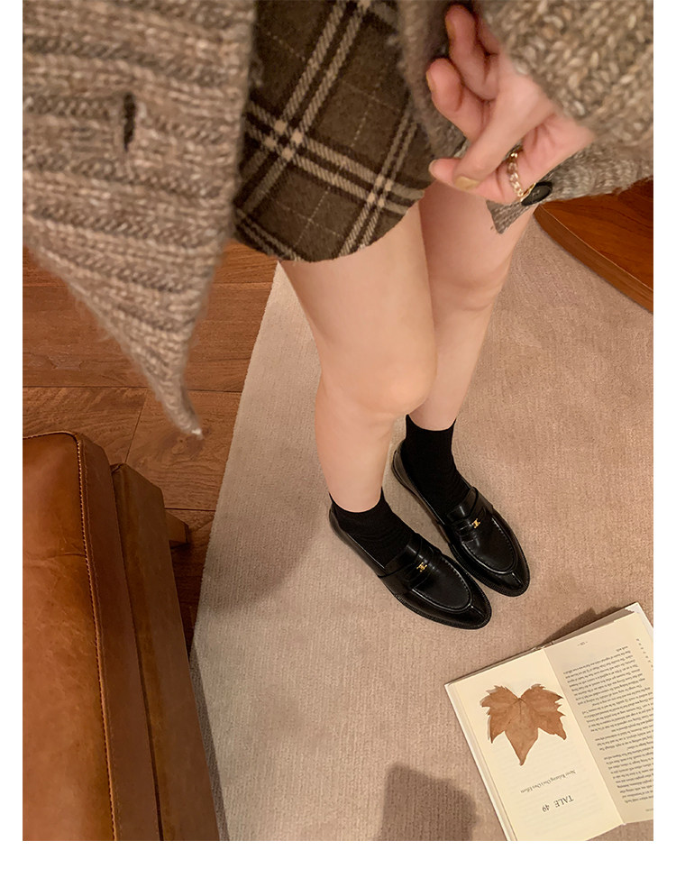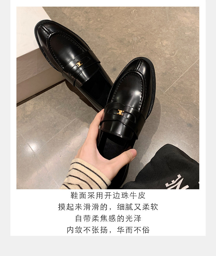 全牛皮~復古風小金釦真皮樂福鞋女圓頭平底單鞋一腳蹬粗跟小皮鞋