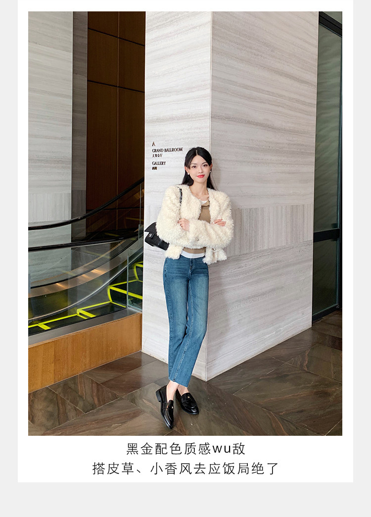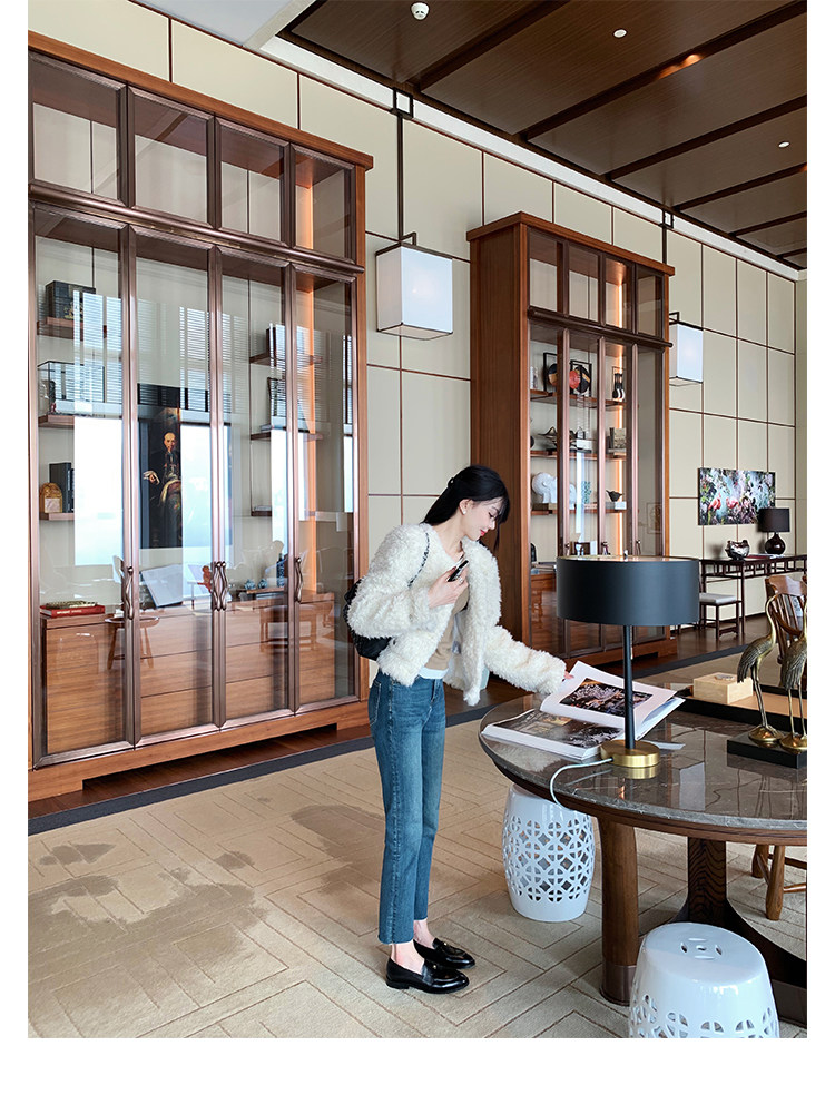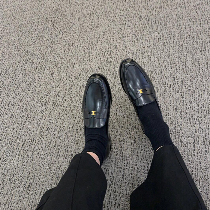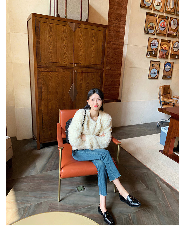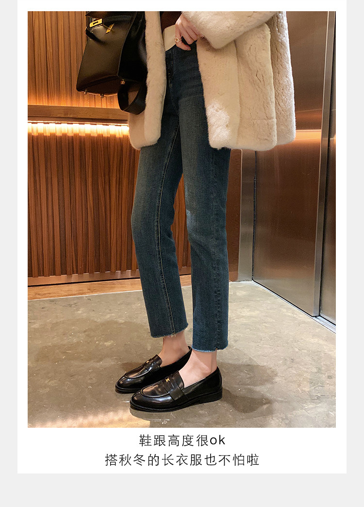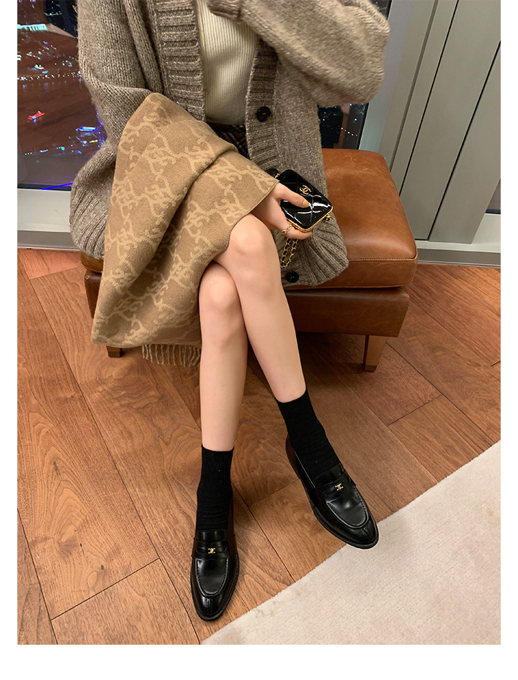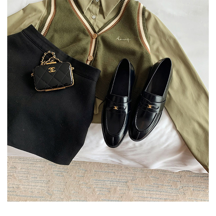 全牛皮~復古風小金釦真皮樂福鞋女圓頭平底單鞋一腳蹬粗跟小皮鞋