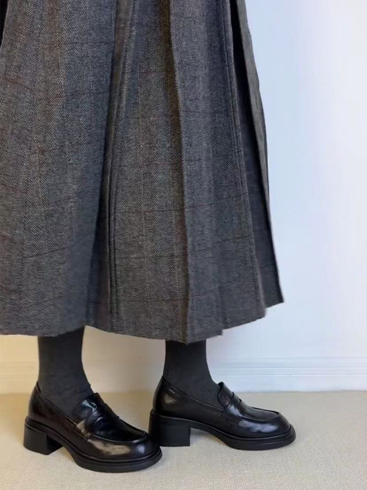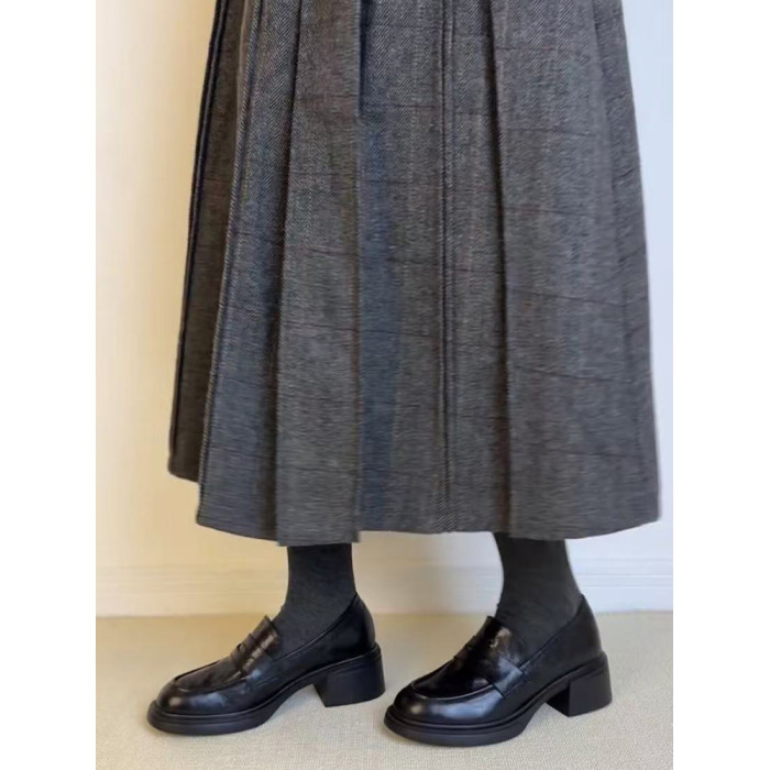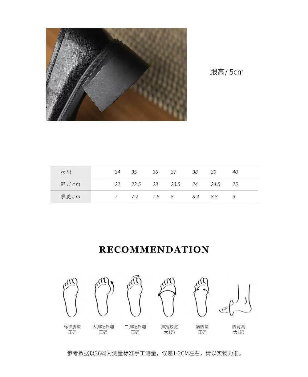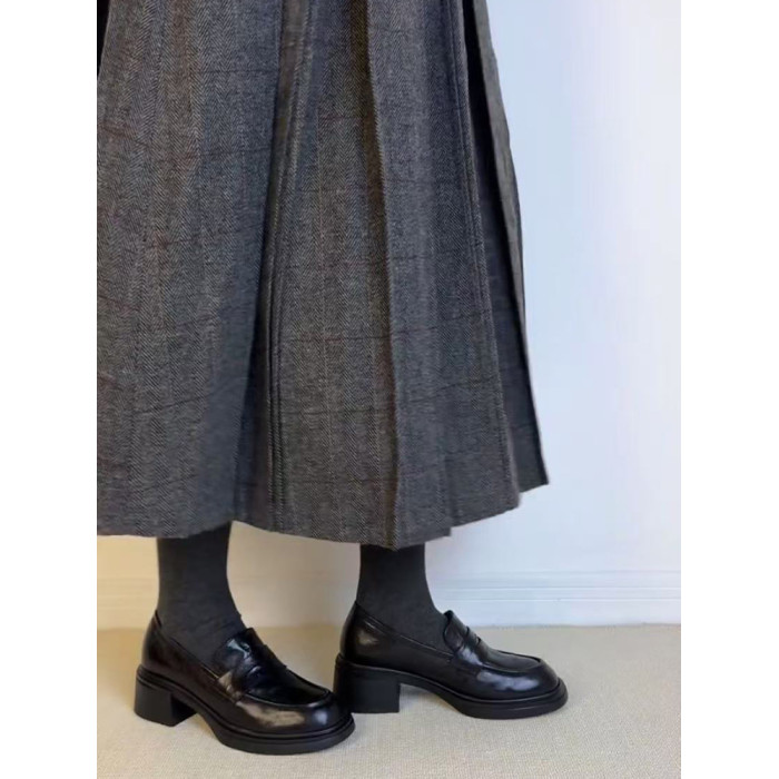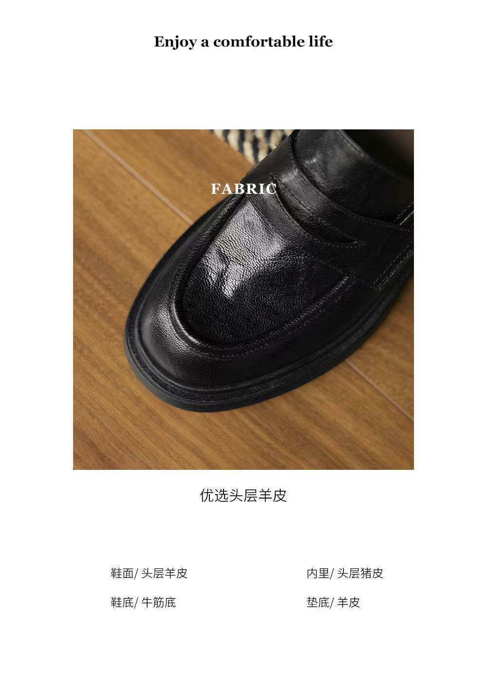 羊皮~復古通勤真皮圓頭厚底粗跟樂福鞋女黑色氣質小皮鞋中跟單鞋