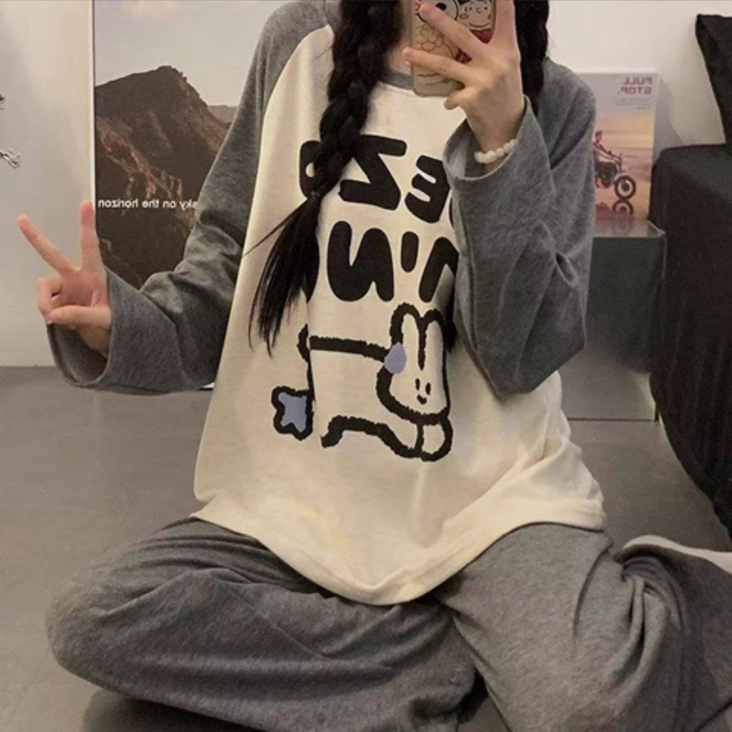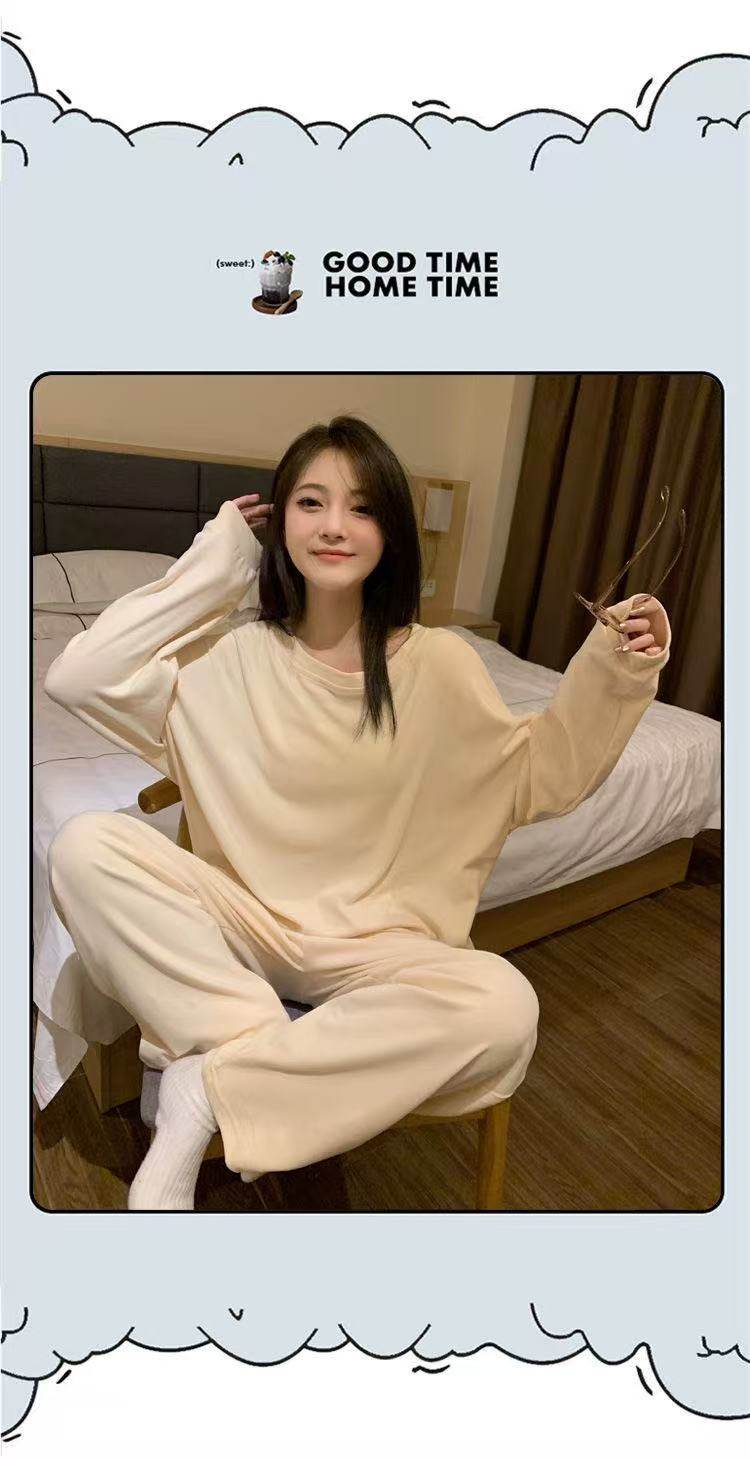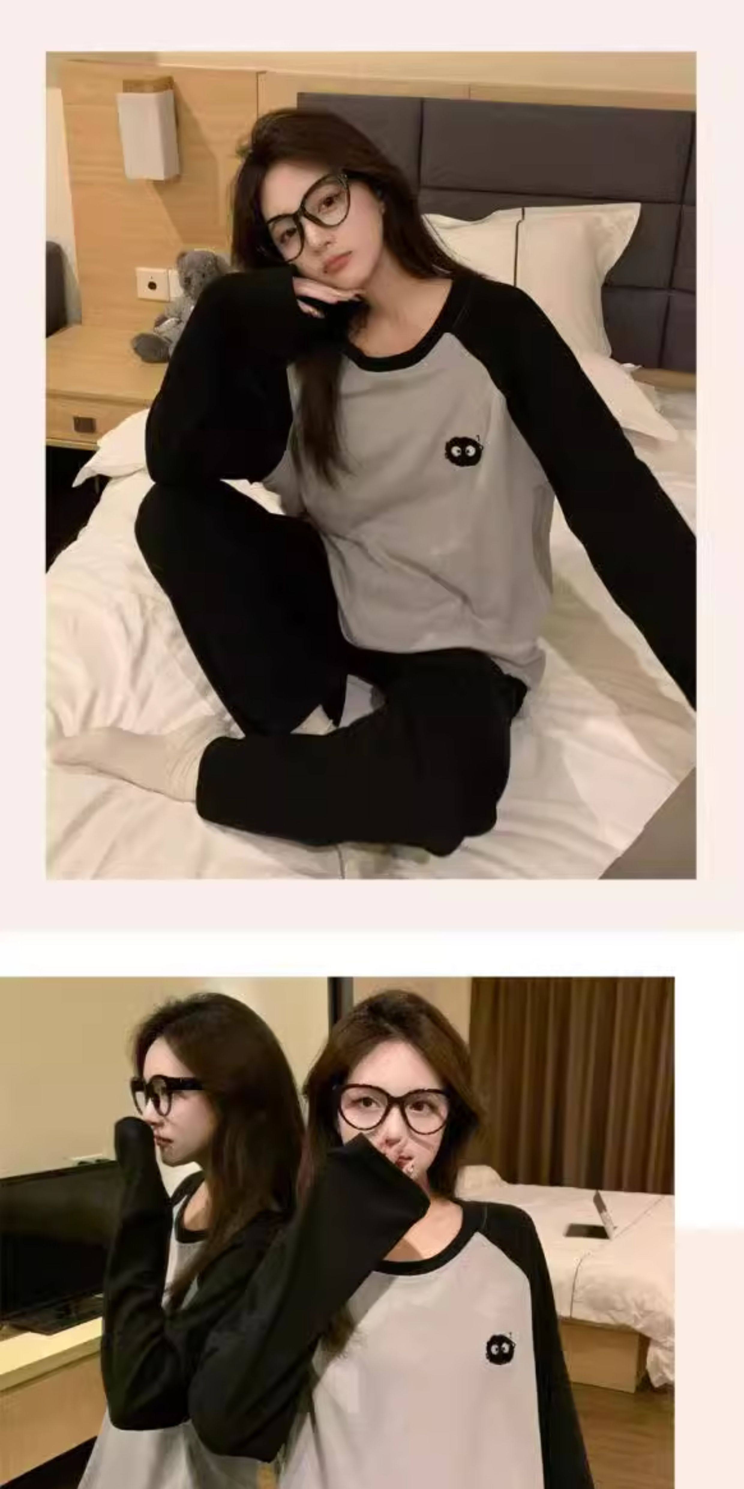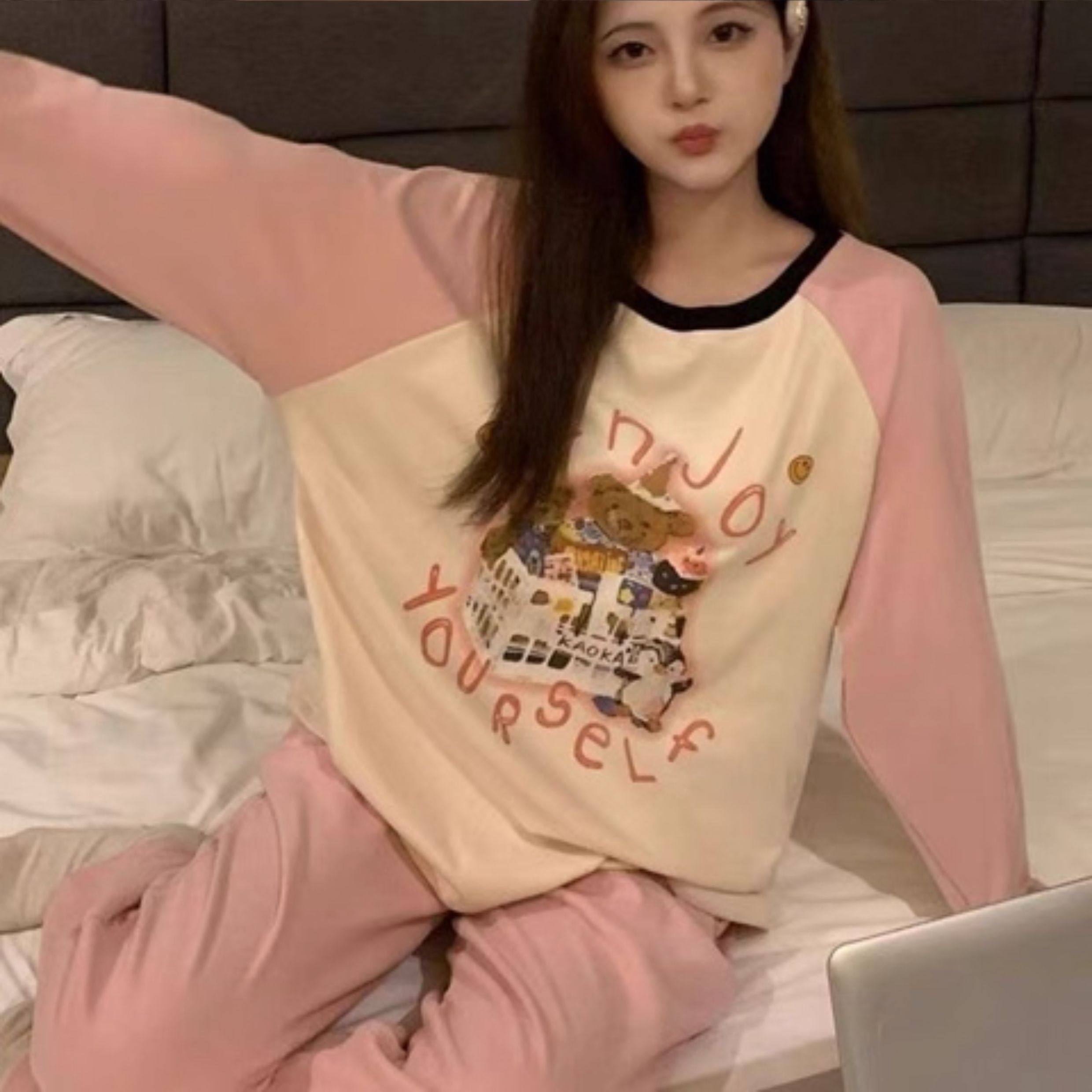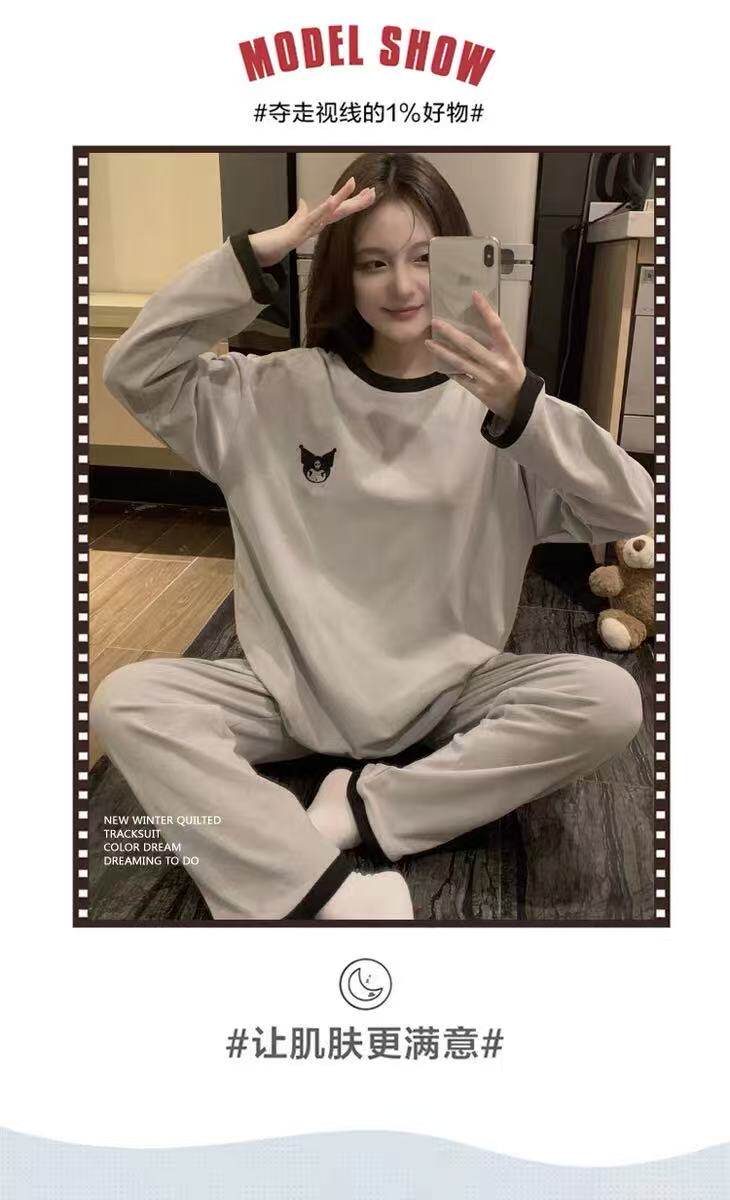 撞色圓領德絨睡衣套裝女春秋長袖長褲寬鬆休閒冬季卡通刺綉家居服