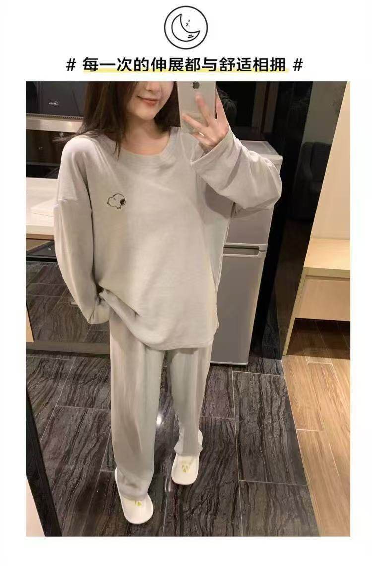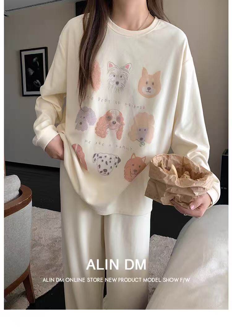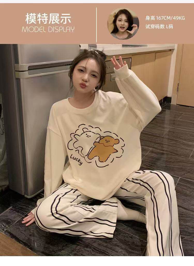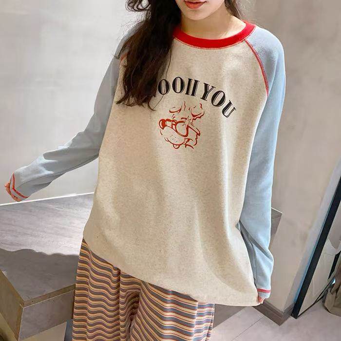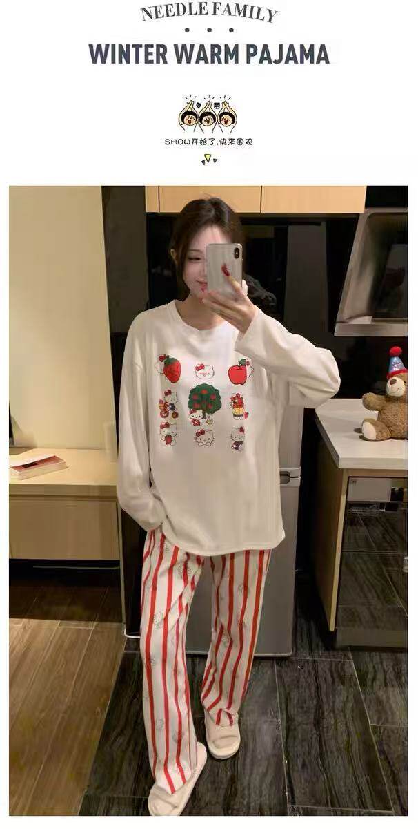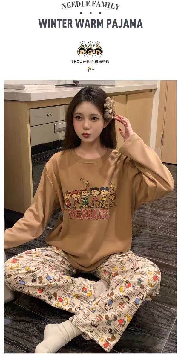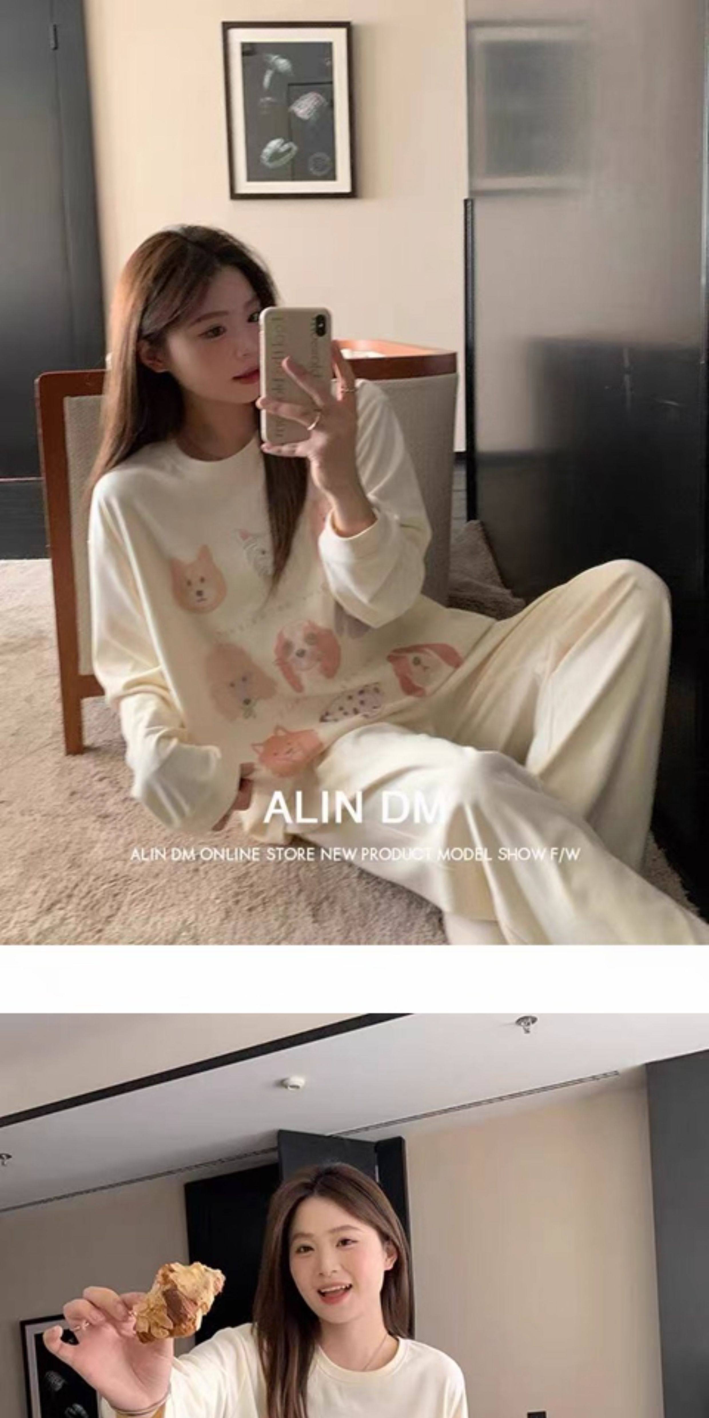 撞色圓領德絨睡衣套裝女春秋長袖長褲寬鬆休閒冬季卡通刺綉家居服