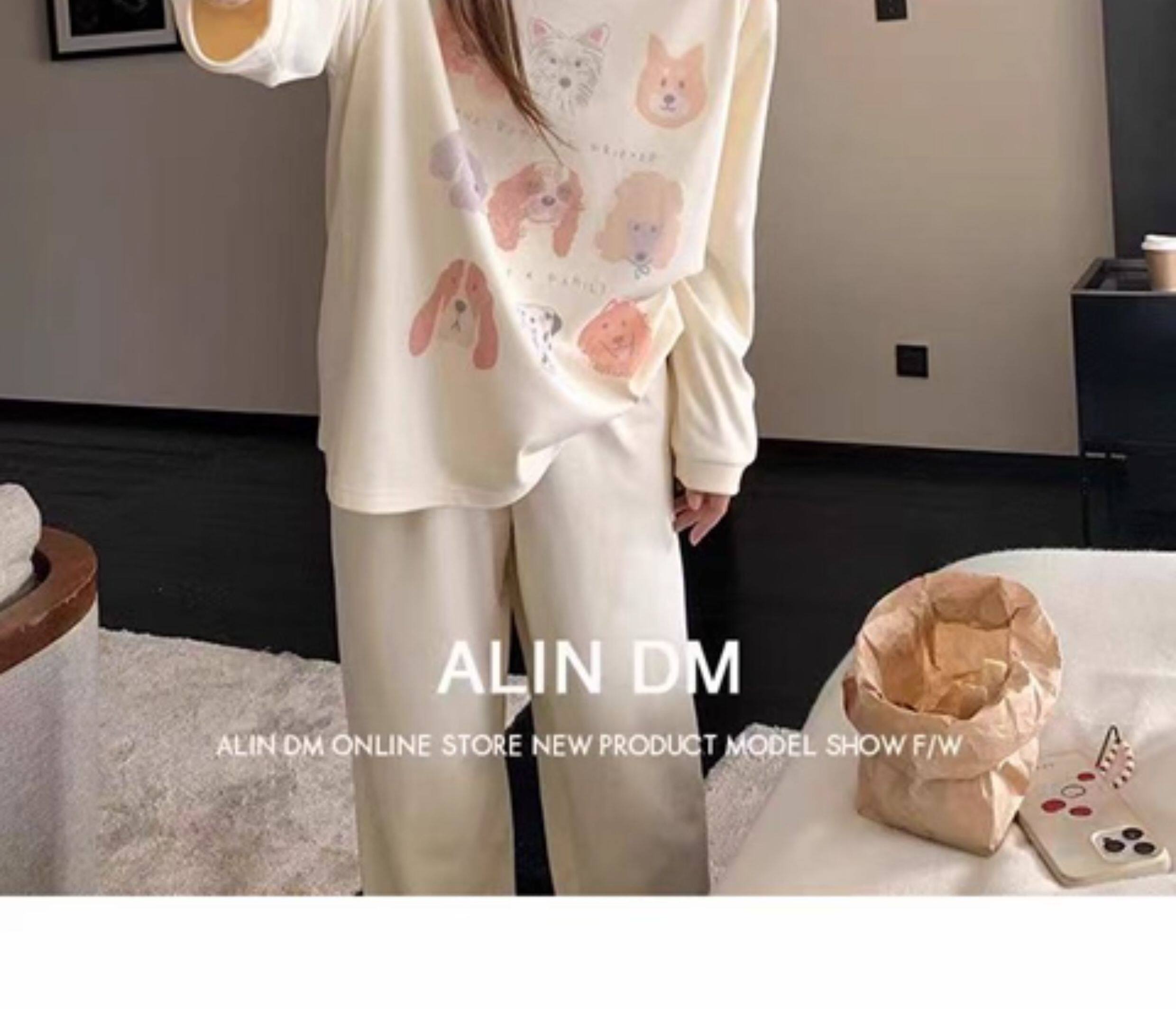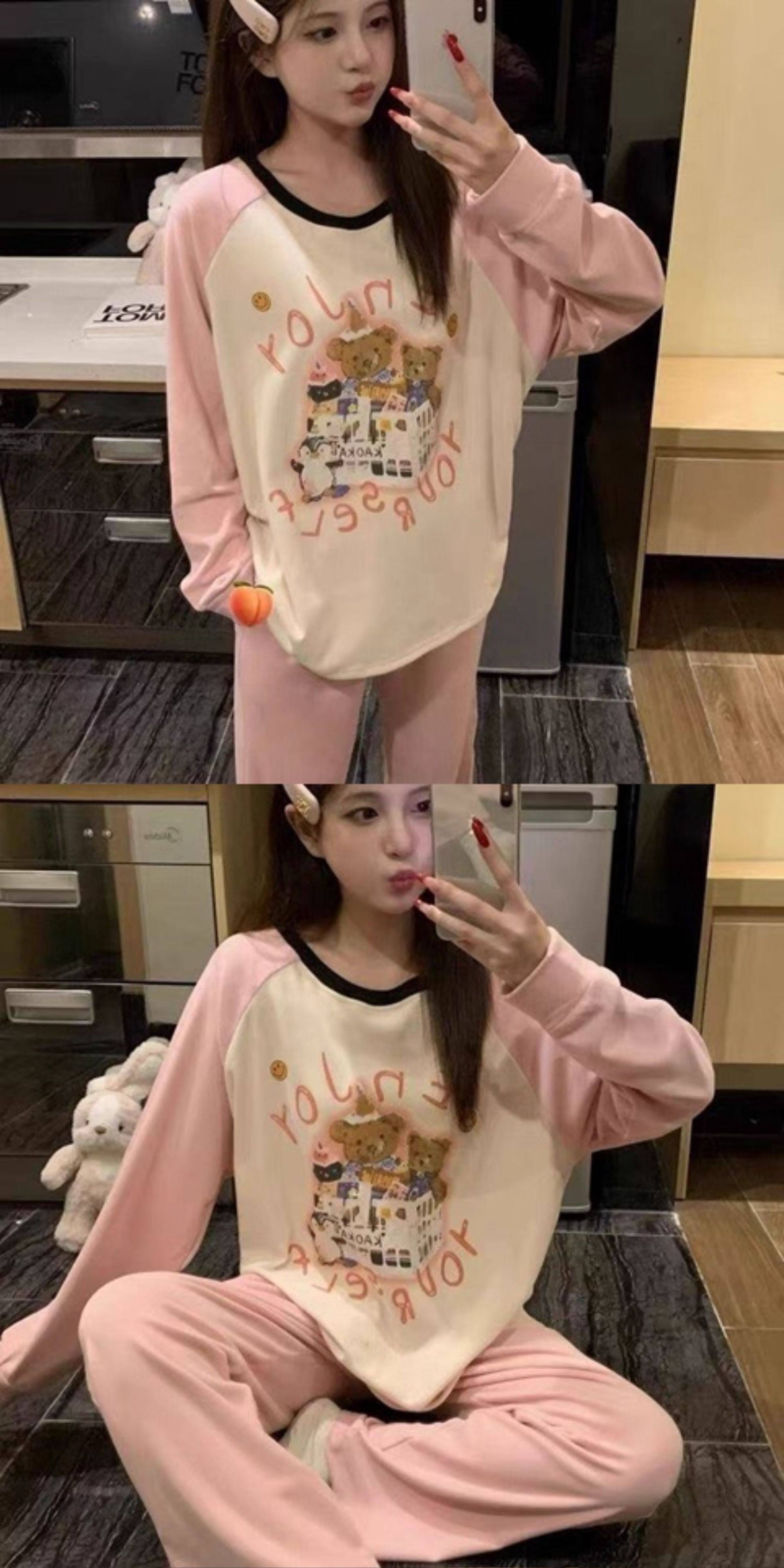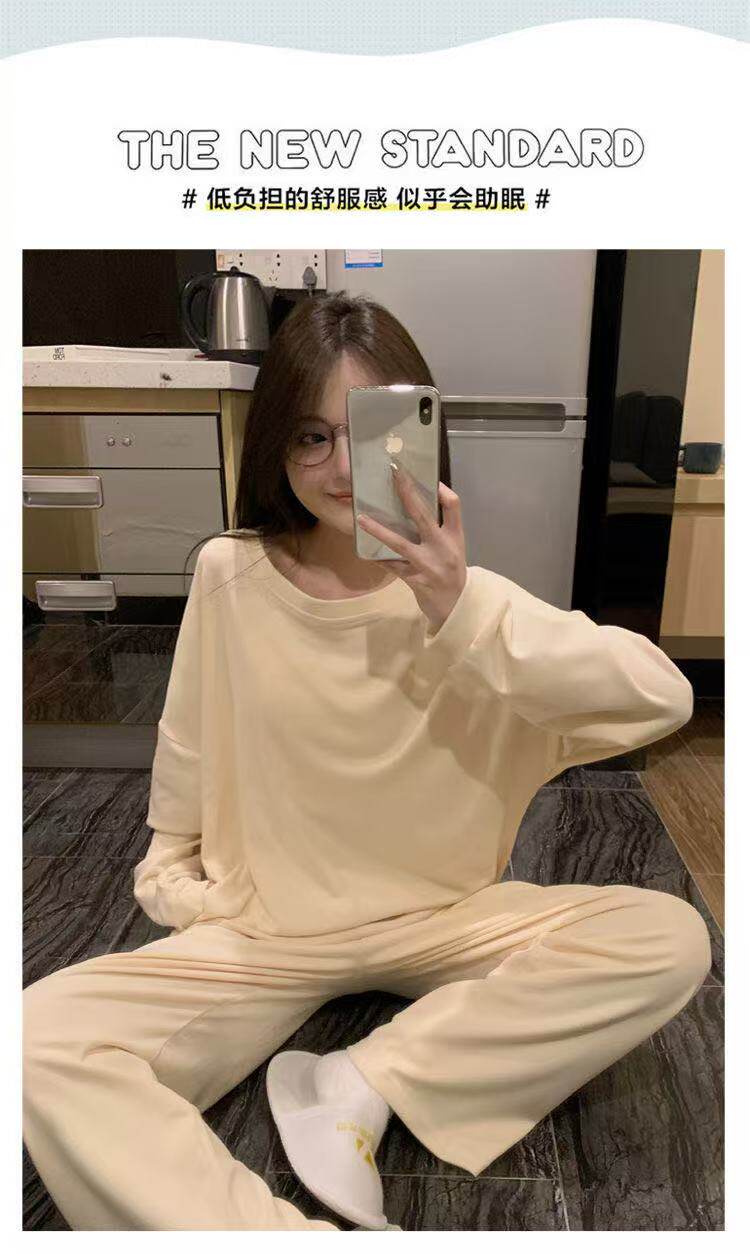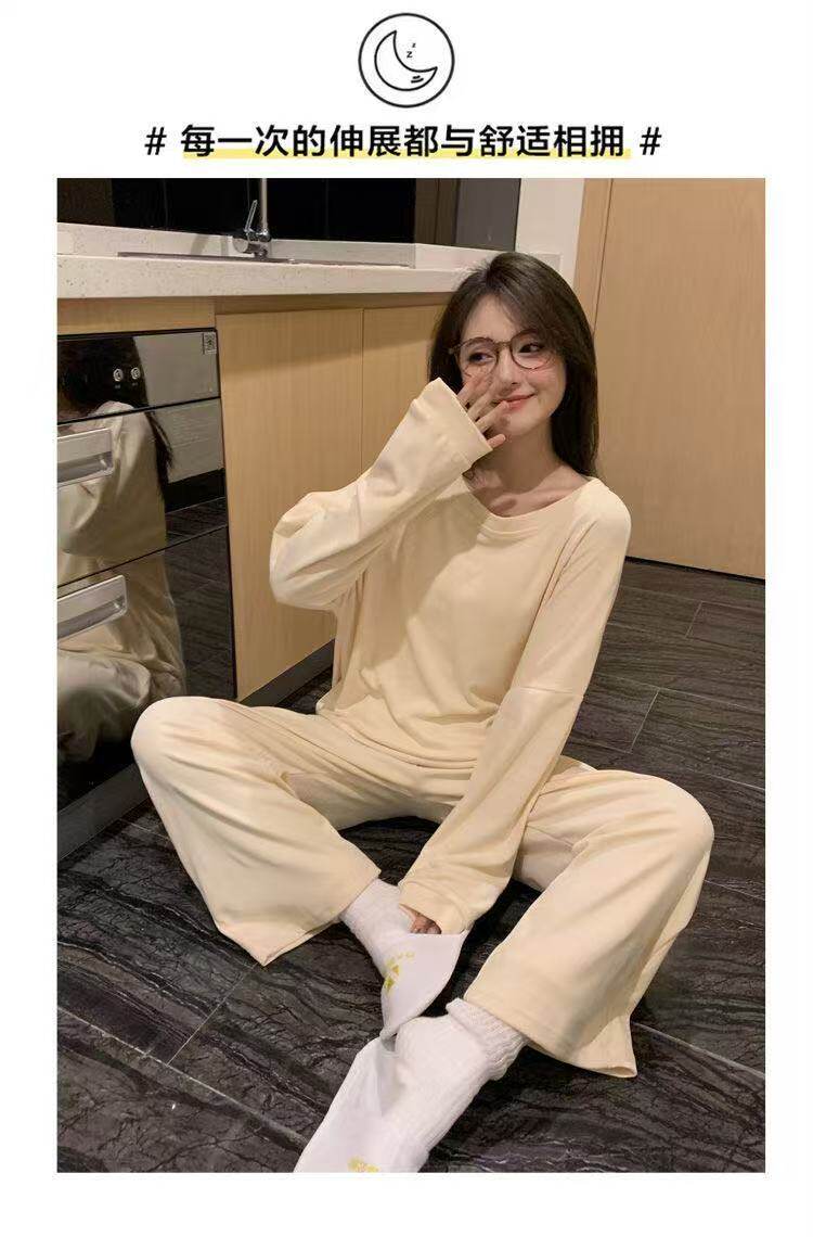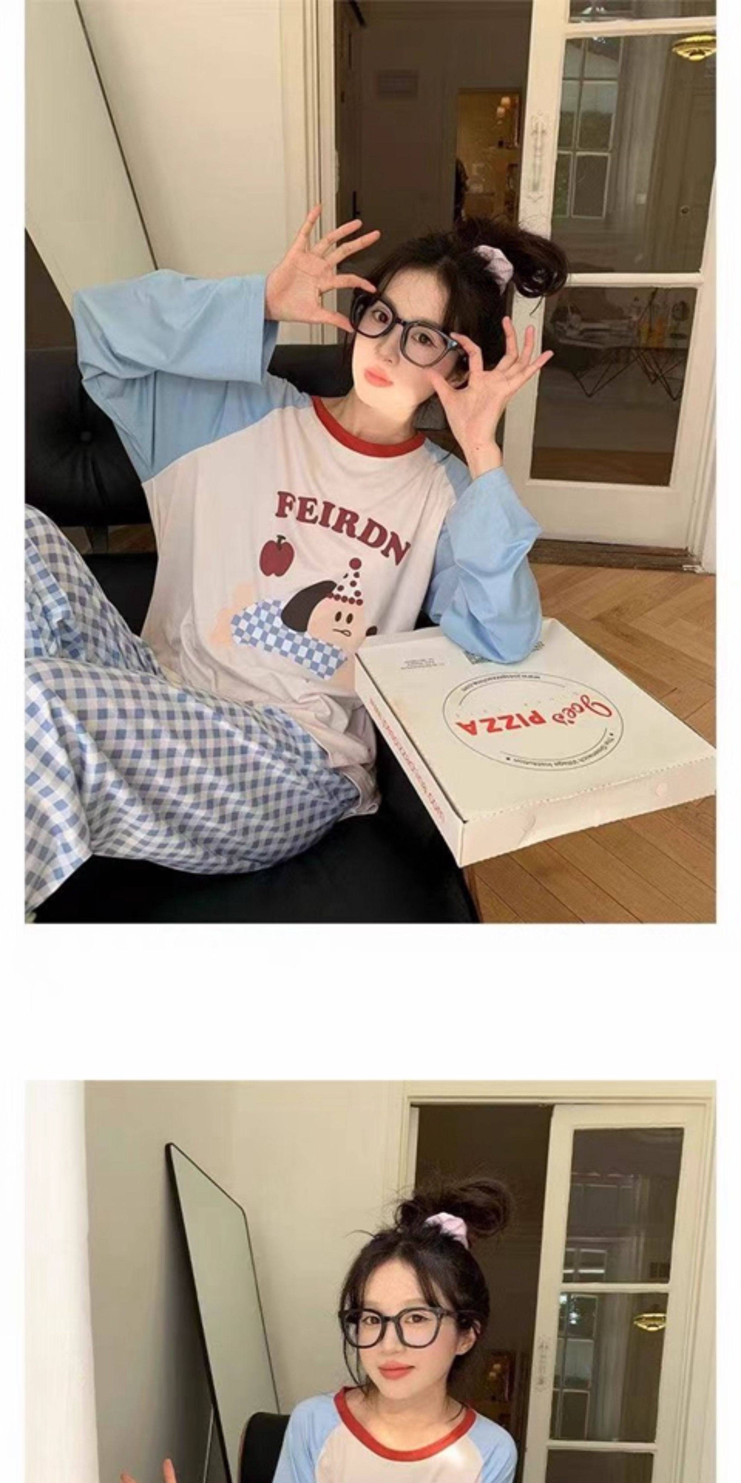 撞色圓領德絨睡衣套裝女春秋長袖長褲寬鬆休閒冬季卡通刺綉家居服