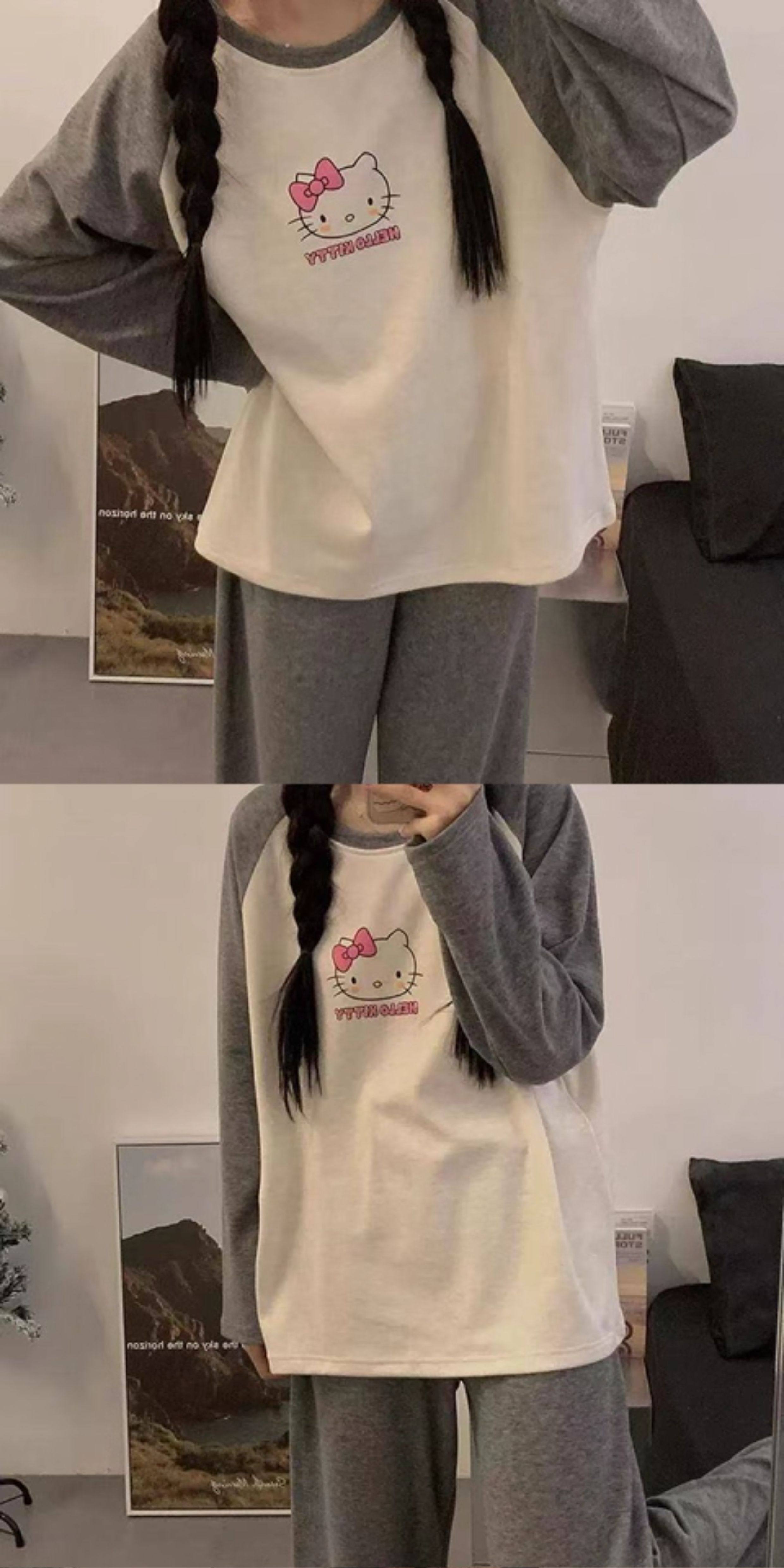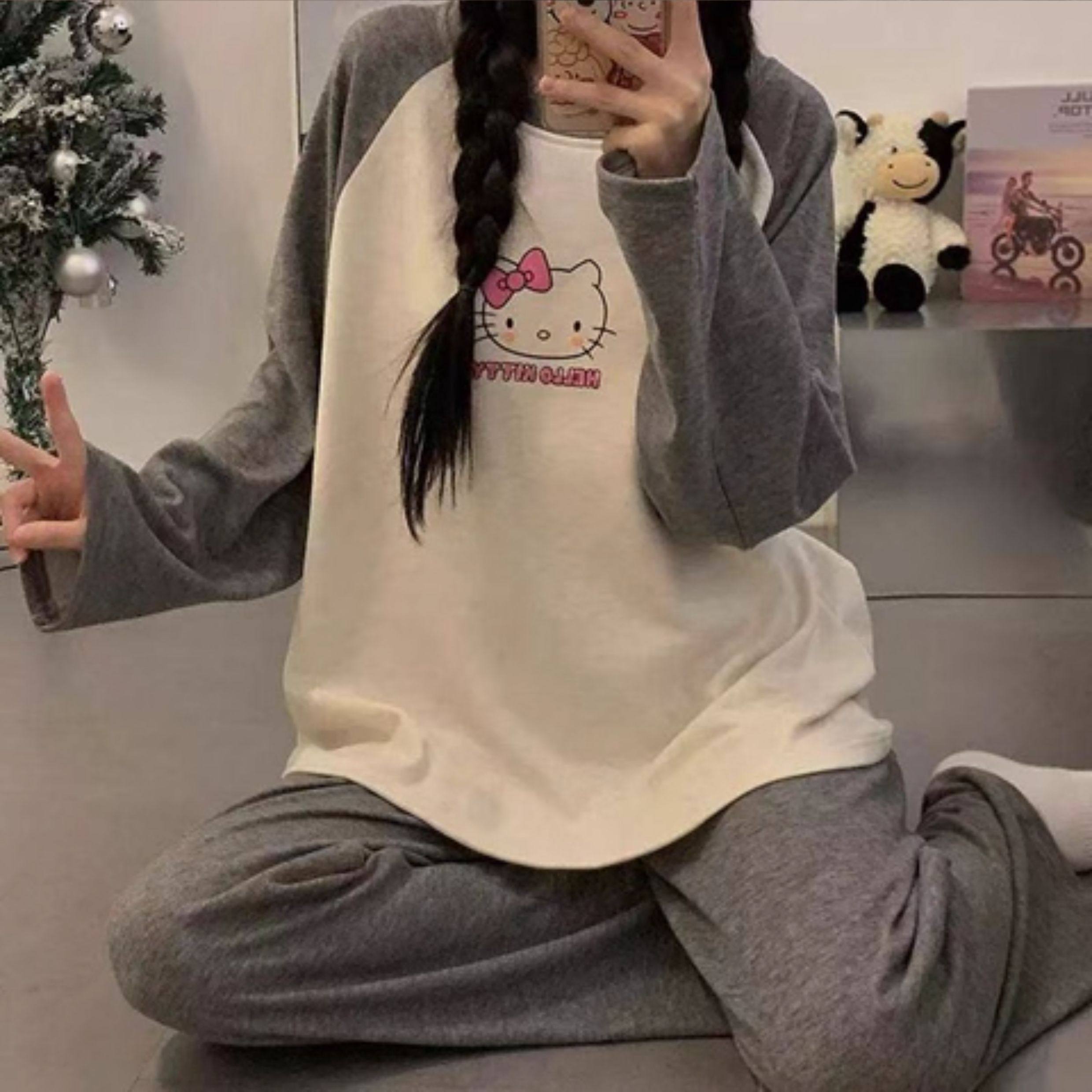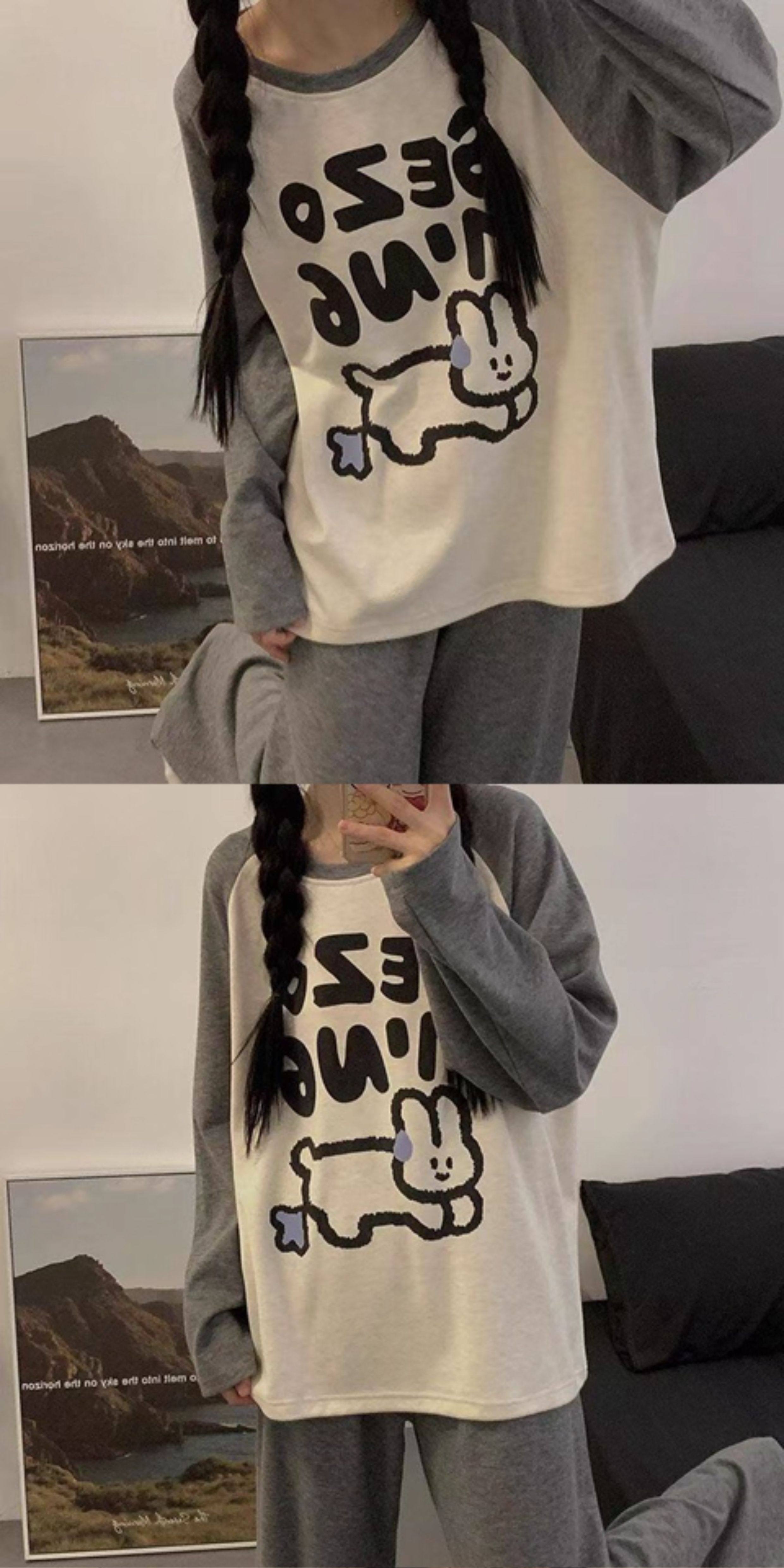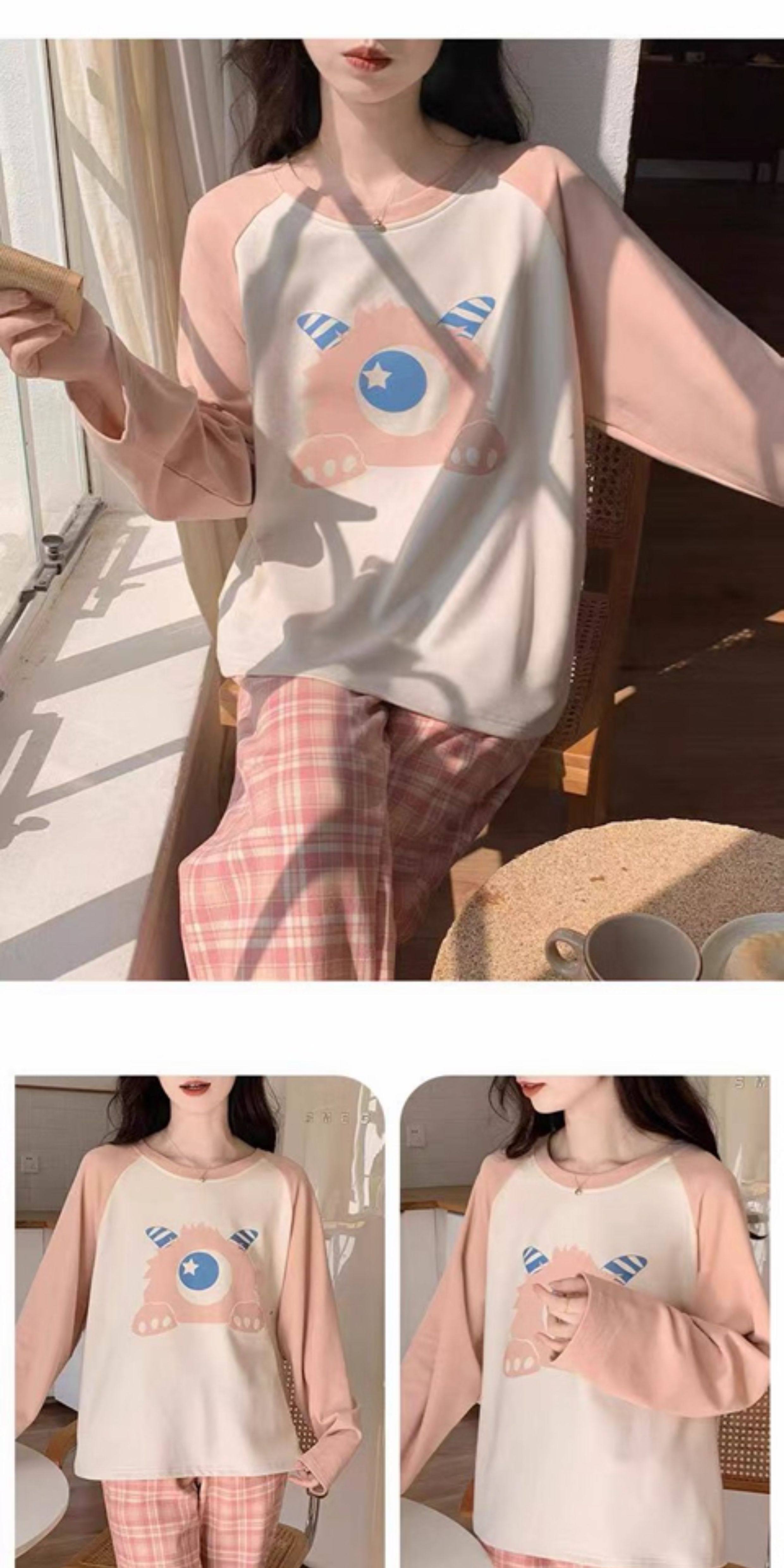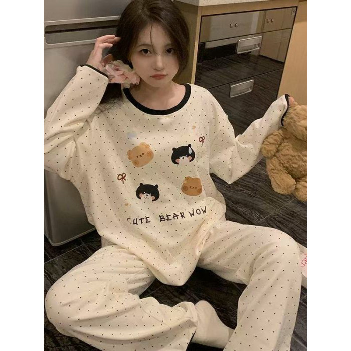 撞色圓領德絨睡衣套裝女春秋長袖長褲寬鬆休閒冬季卡通刺綉家居服