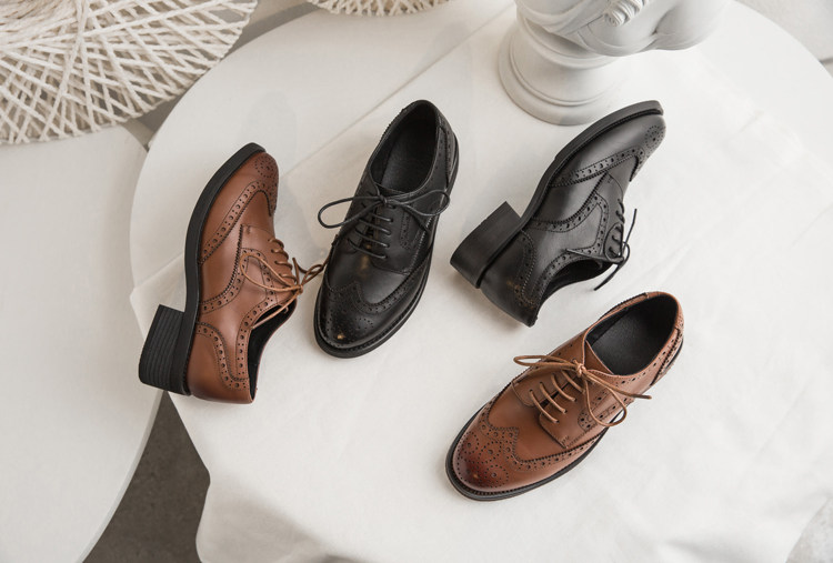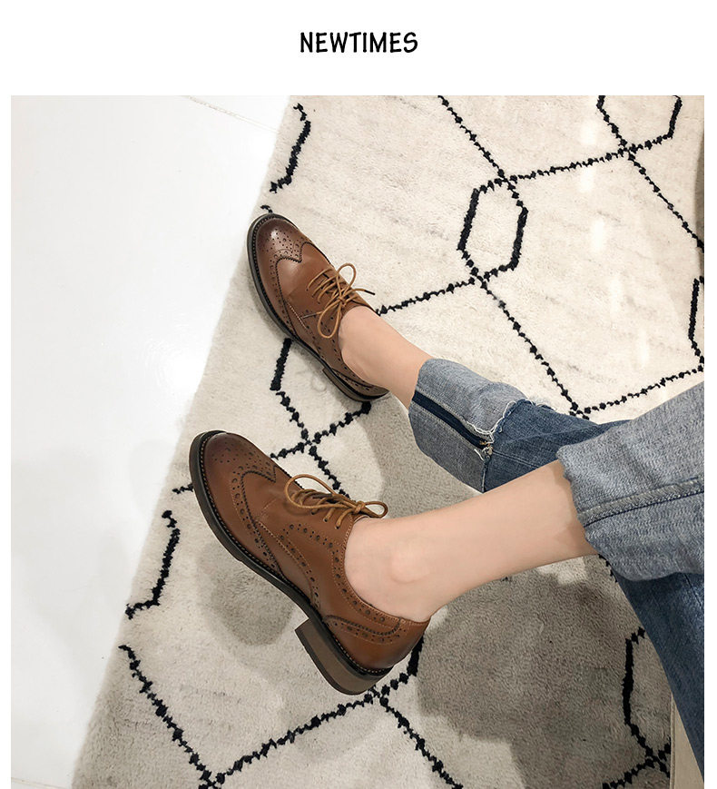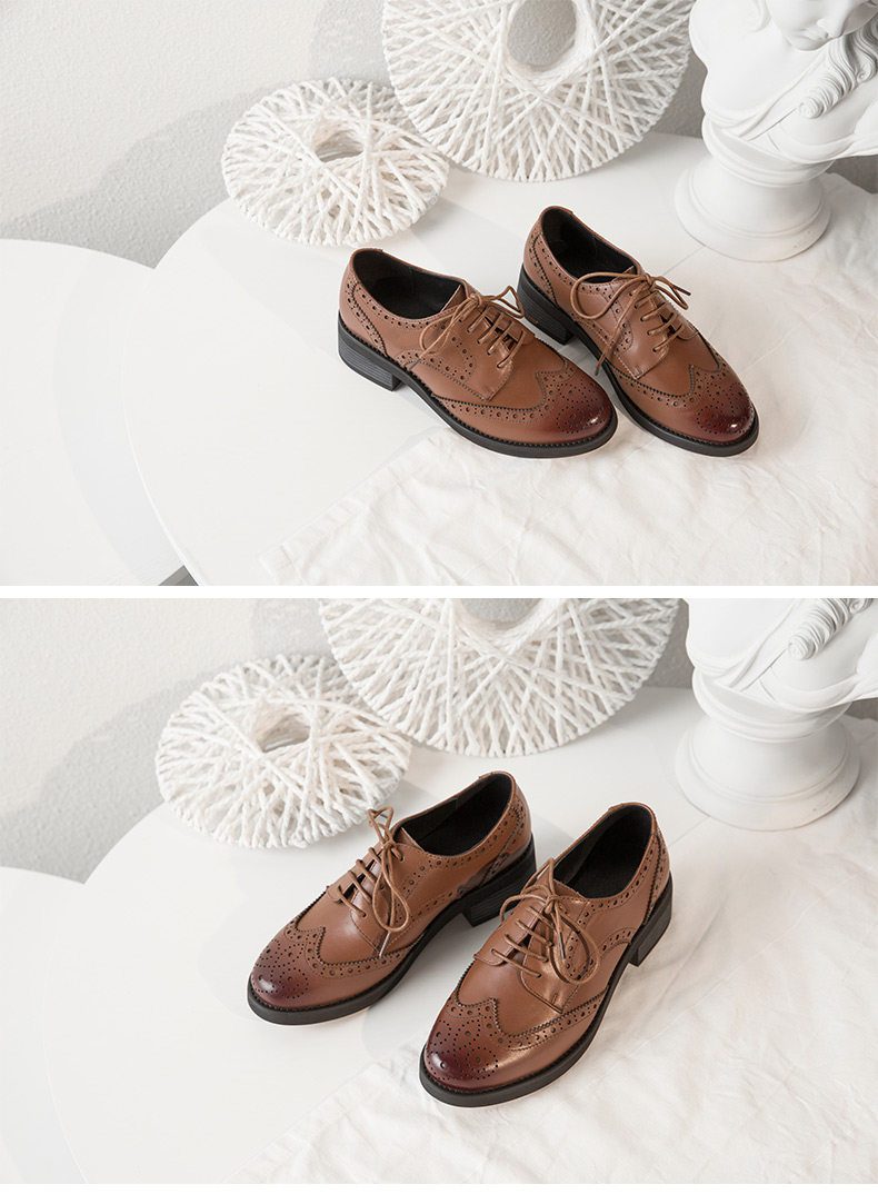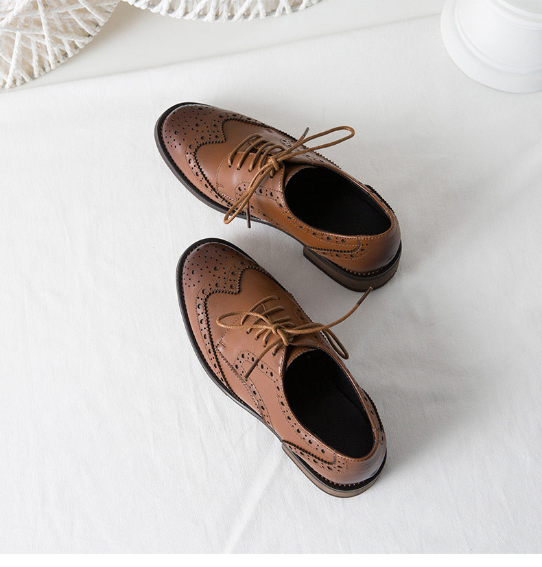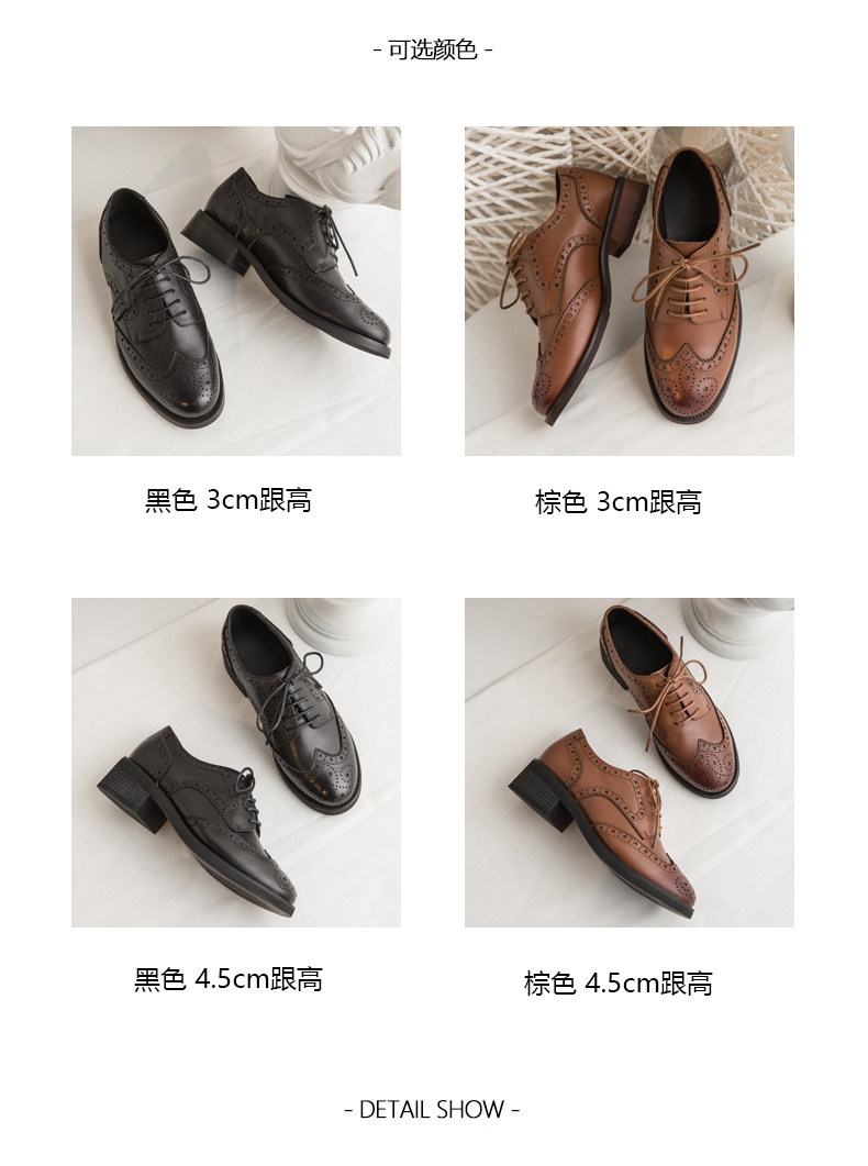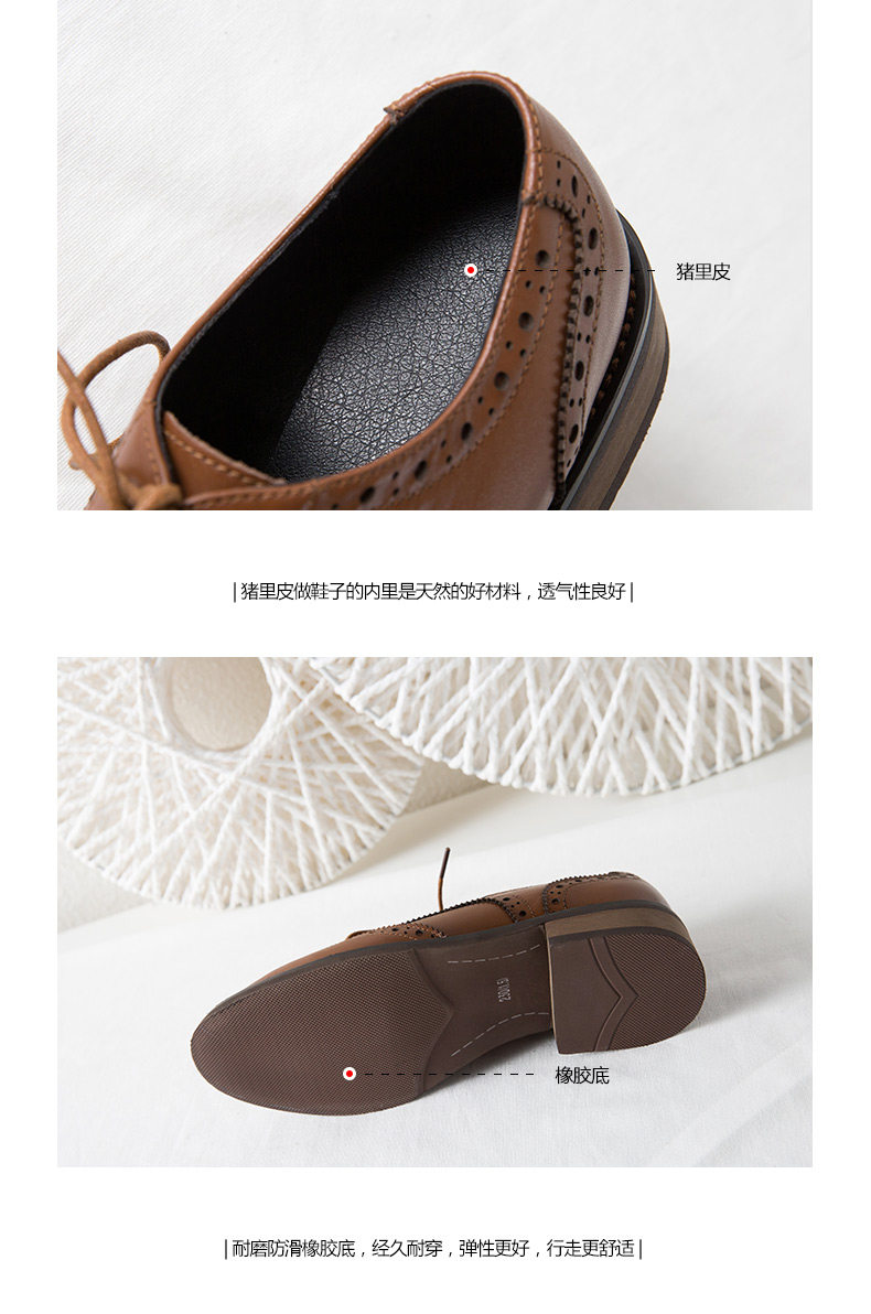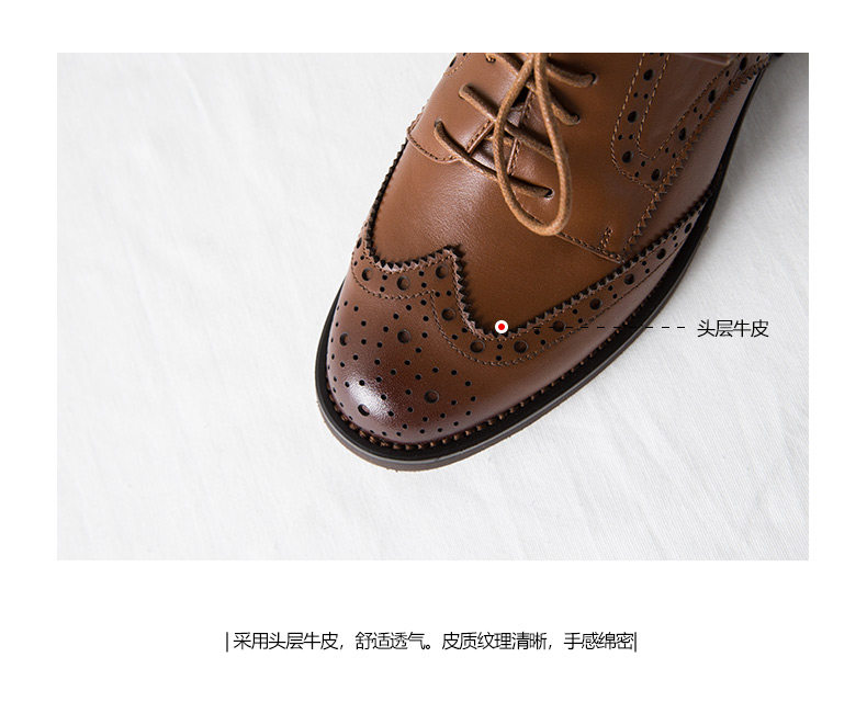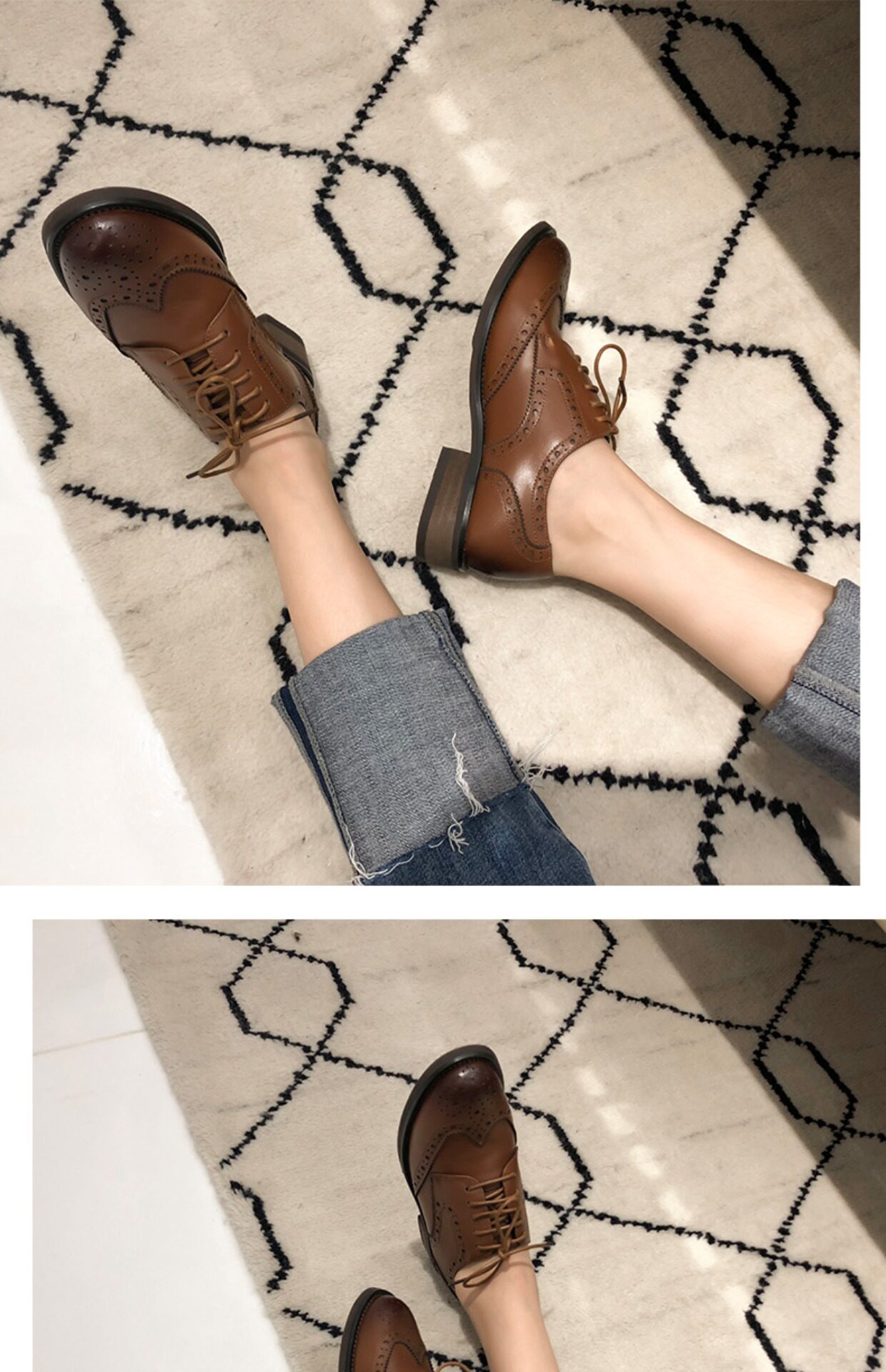 小皮鞋女2025新款復古英倫風雕花真皮系帶粗跟春秋單鞋布洛克女鞋