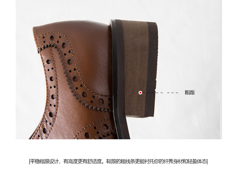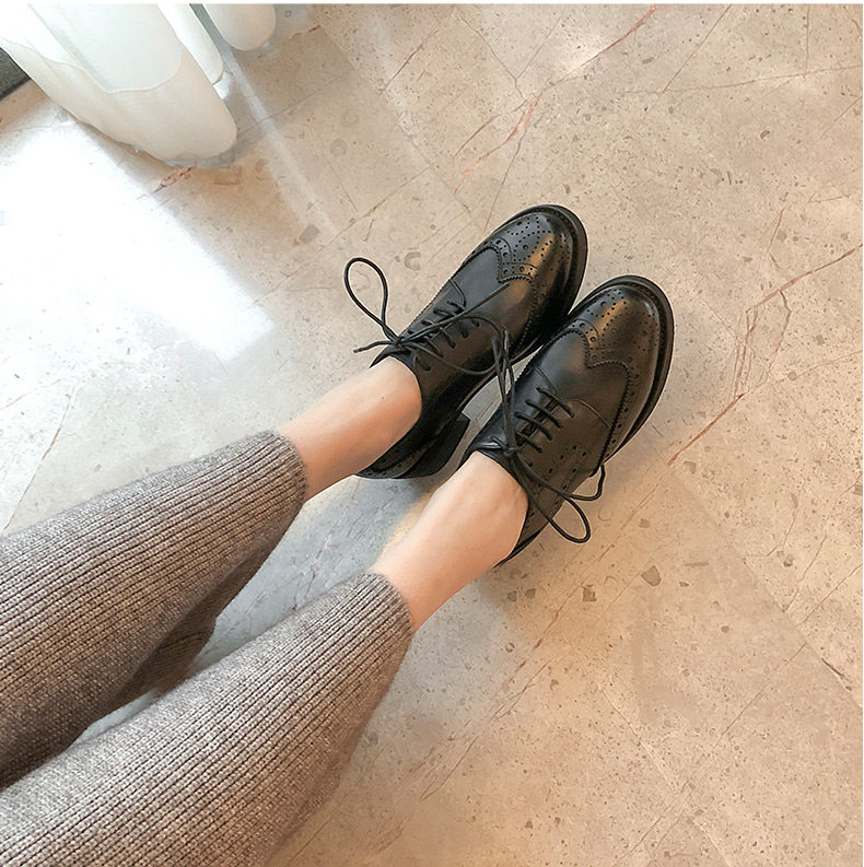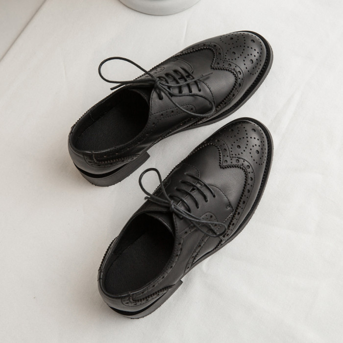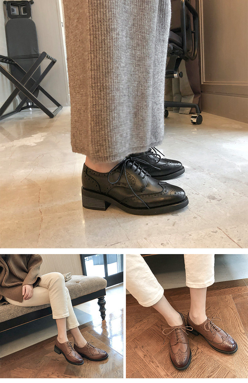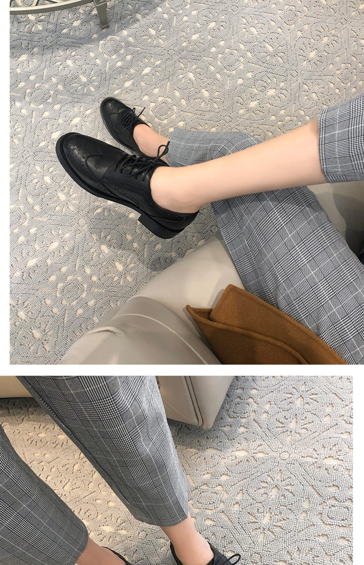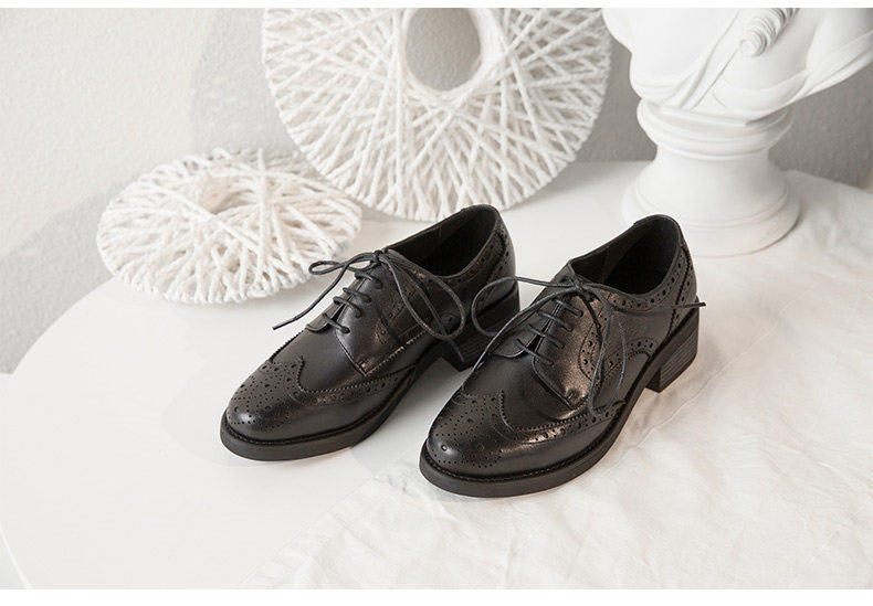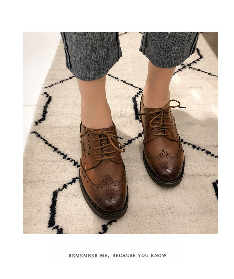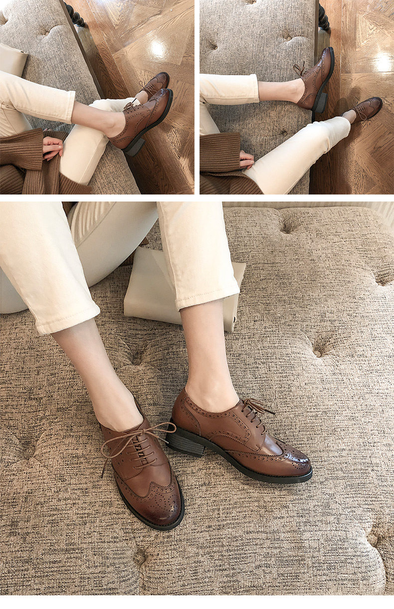 小皮鞋女2025新款復古英倫風雕花真皮系帶粗跟春秋單鞋布洛克女鞋