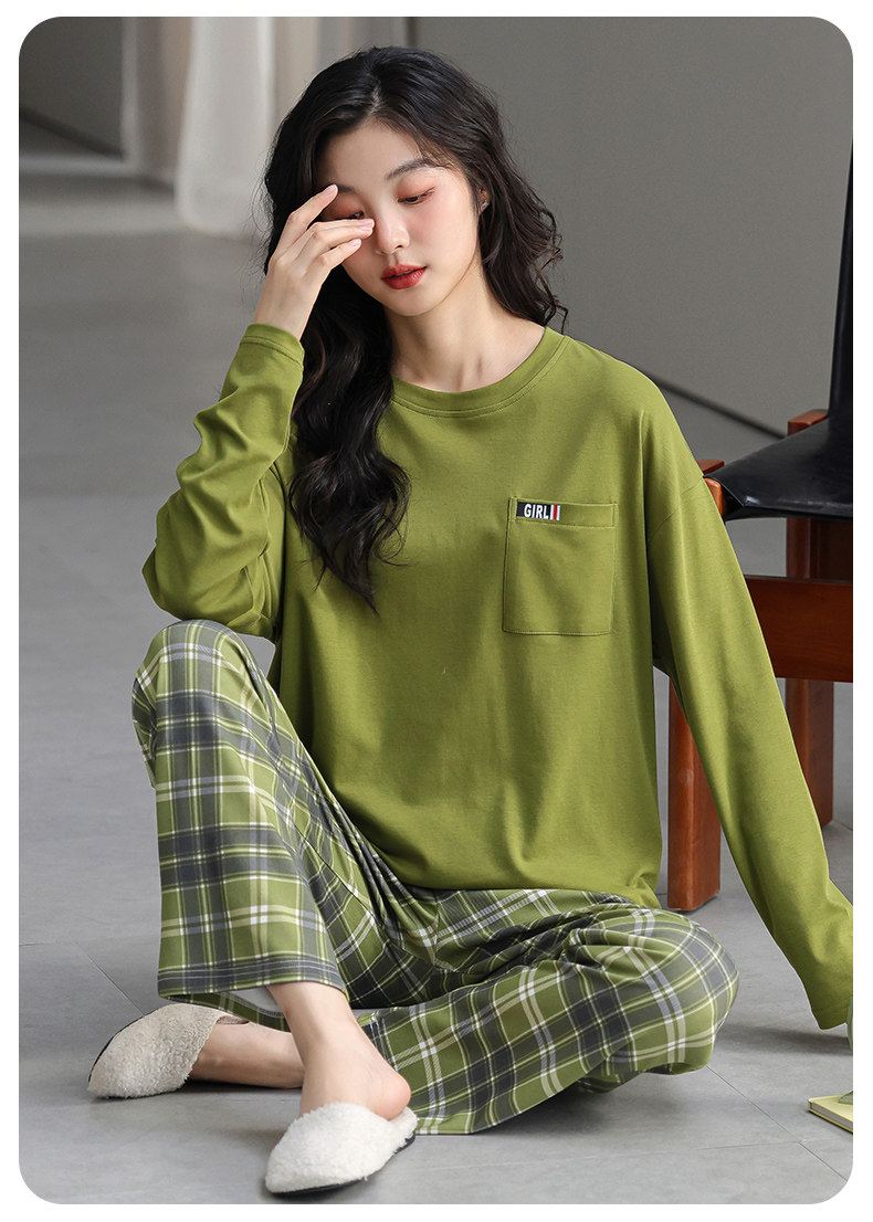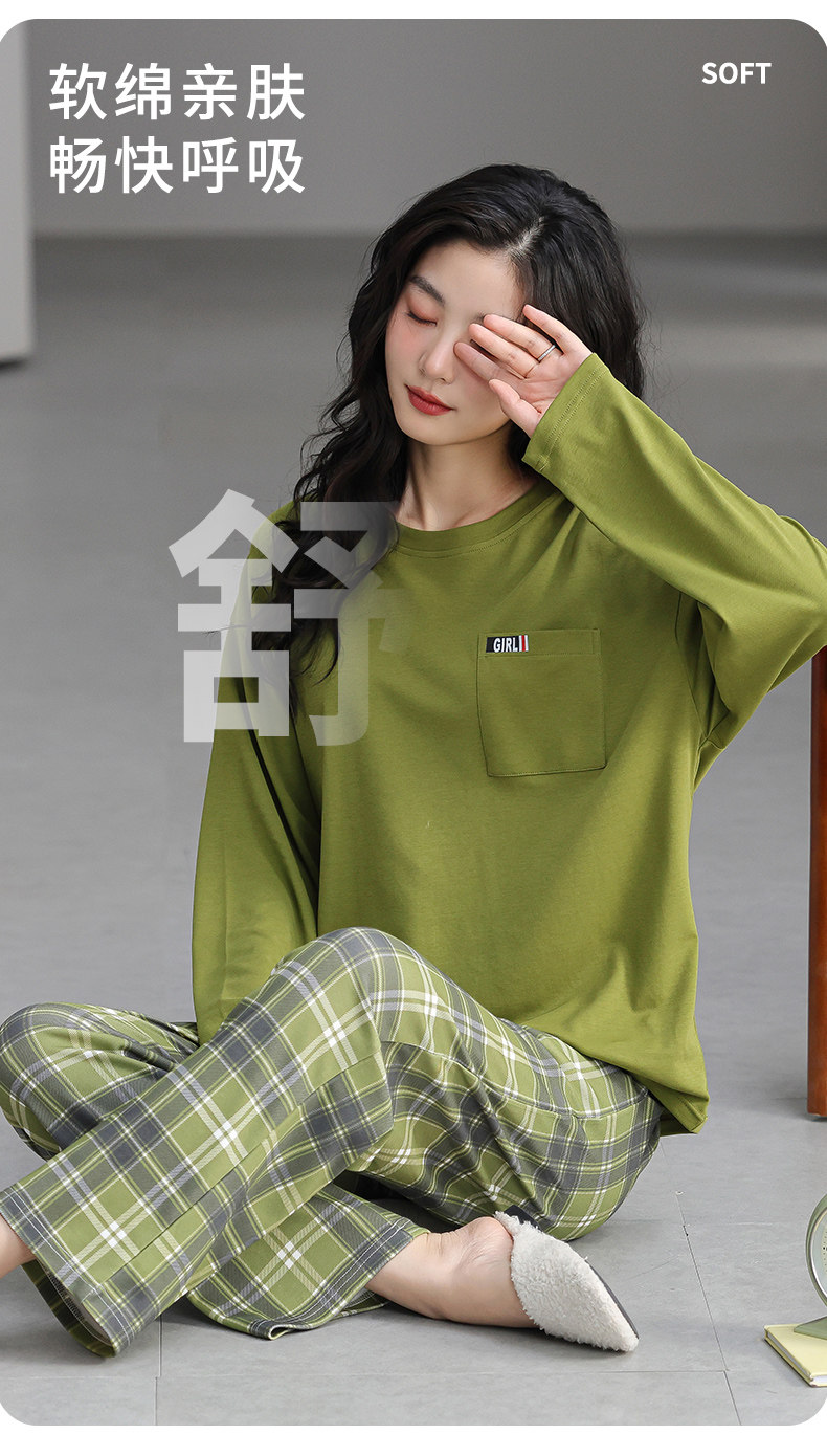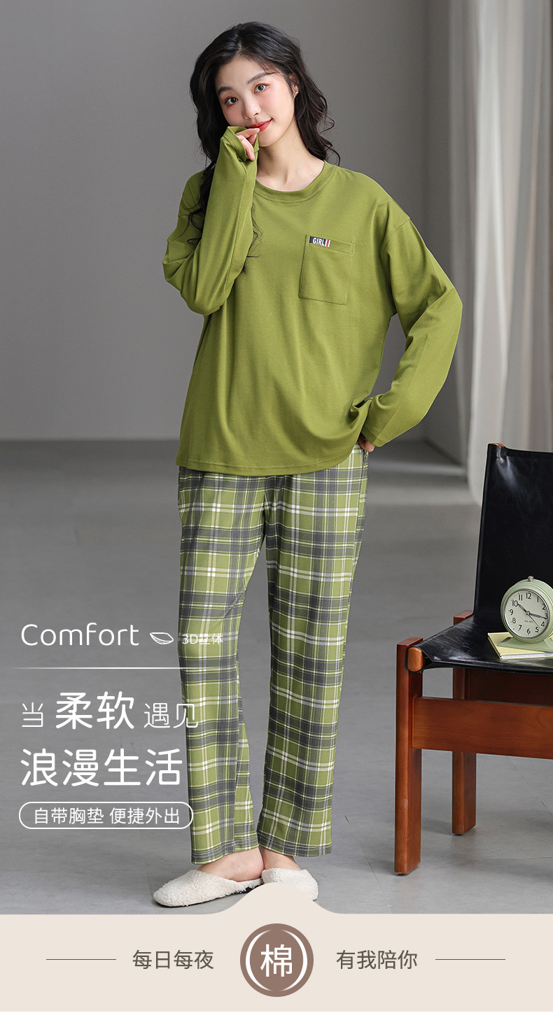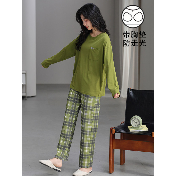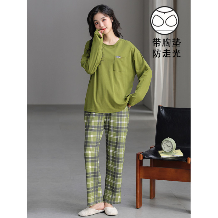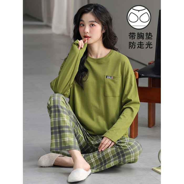 帶胸墊一體睡衣女春秋款長袖純棉甜美卡通套裝冬季休閒寬鬆家居服
