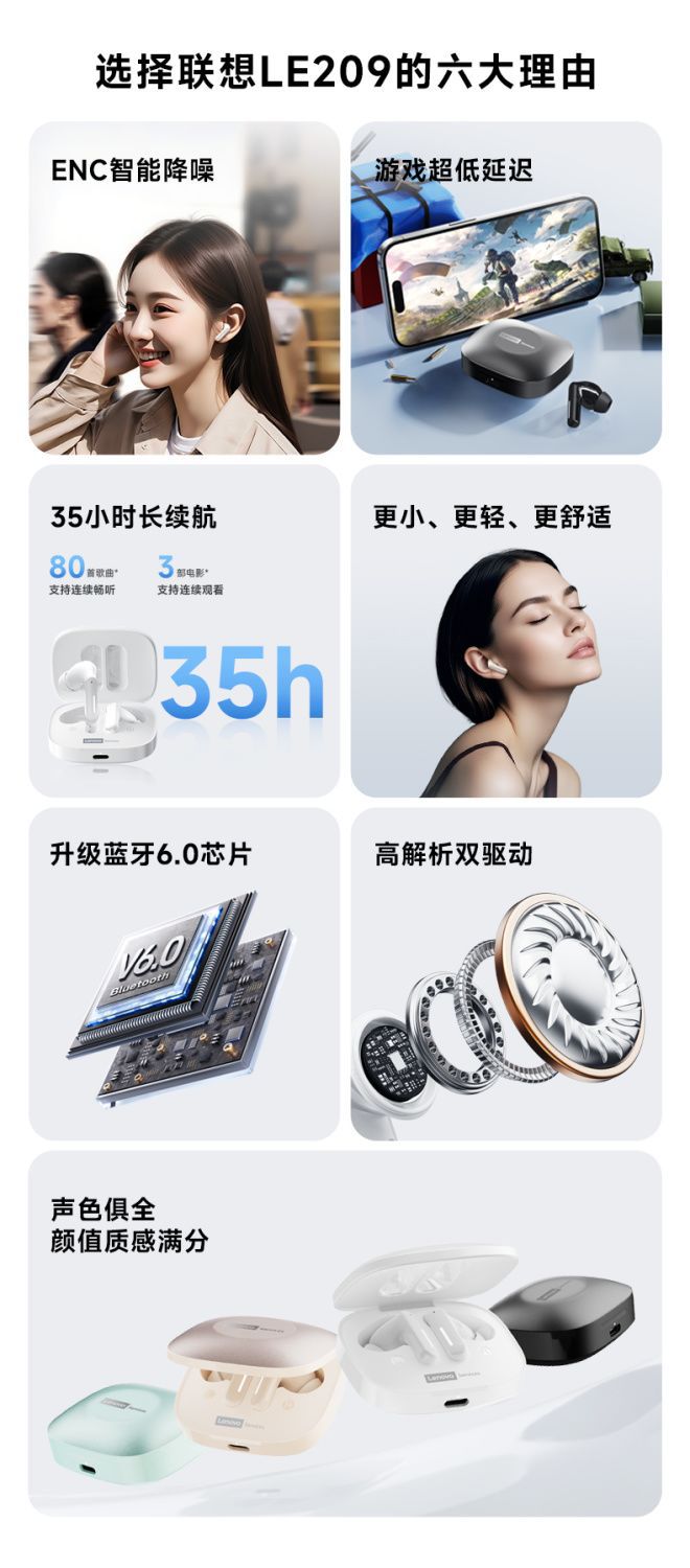 聯想LE209入耳式藍牙耳機藍牙6.0雙模式遊戯運動長續航高音質耳機