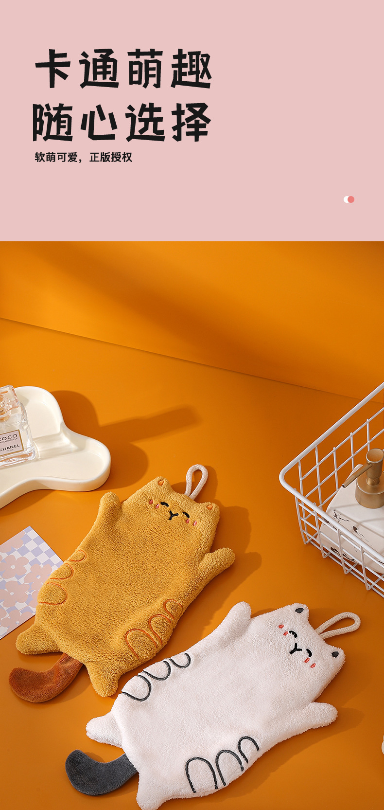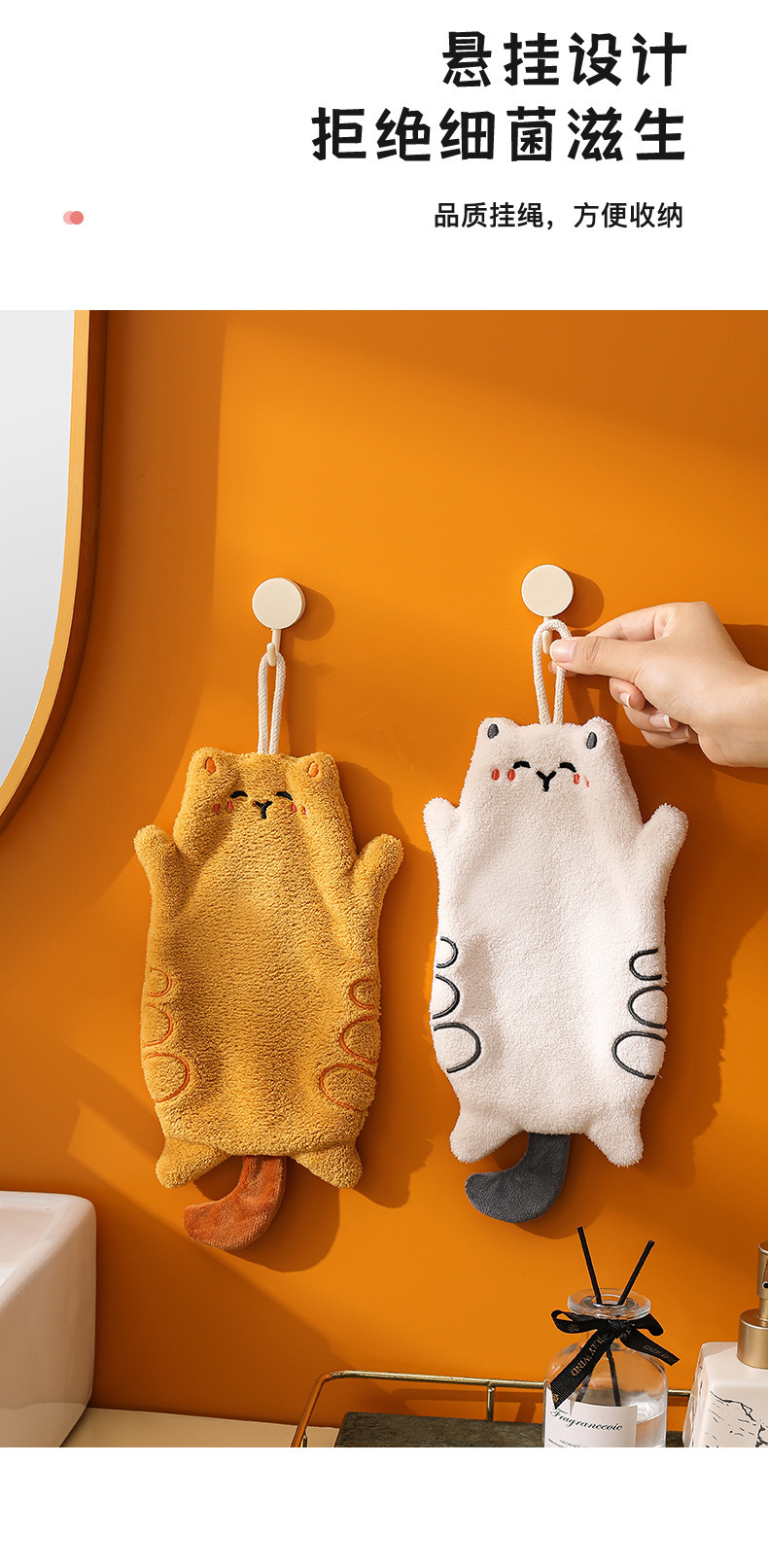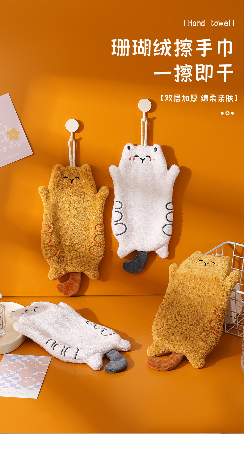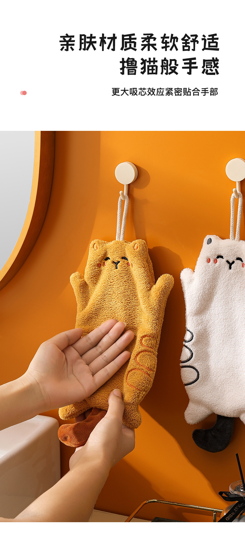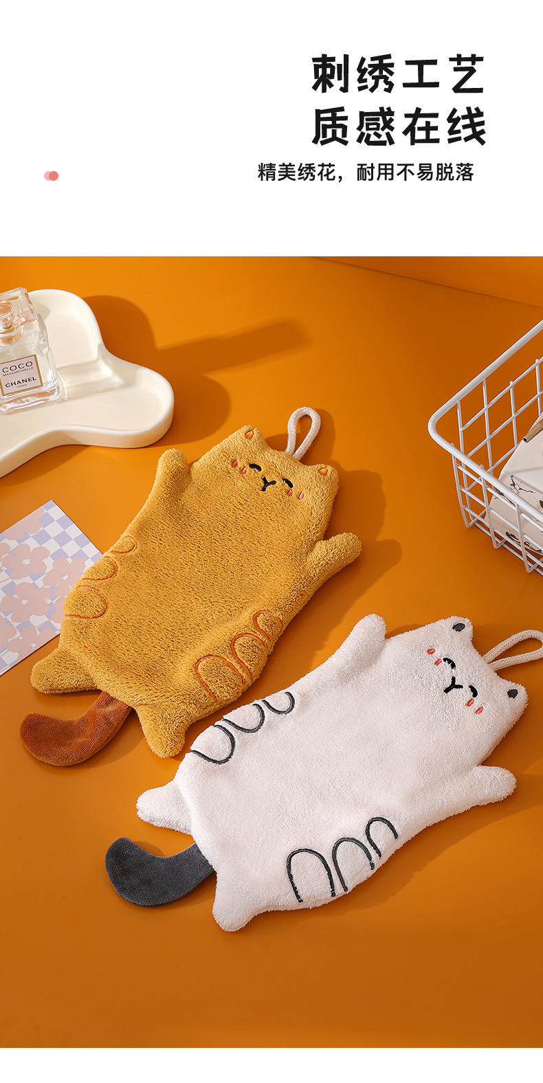 可愛貓咪造型擦手巾廚房浴室懸掛吸水毛巾珊瑚絨綉花兒童卡通手帕