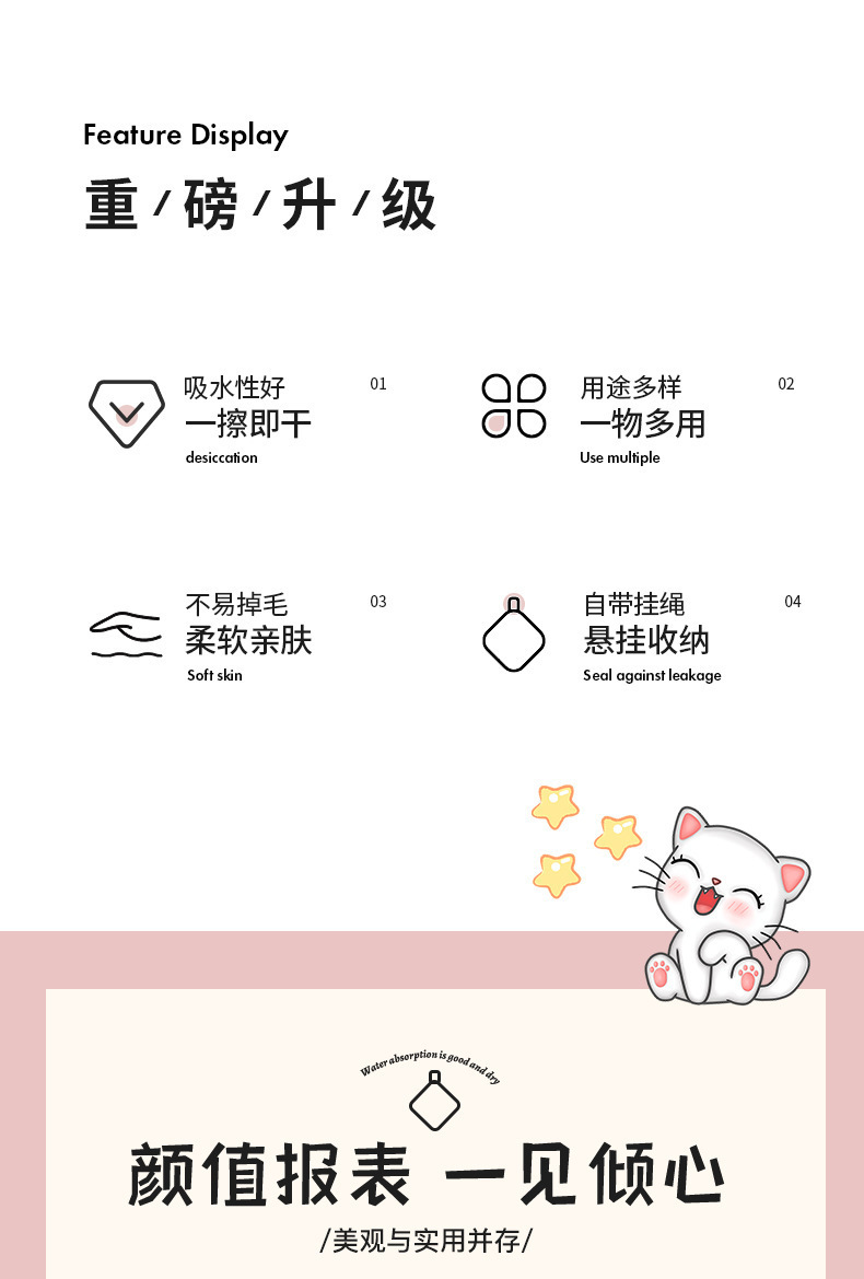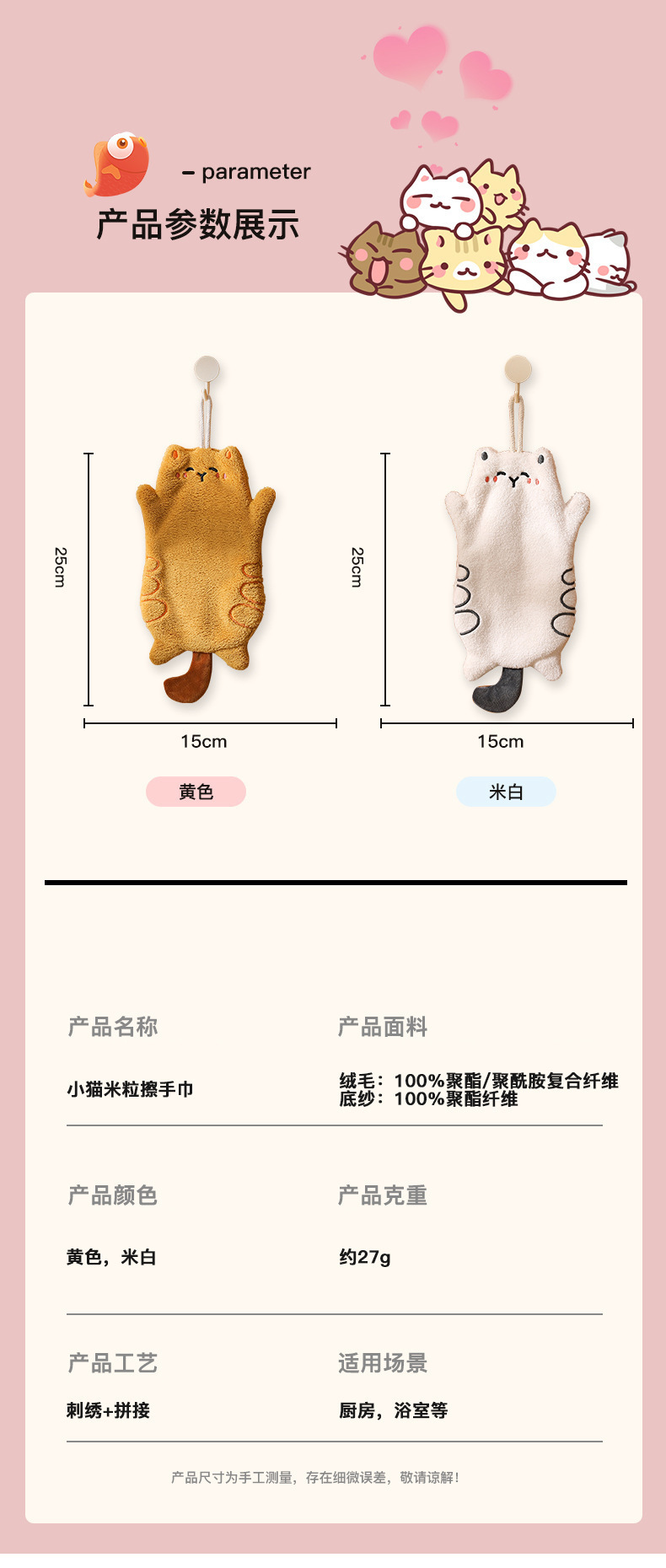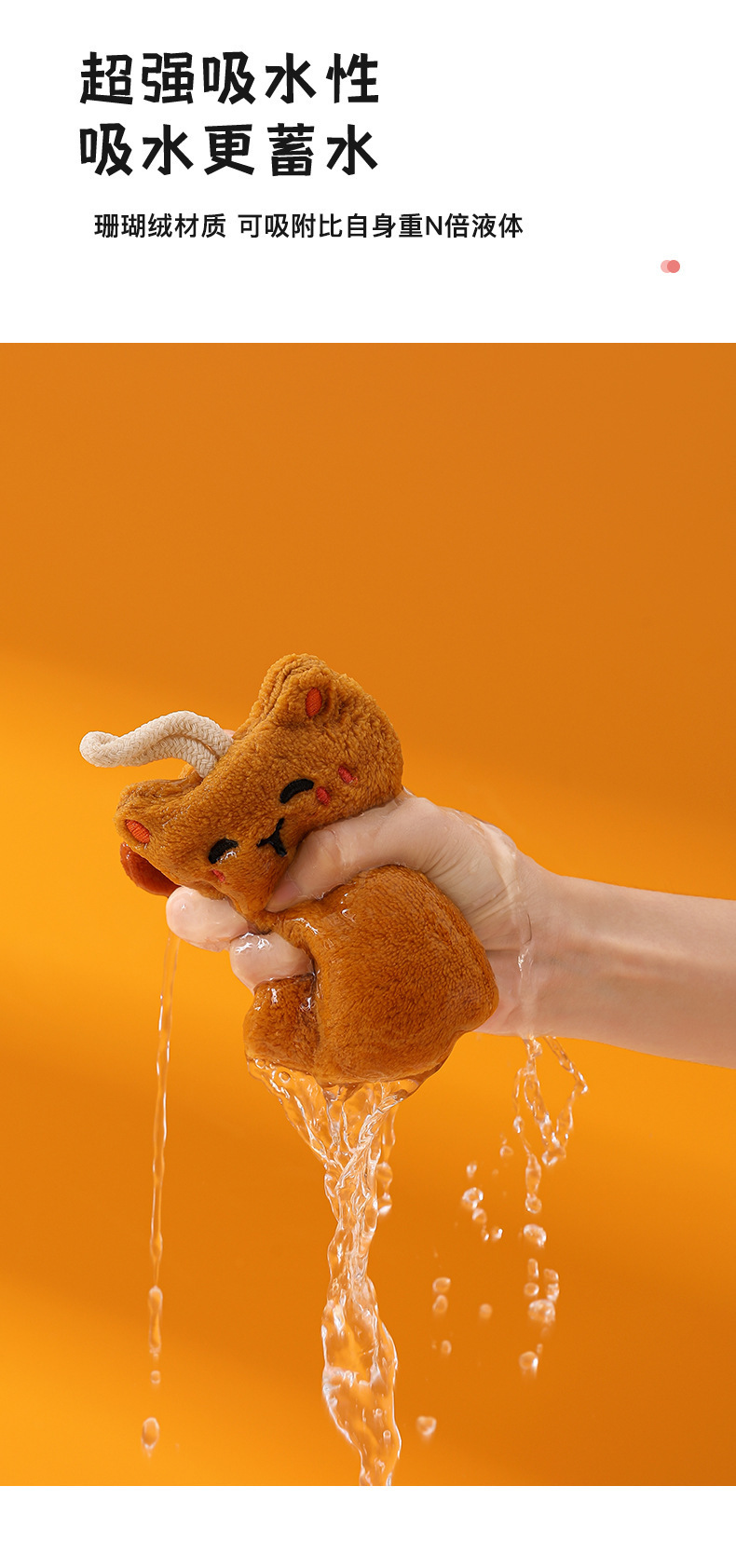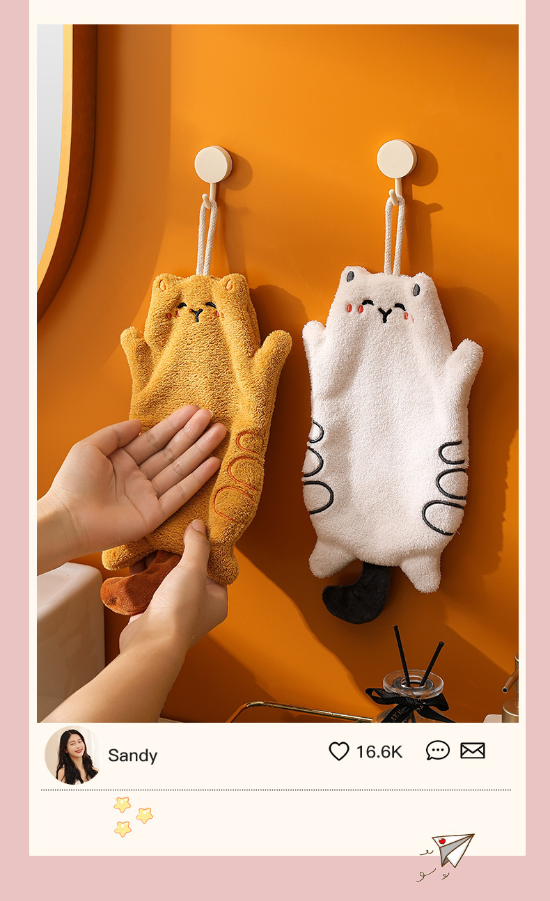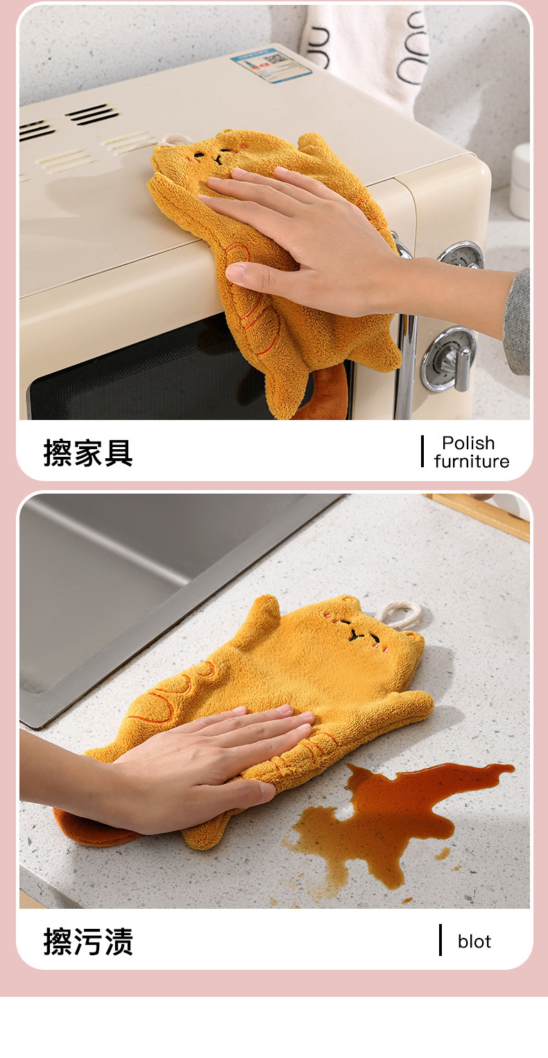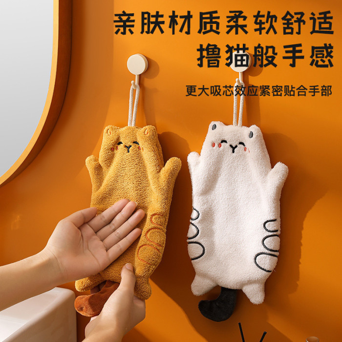 可愛貓咪造型擦手巾廚房浴室懸掛吸水毛巾珊瑚絨綉花兒童卡通手帕