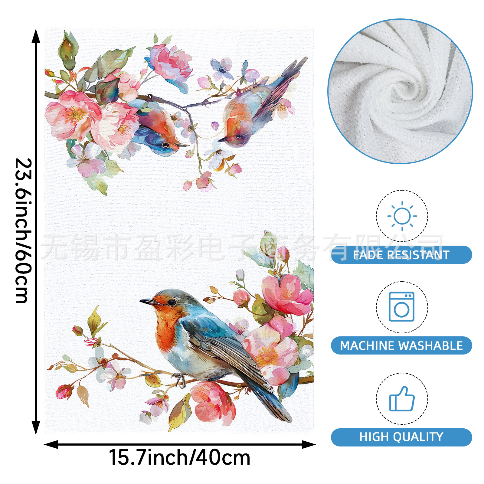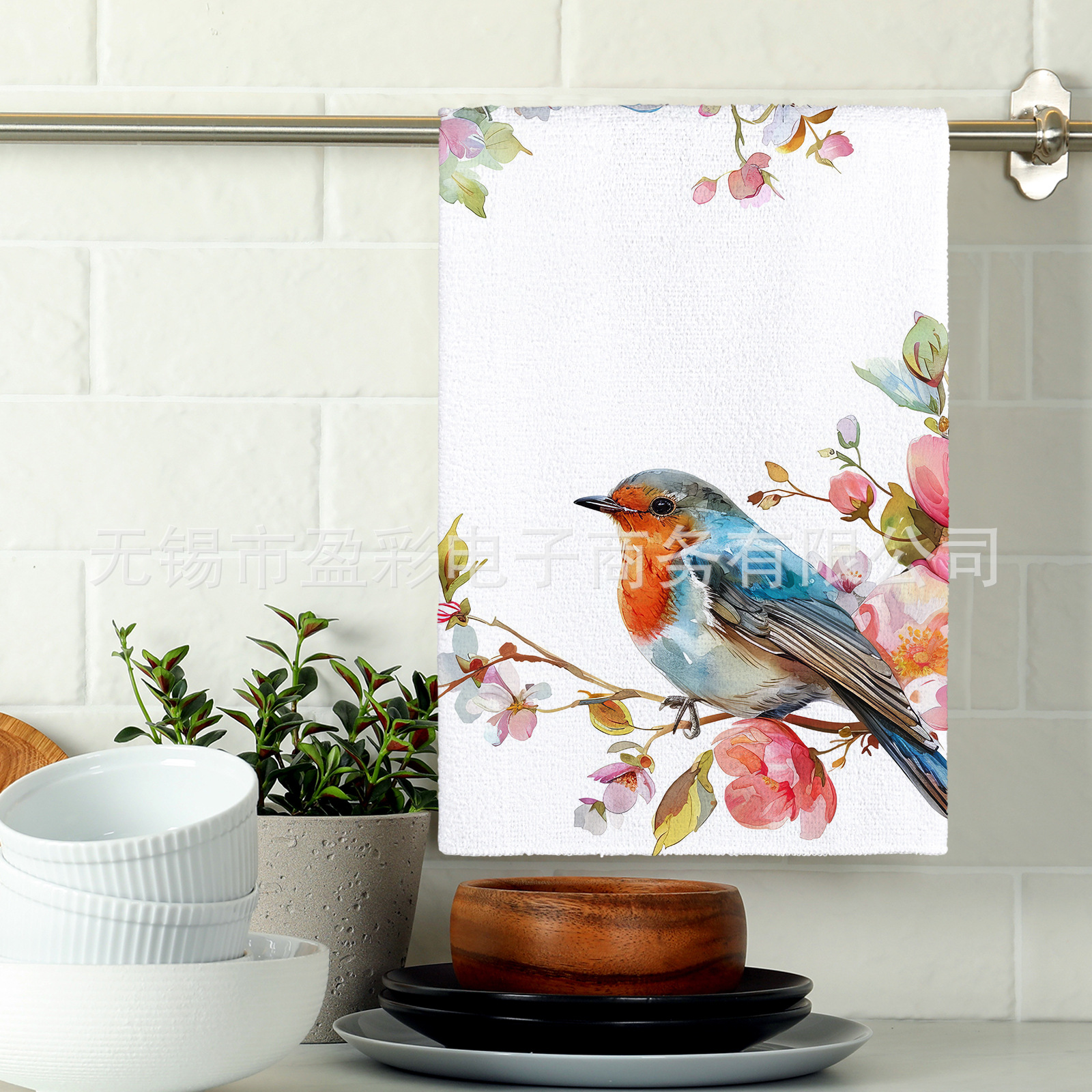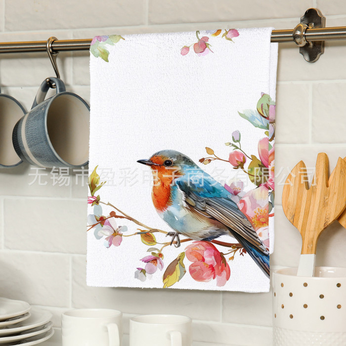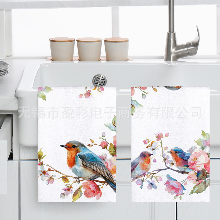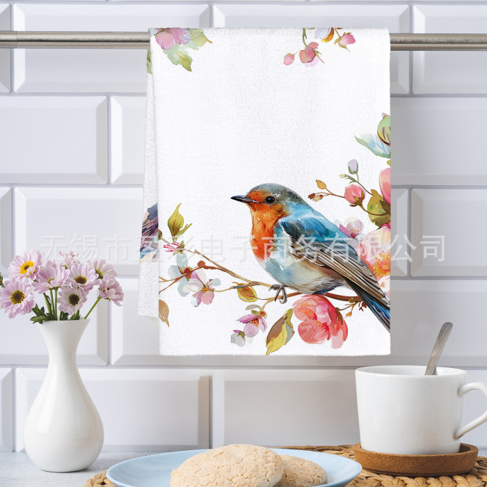 可愛樹枝小鳥印花毛巾布擦手巾茶巾數碼印花廚房浴室