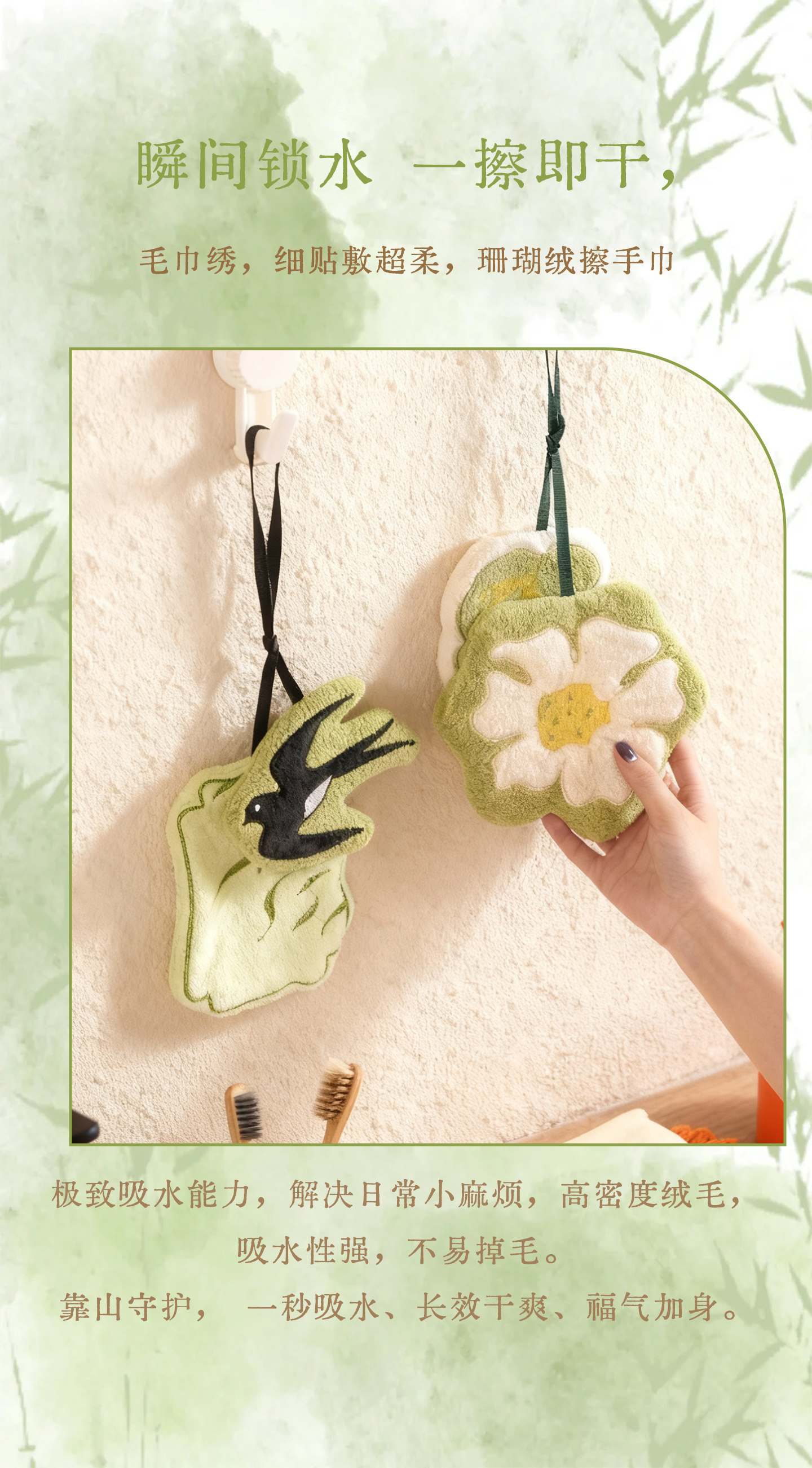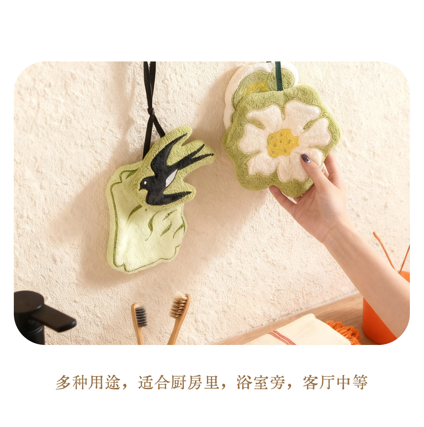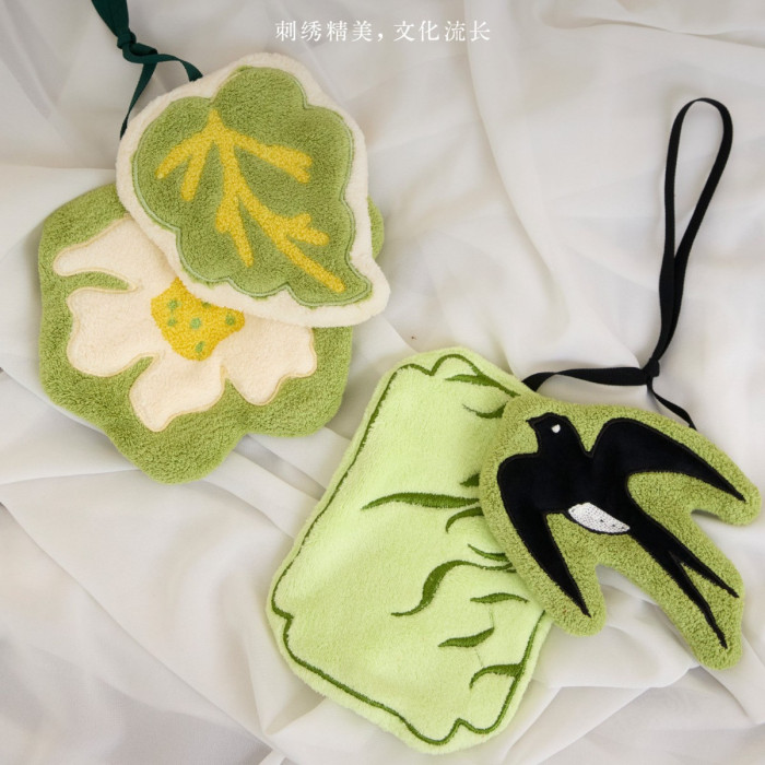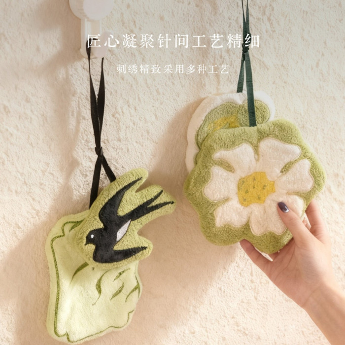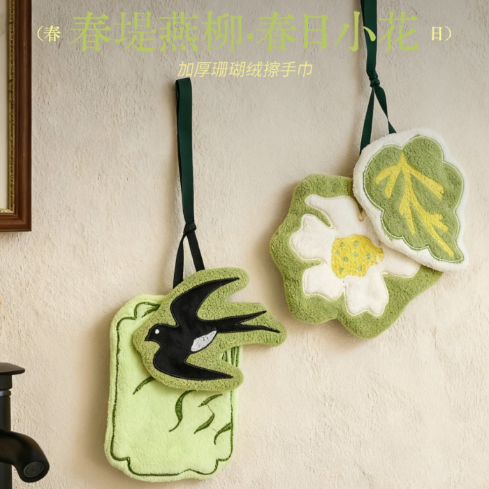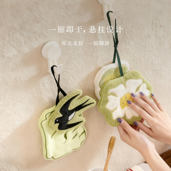 新中式廚房掛式珊瑚絨擦手巾可愛吸水加厚手帕浴室植物葉子小毛巾