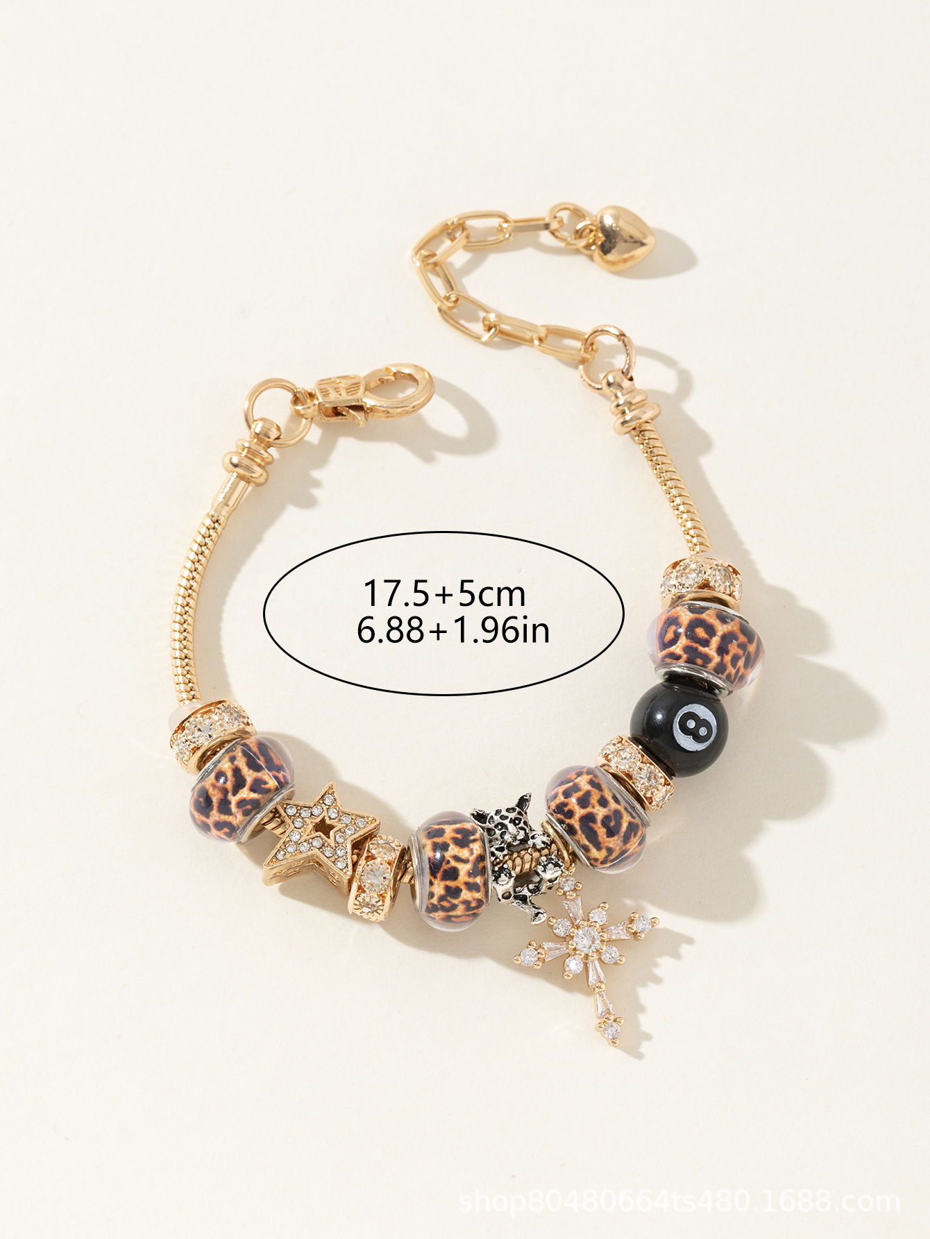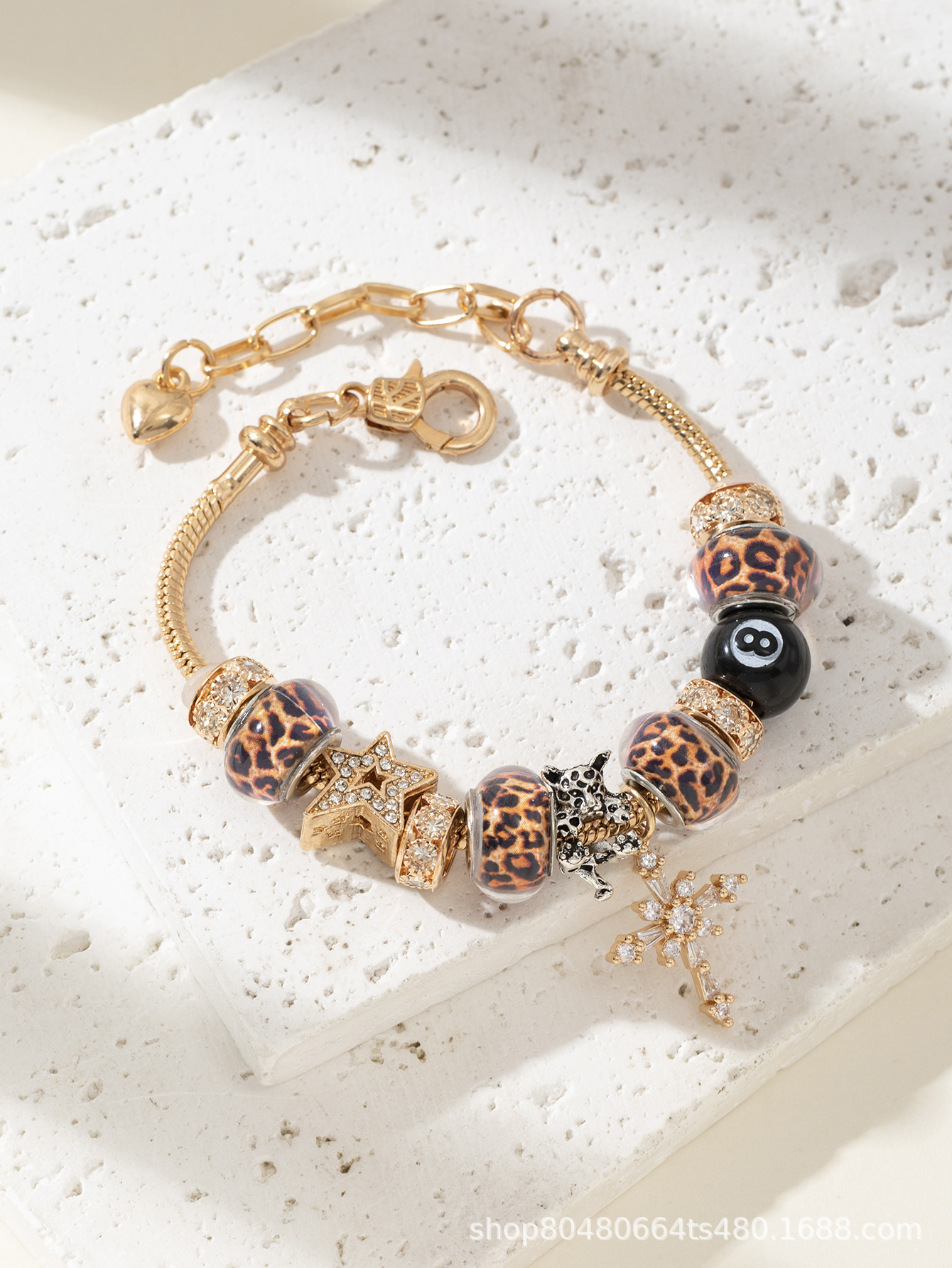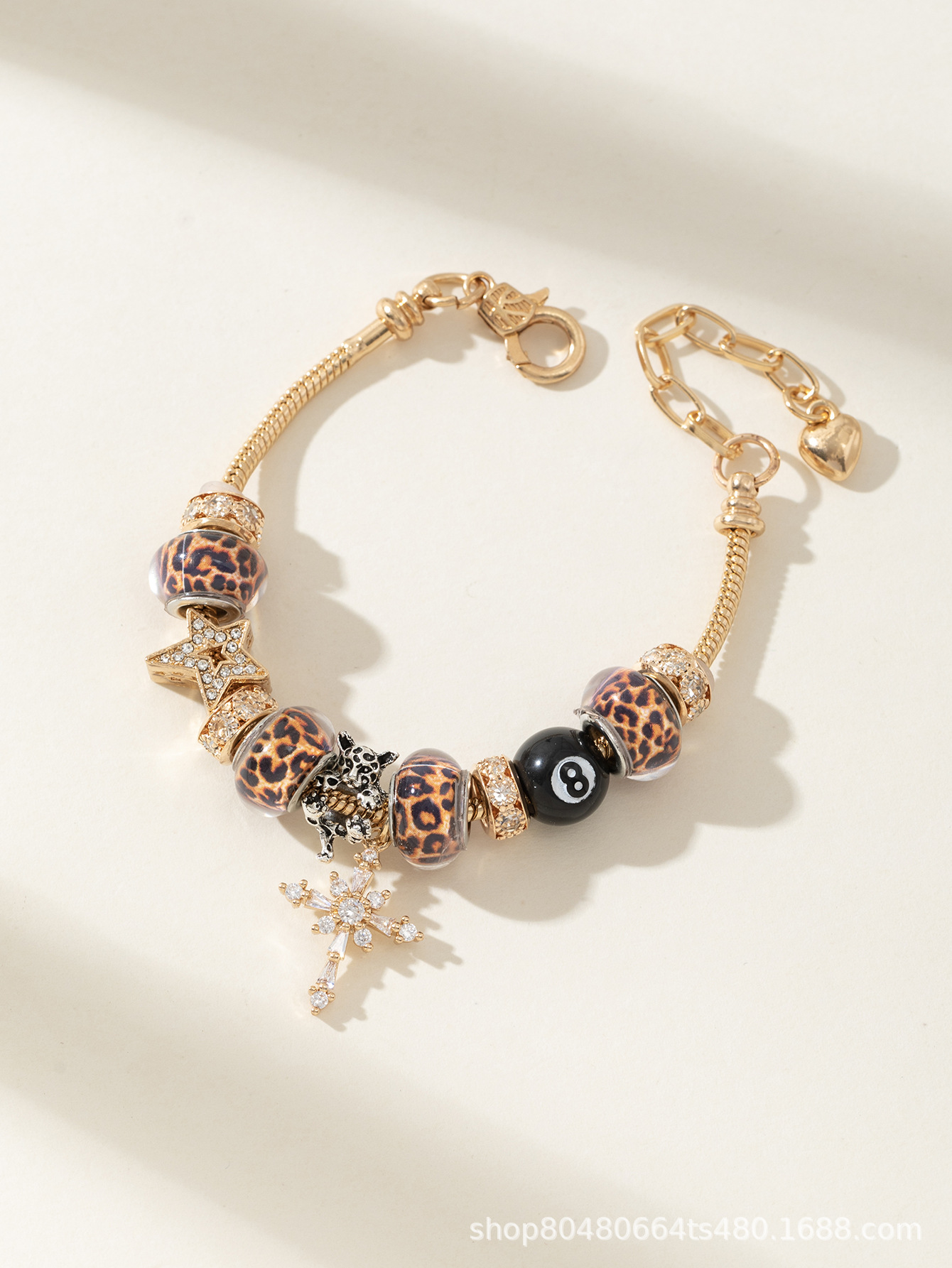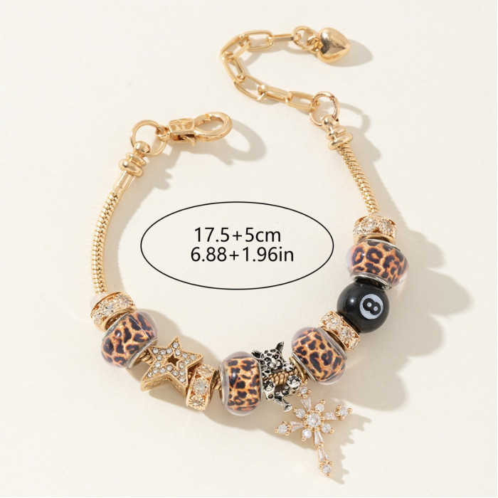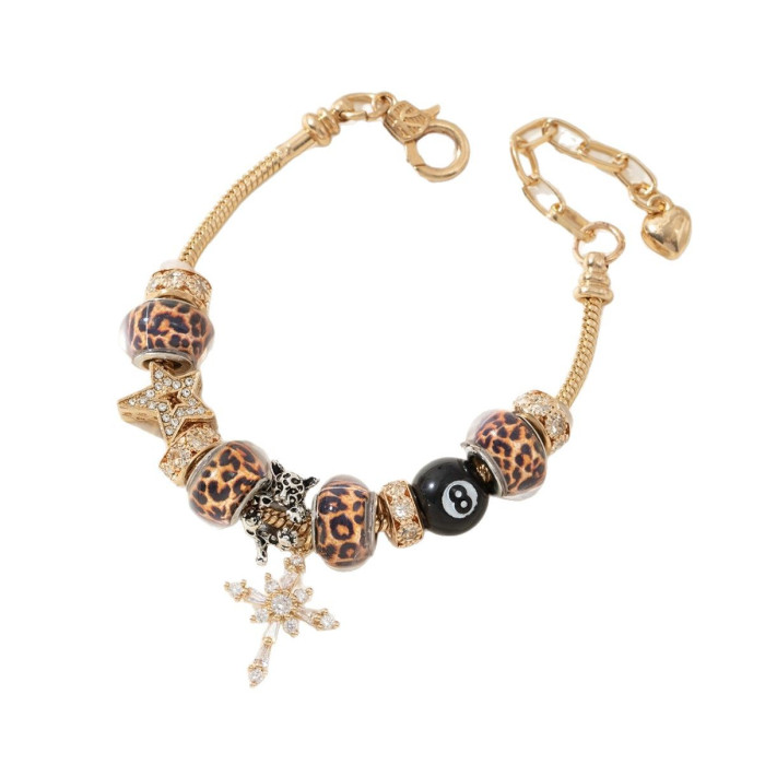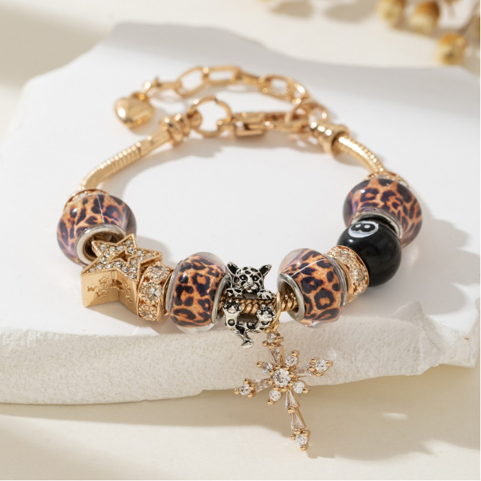 潘家手鏈 爆款DIY串珠手鐲銅鑲鋯十字架豹紋珠黑八時尚首飾品