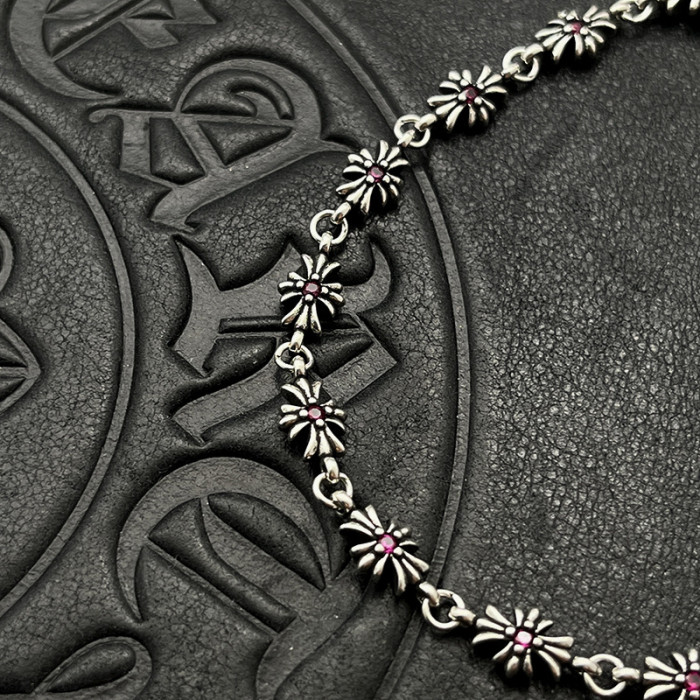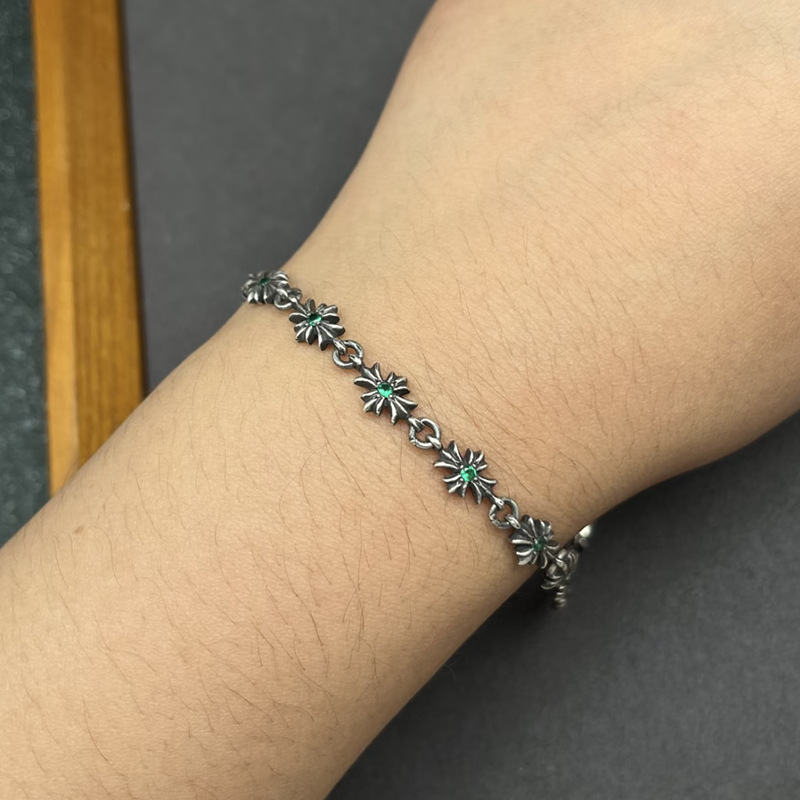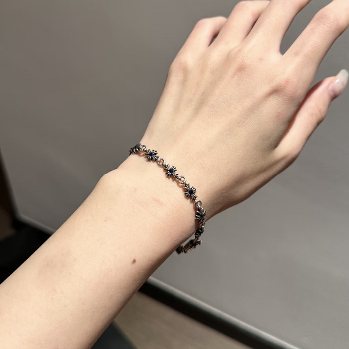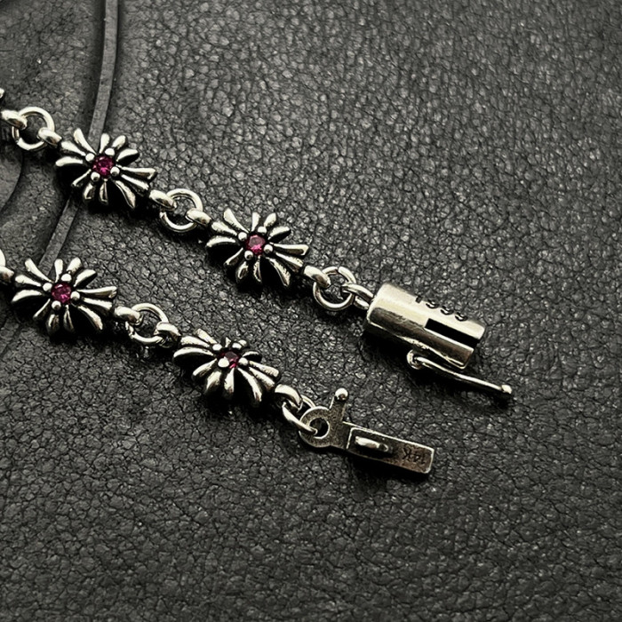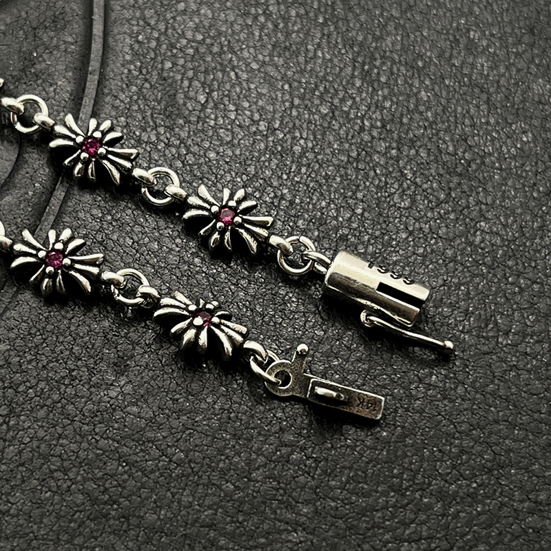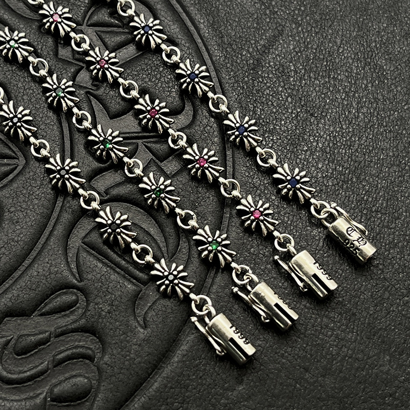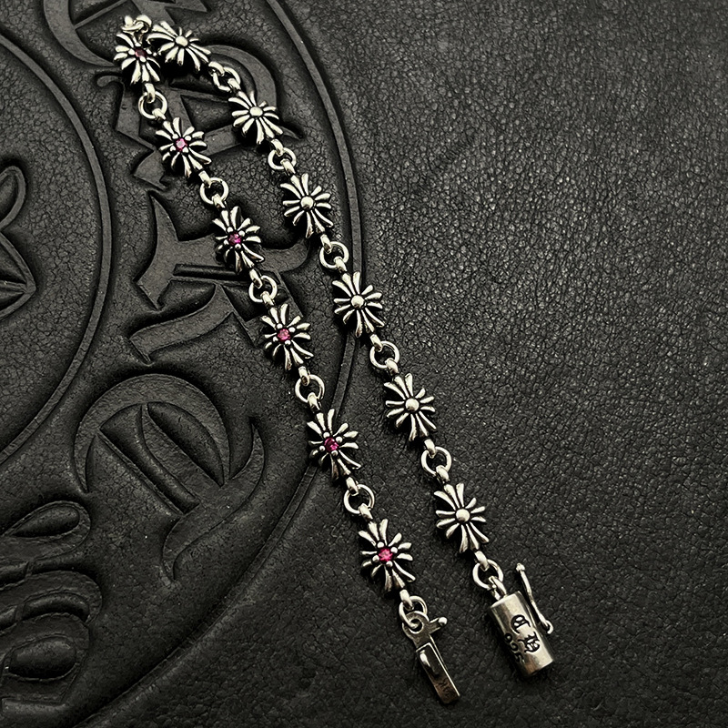 歐美百搭手鏈鑲鑽細十字花男女士手飾泰銀復古嘻哈插釦插片手環