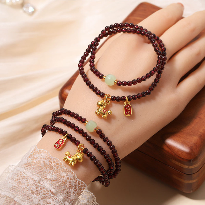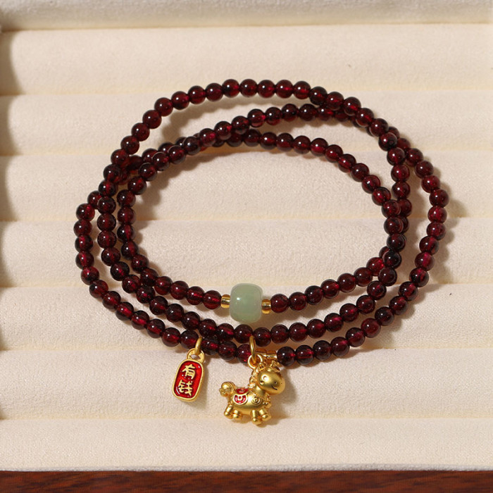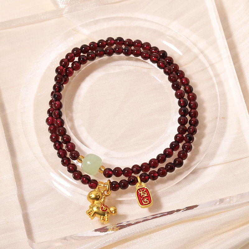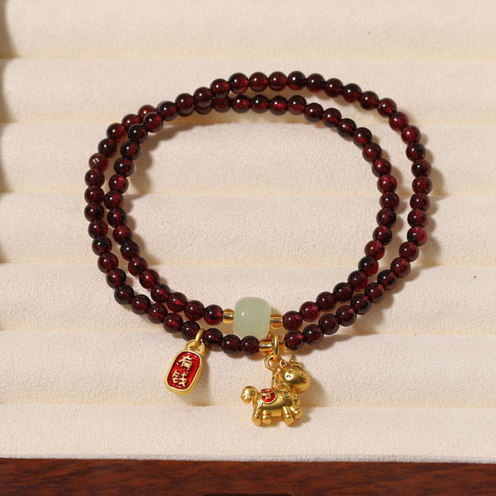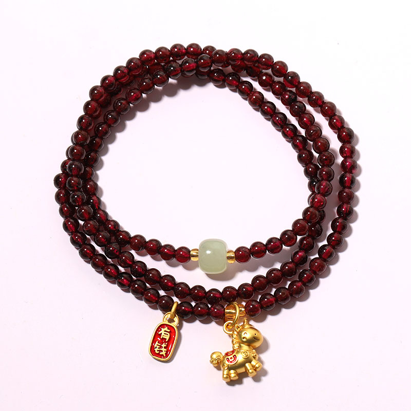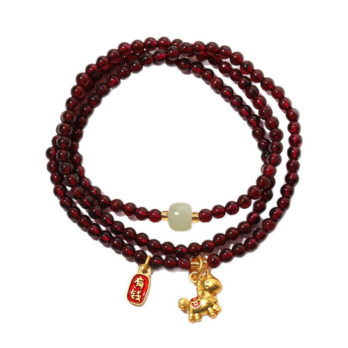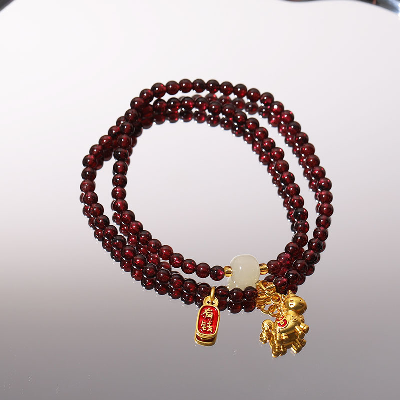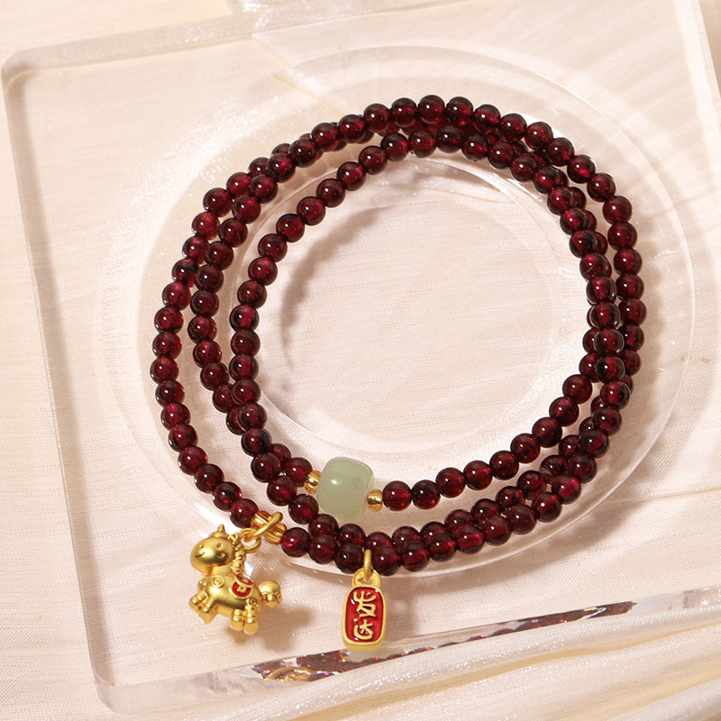 純天然石榴石手串三圈生肖馬手鏈女款和田玉路路通天然石水晶