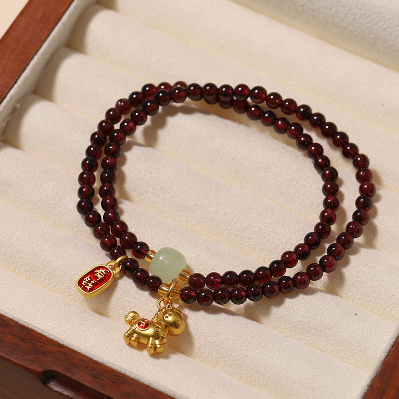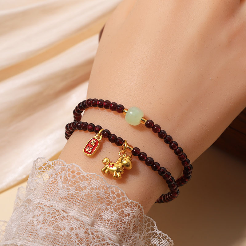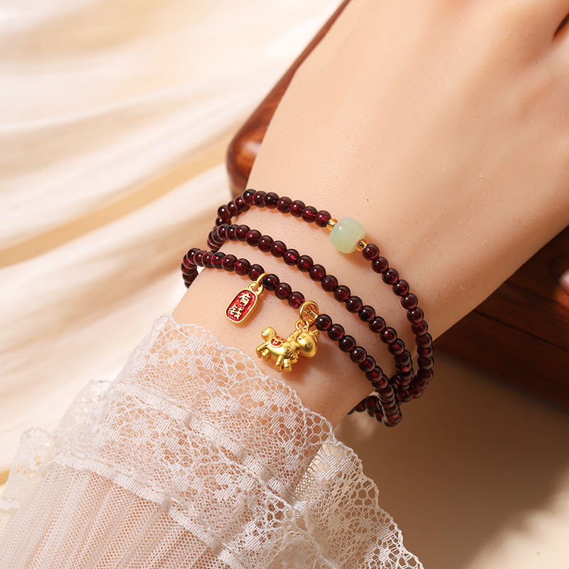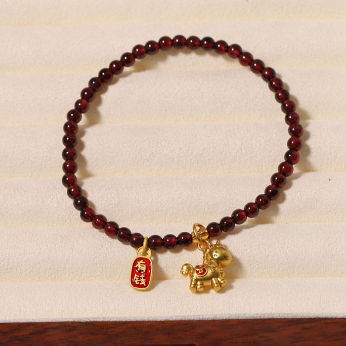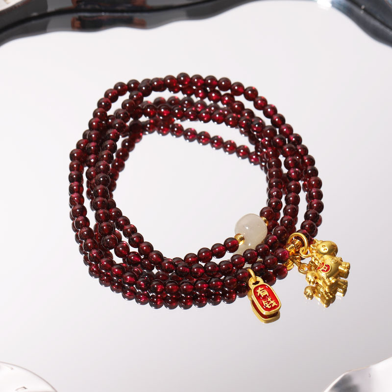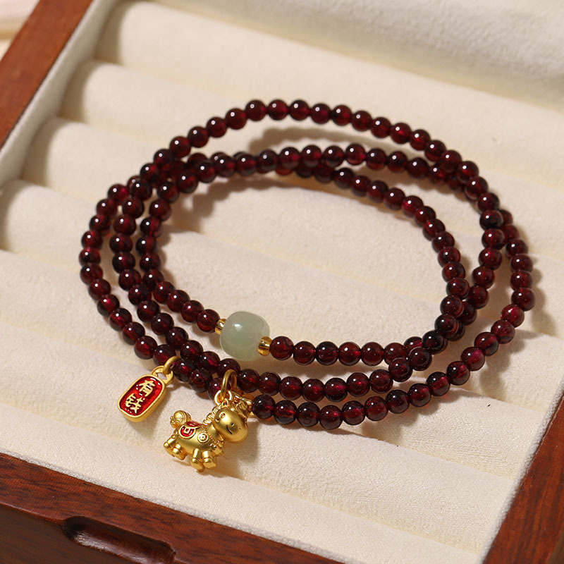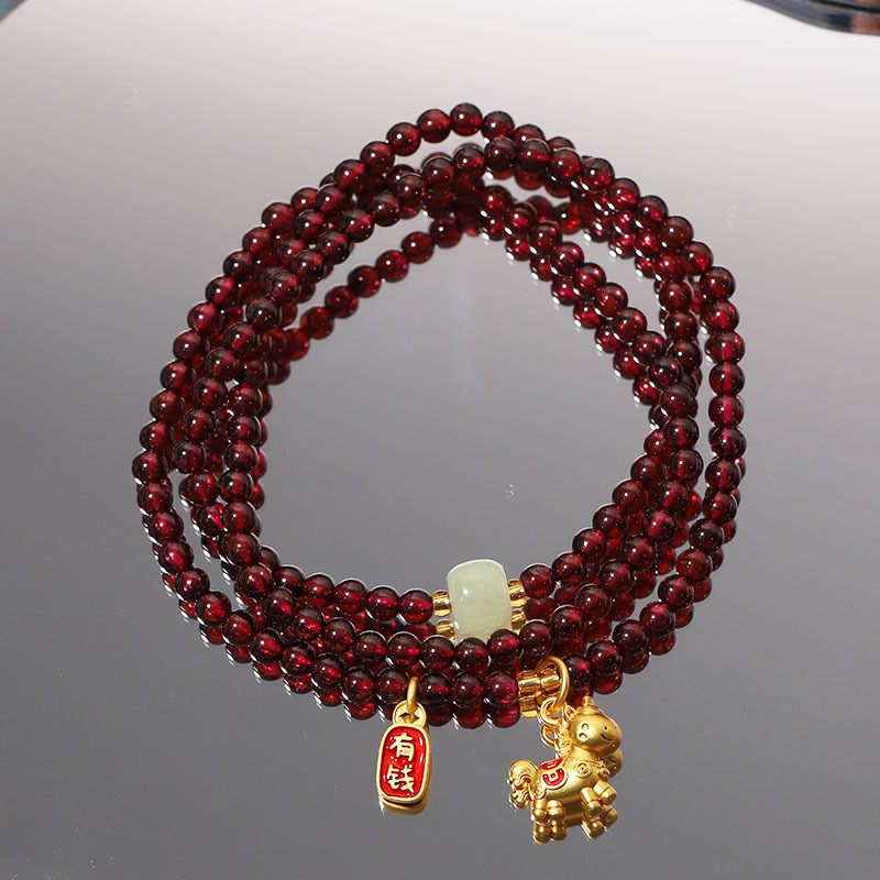 純天然石榴石手串三圈生肖馬手鏈女款和田玉路路通天然石水晶