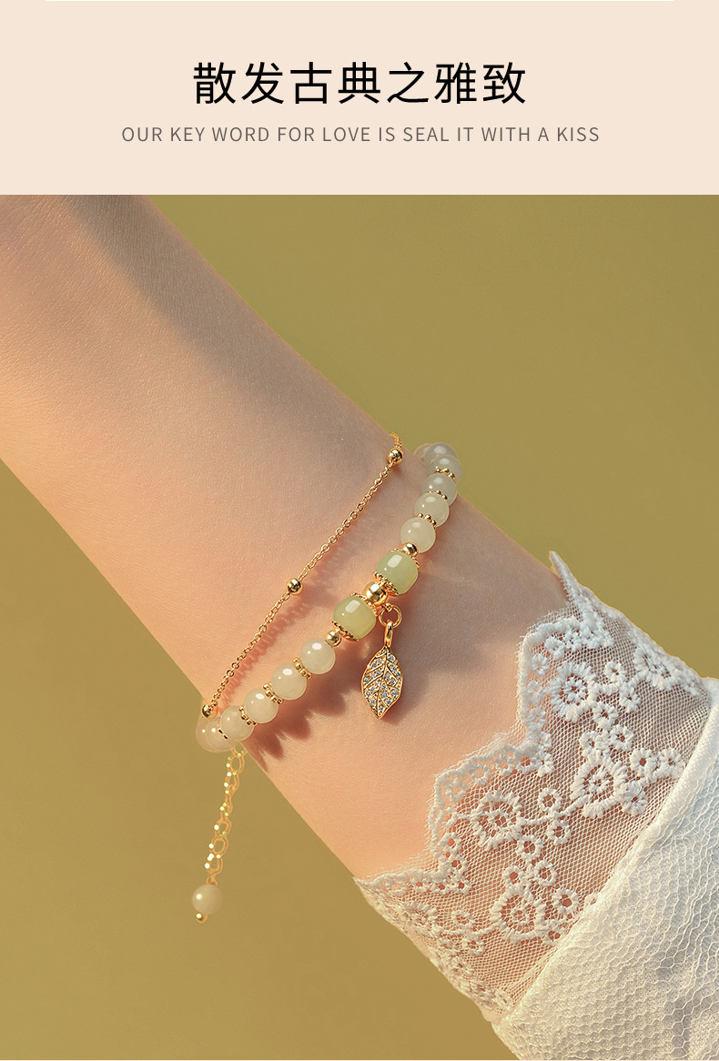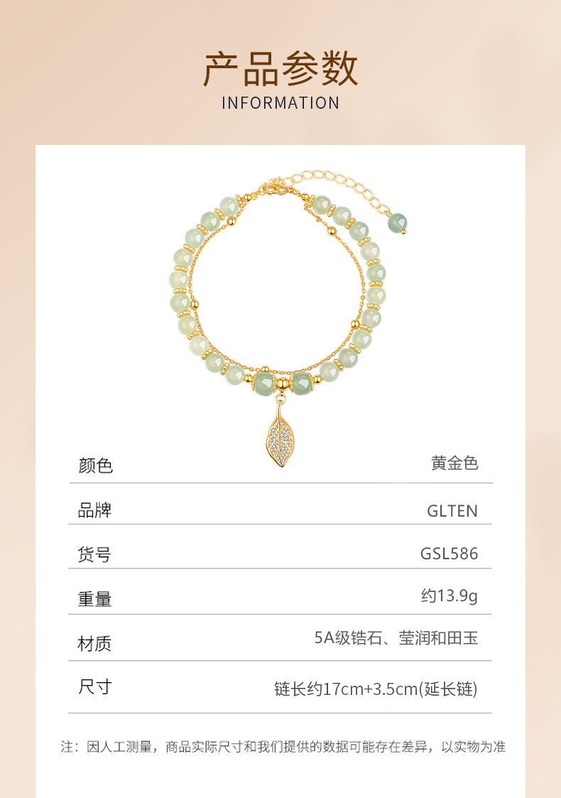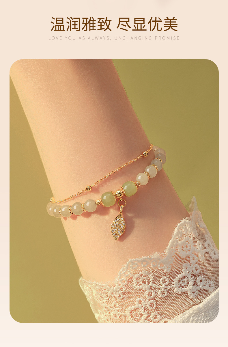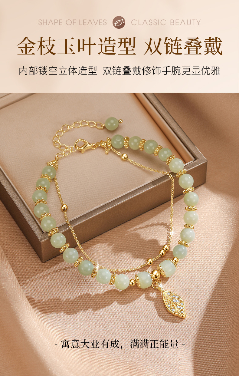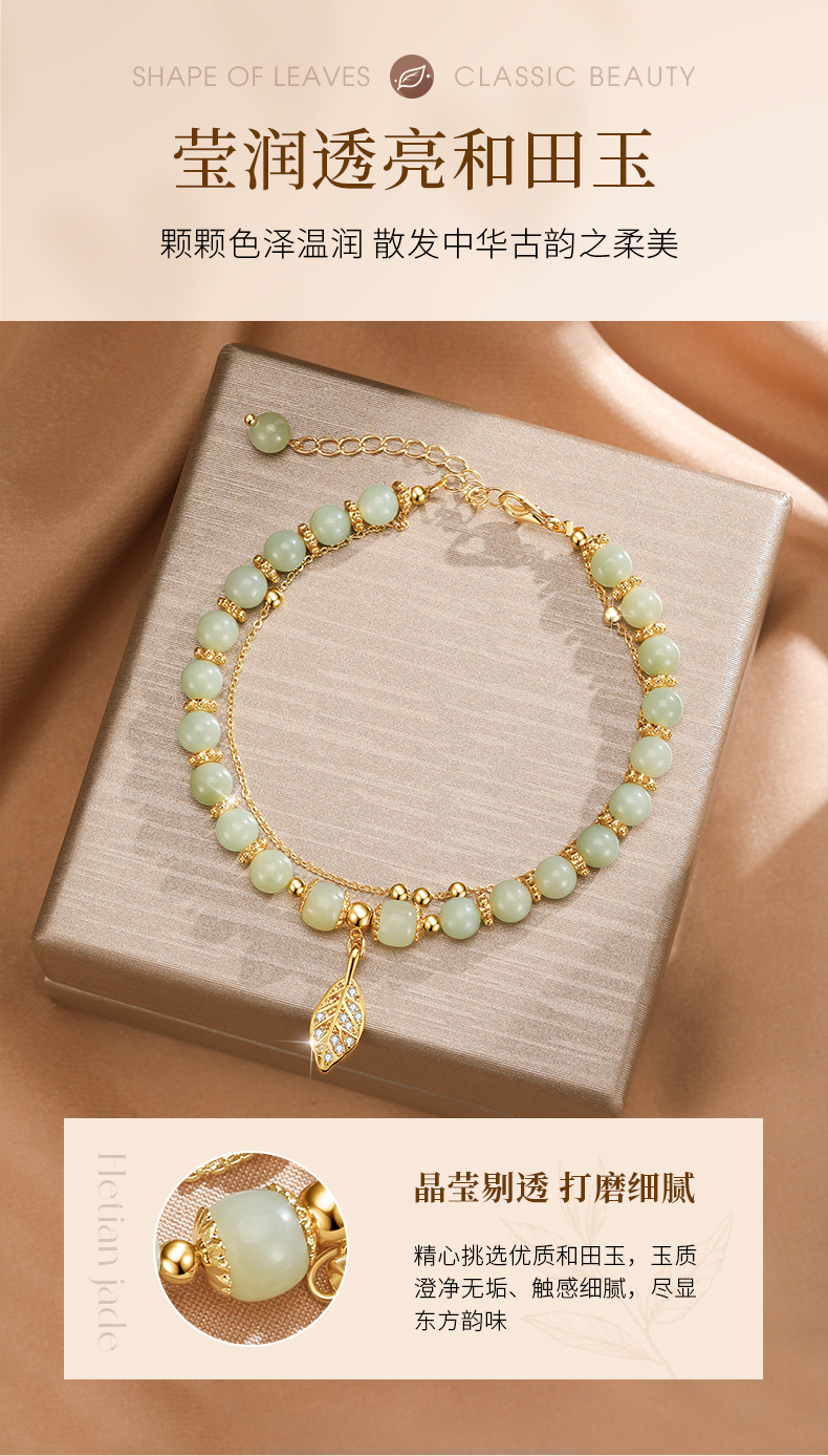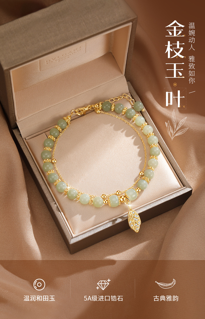 925銀鑲鋯石金枝玉葉手鏈和田玉小衆手串珠手飾女式鍍黃金色