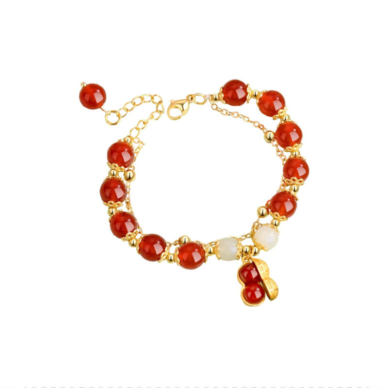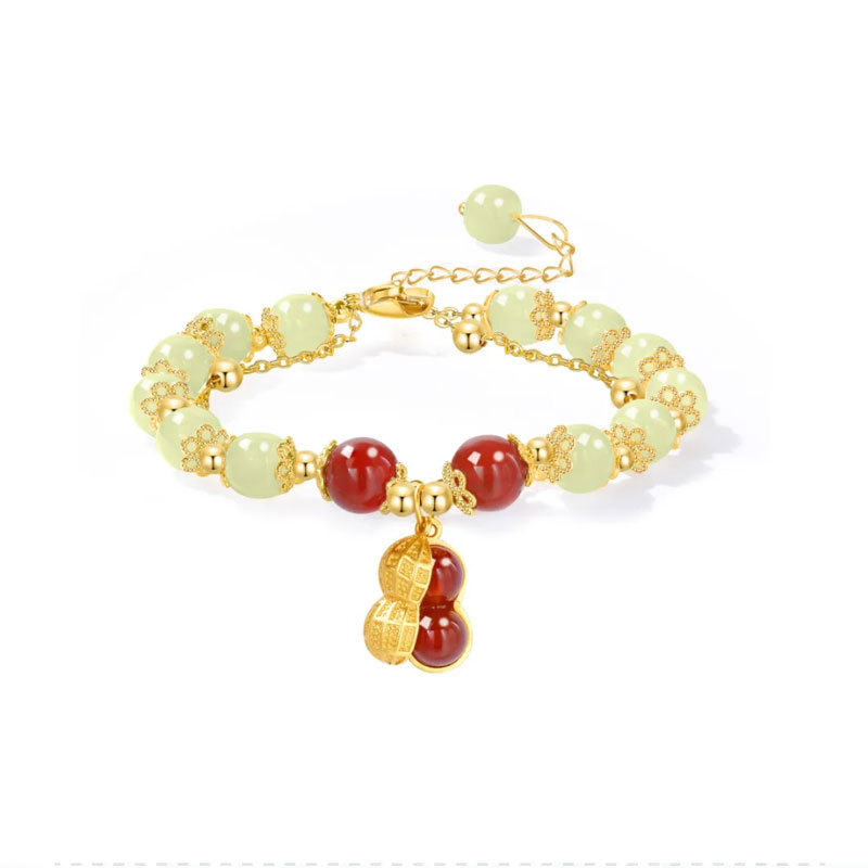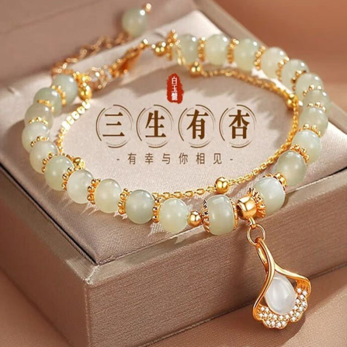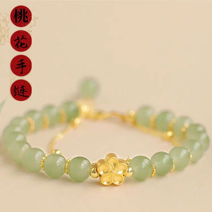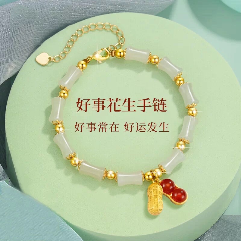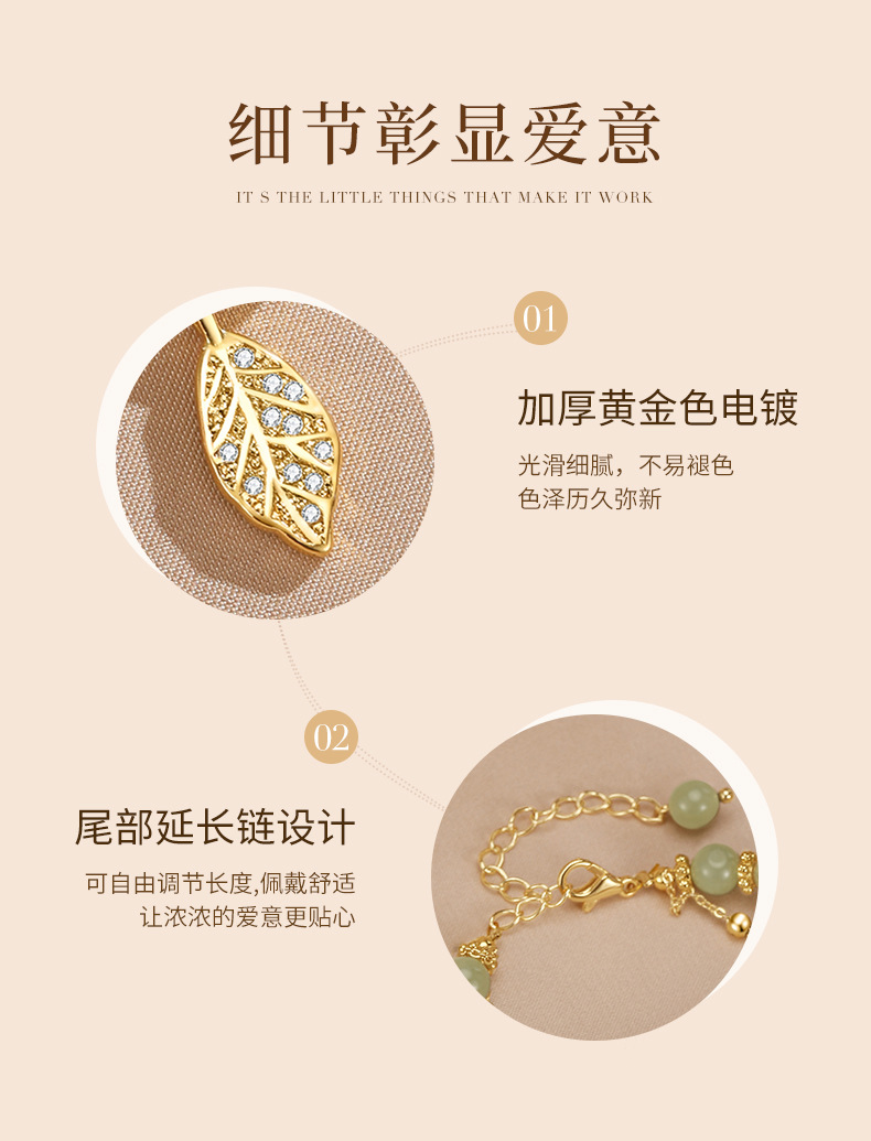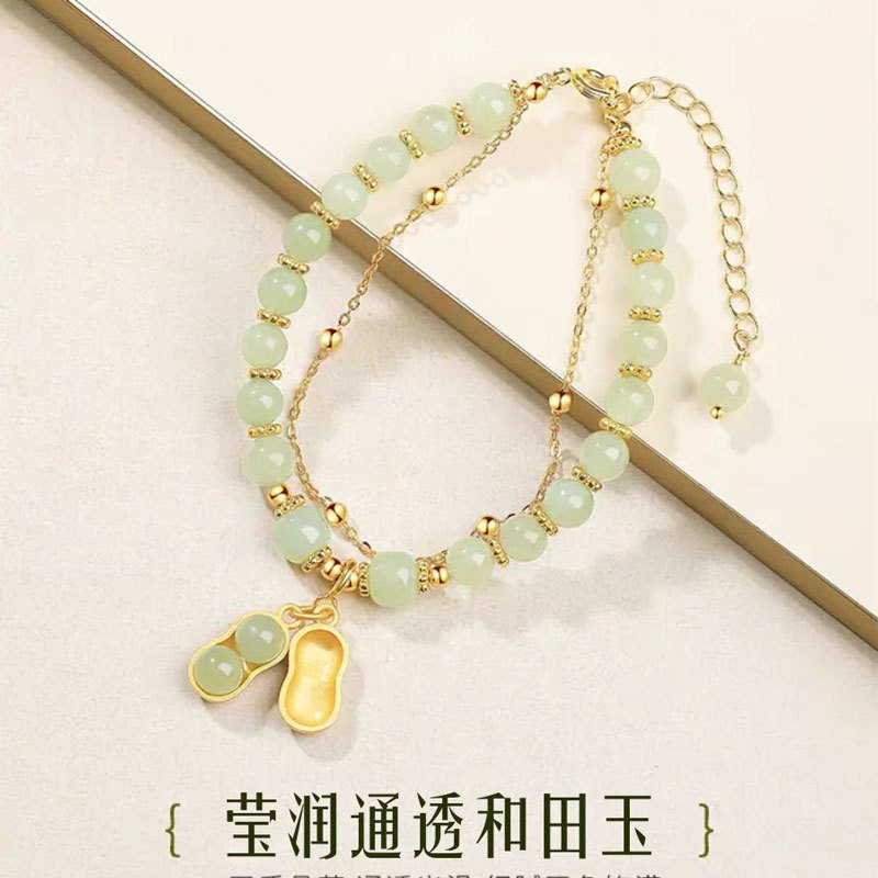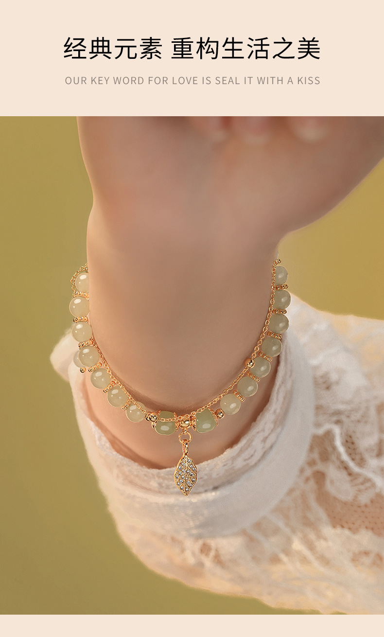 925銀鑲鋯石金枝玉葉手鏈和田玉小衆手串珠手飾女式鍍黃金色