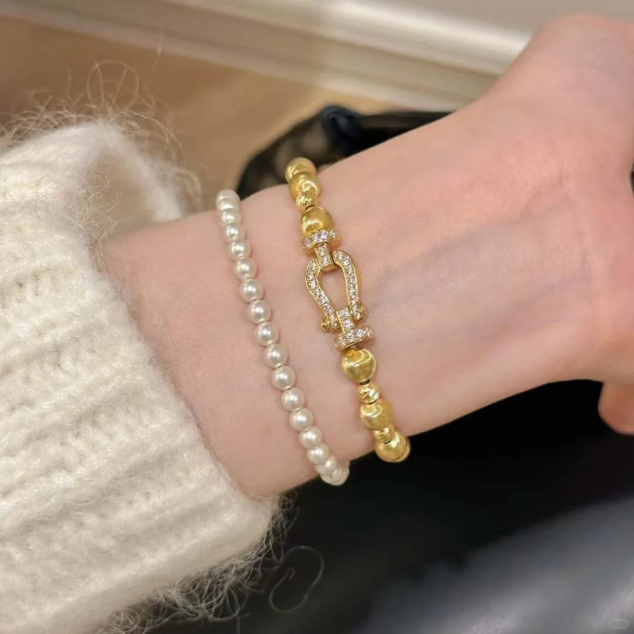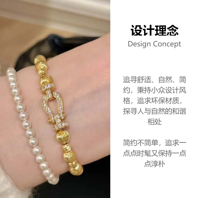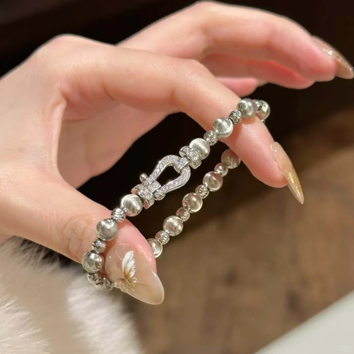 復古鑲鑽貓眼馬蹄釦手鏈女中古風小衆彈力繩手飾手串鏈條貓眼石
