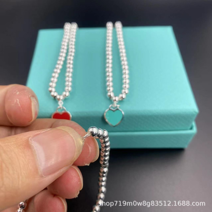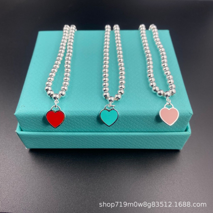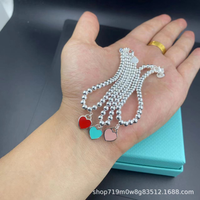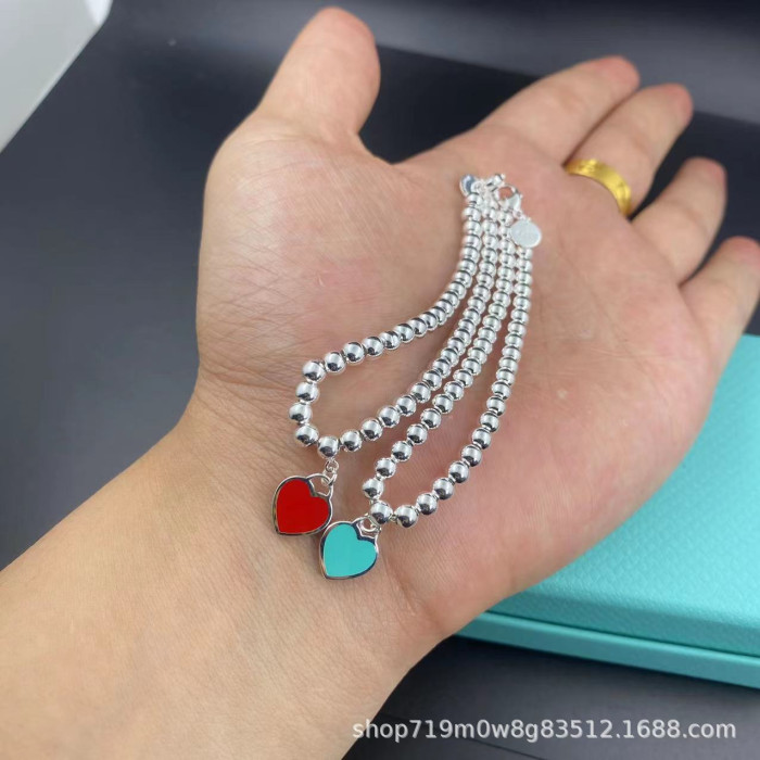 T家經典S925心形琺瑯4mm珠子愛心雙層鏈藍紅粉吊墜圓珠女生手鏈