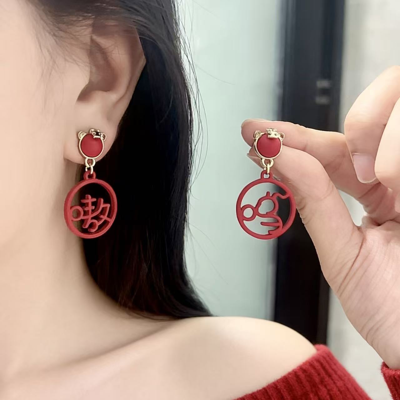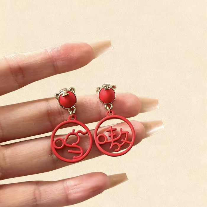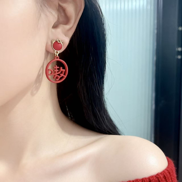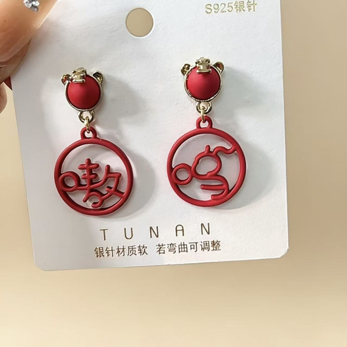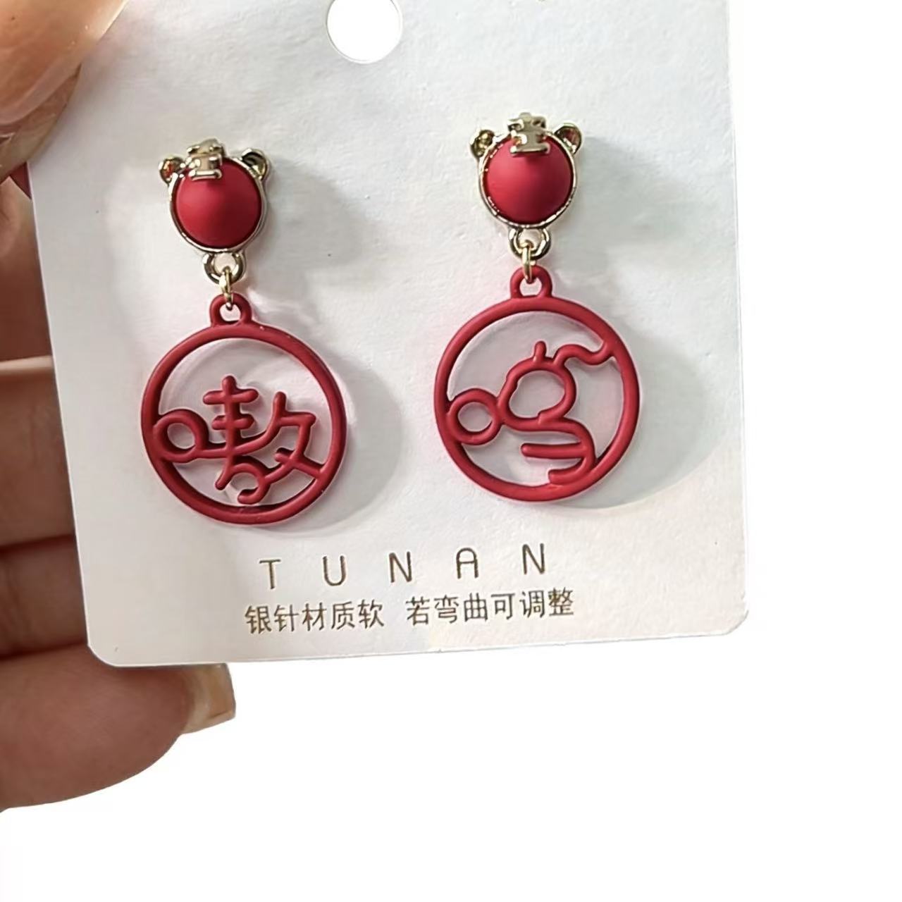 925銀針虎年新款嗷嗚吊墜國風文字耳釘小衆設計紅色本命年耳飾