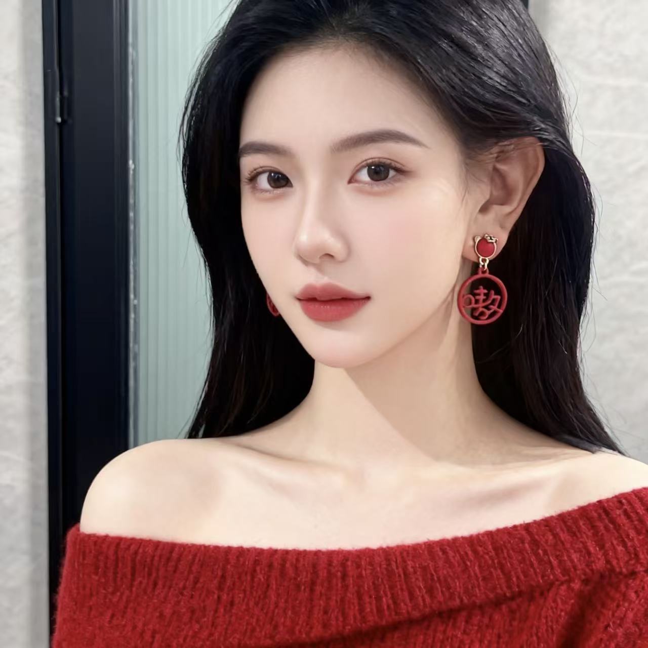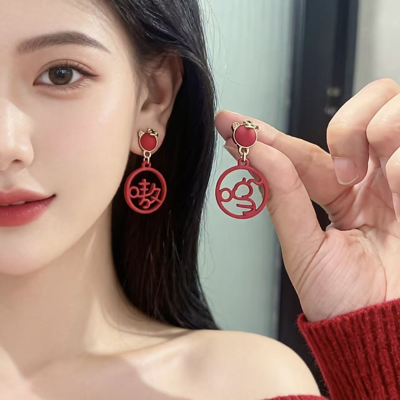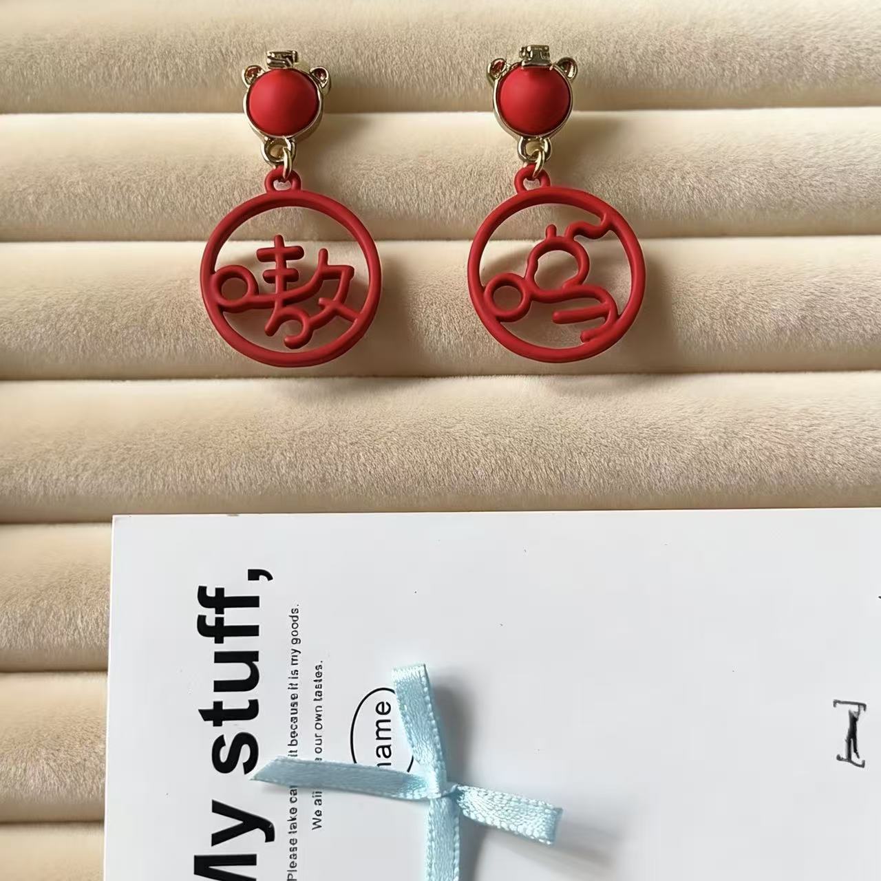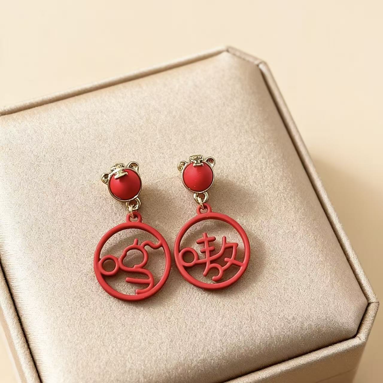 925銀針虎年新款嗷嗚吊墜國風文字耳釘小衆設計紅色本命年耳飾