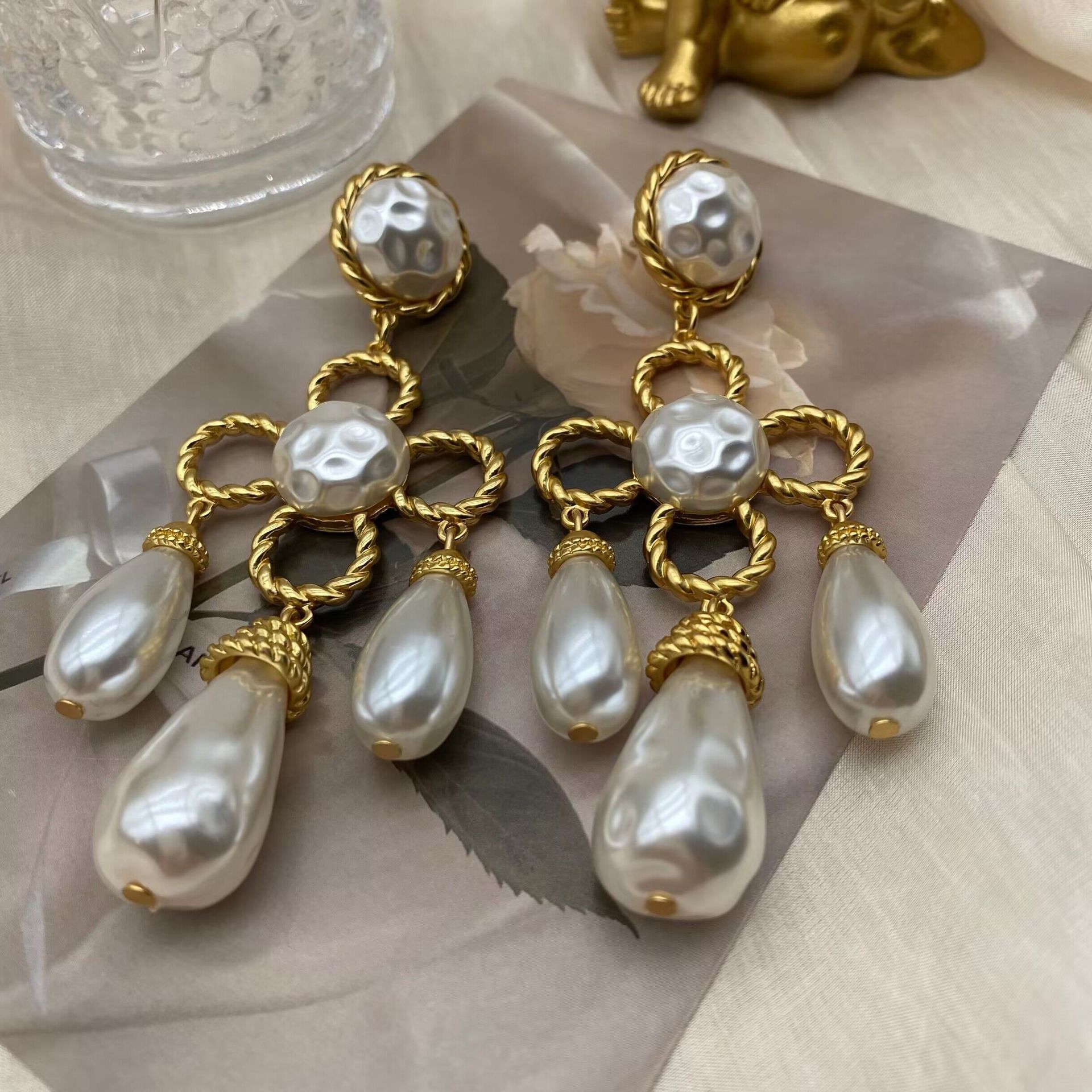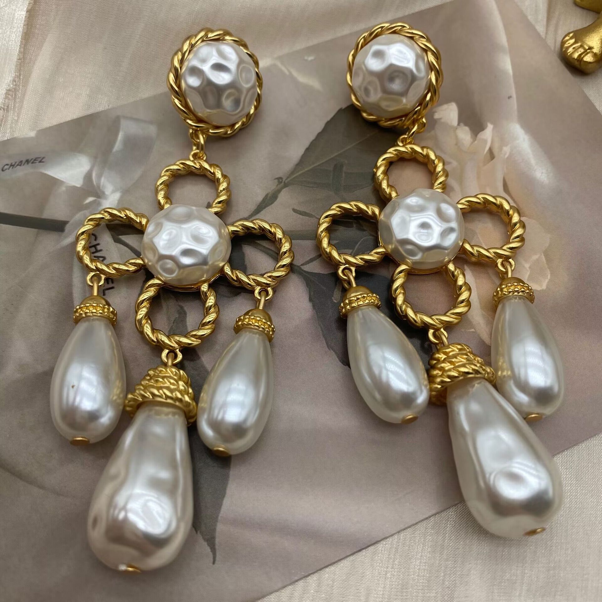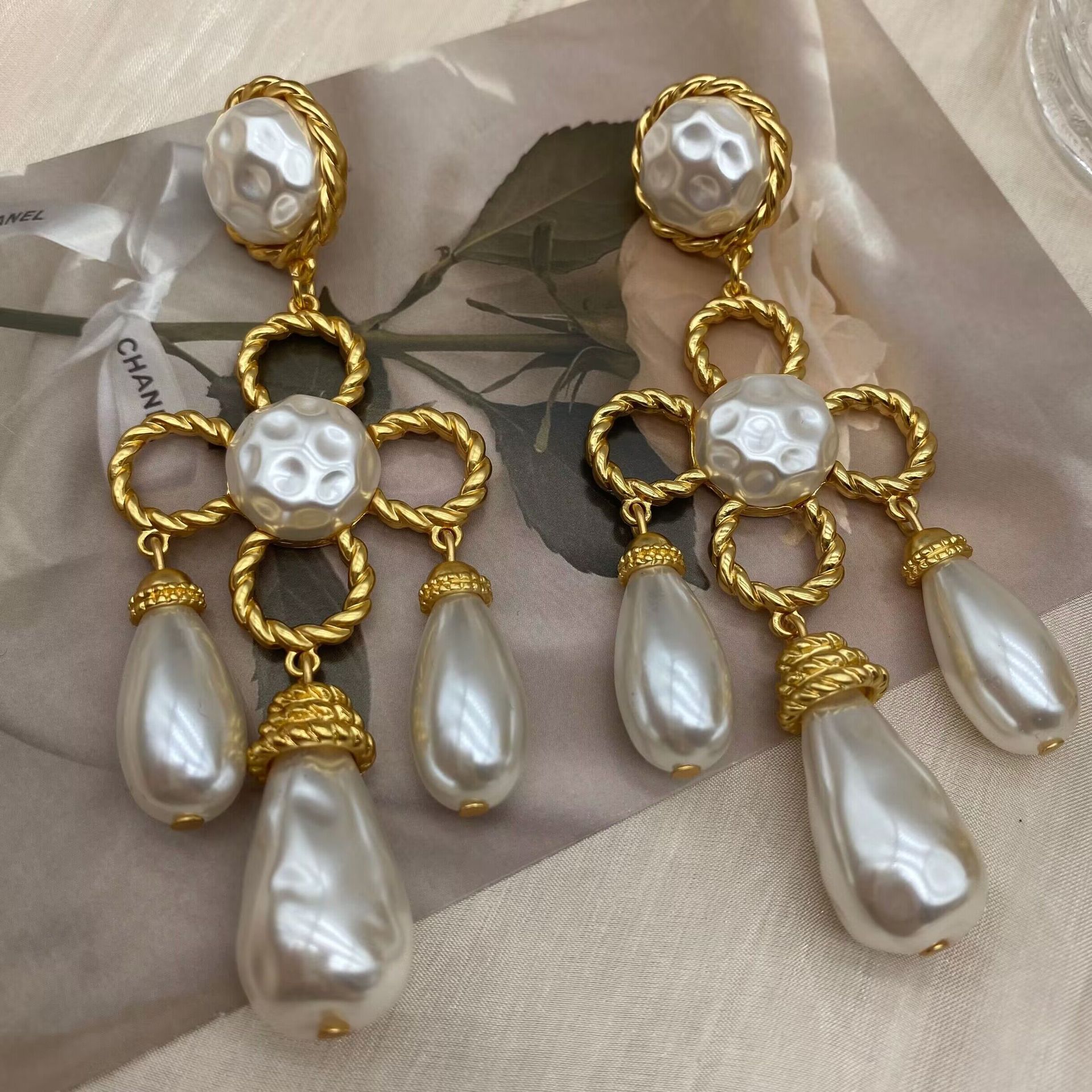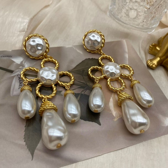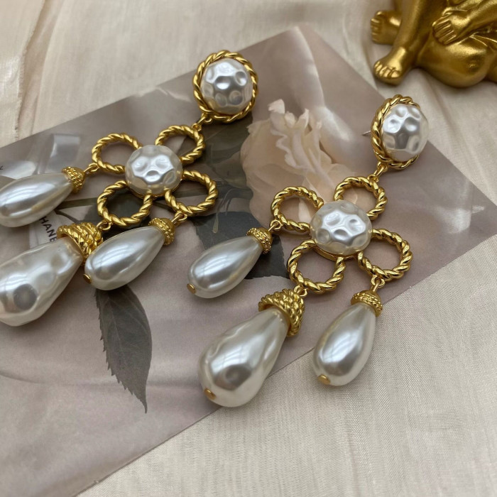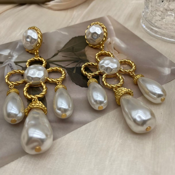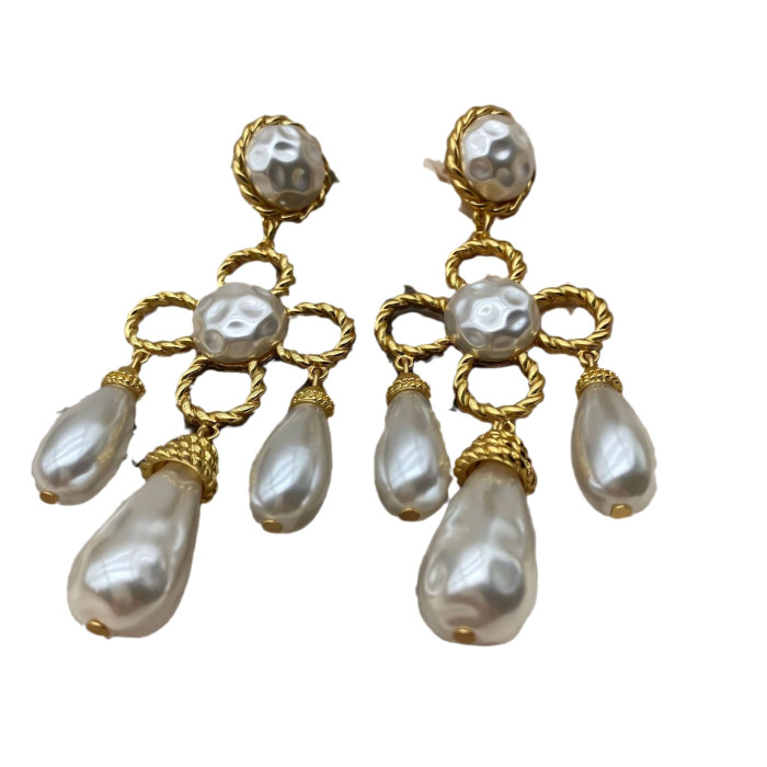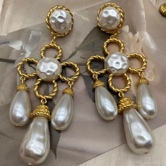 中古vintage西洋電鍍真金掃肩款珍珠四葉草花朵編織925銀針耳釘