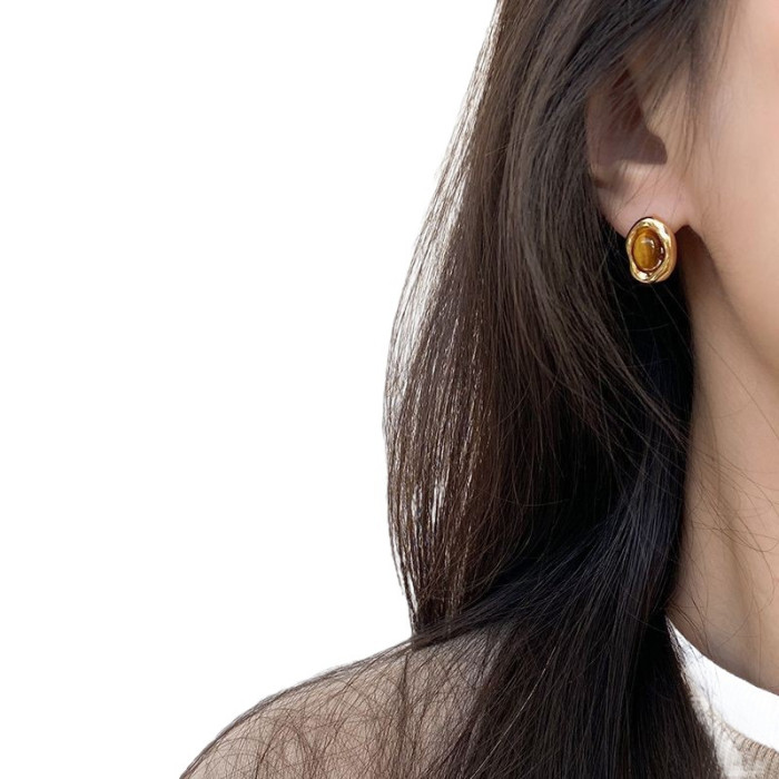 焦糖慄子天然虎眼石925銀針美拉德幾何耳釘氛圍感復古耳環耳飾