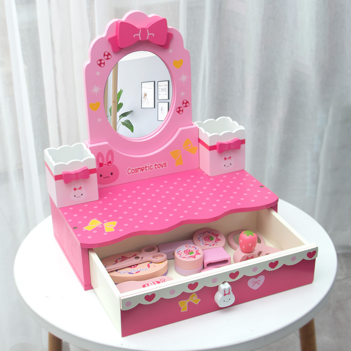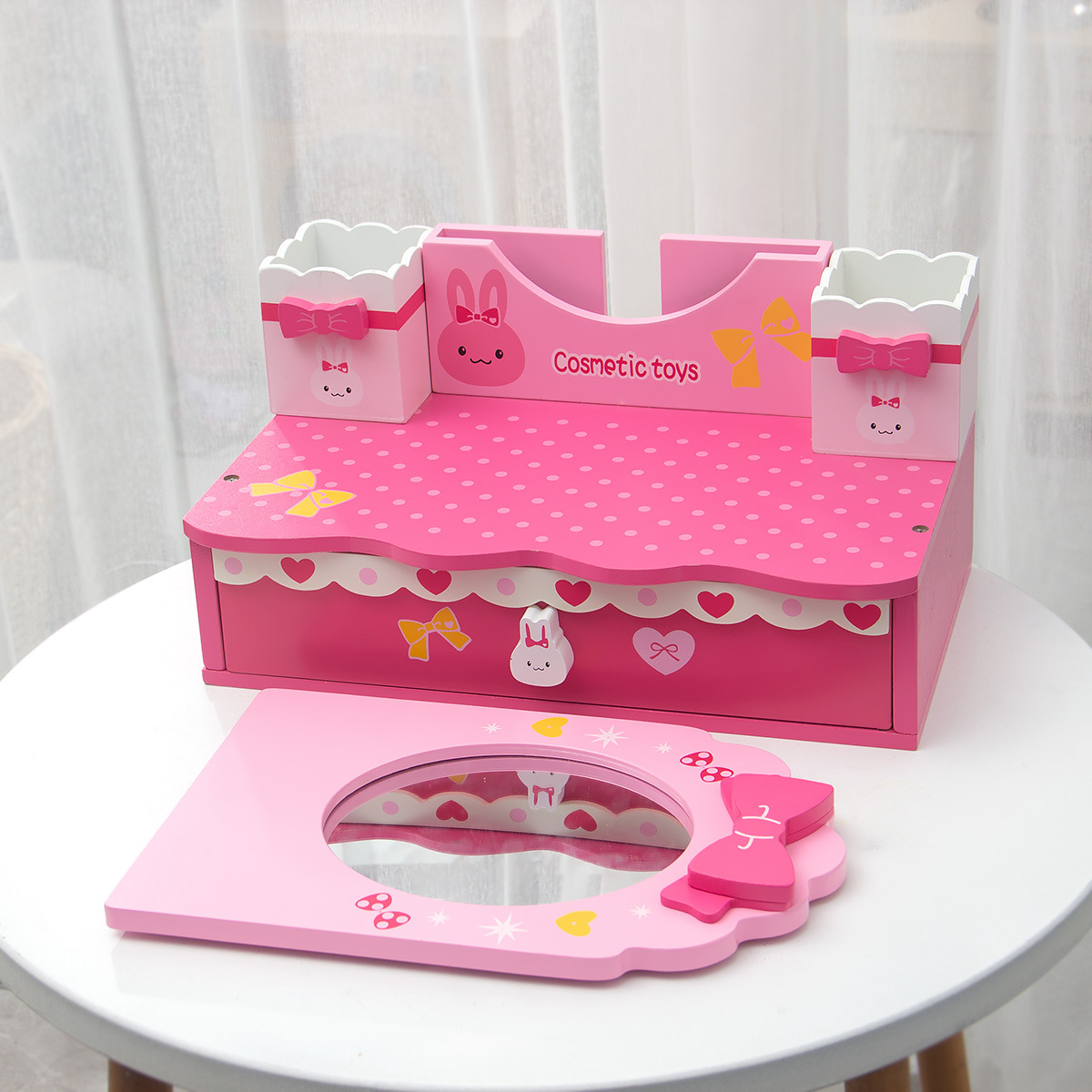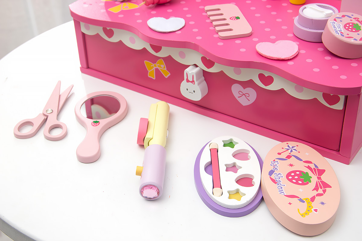 新款兒童木質化妝梳妝台公主女話粉紅玫紅色化妝品親子互動手玩具
