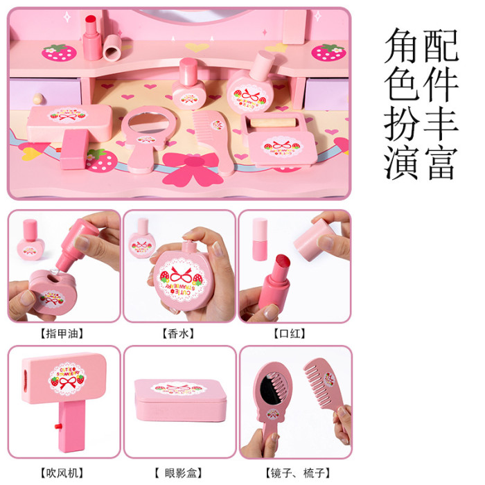 | 特色功能 | 仿真木製梳妝台化妝用品桌椅女孩扮家家酒模仿梳妝打扮 |