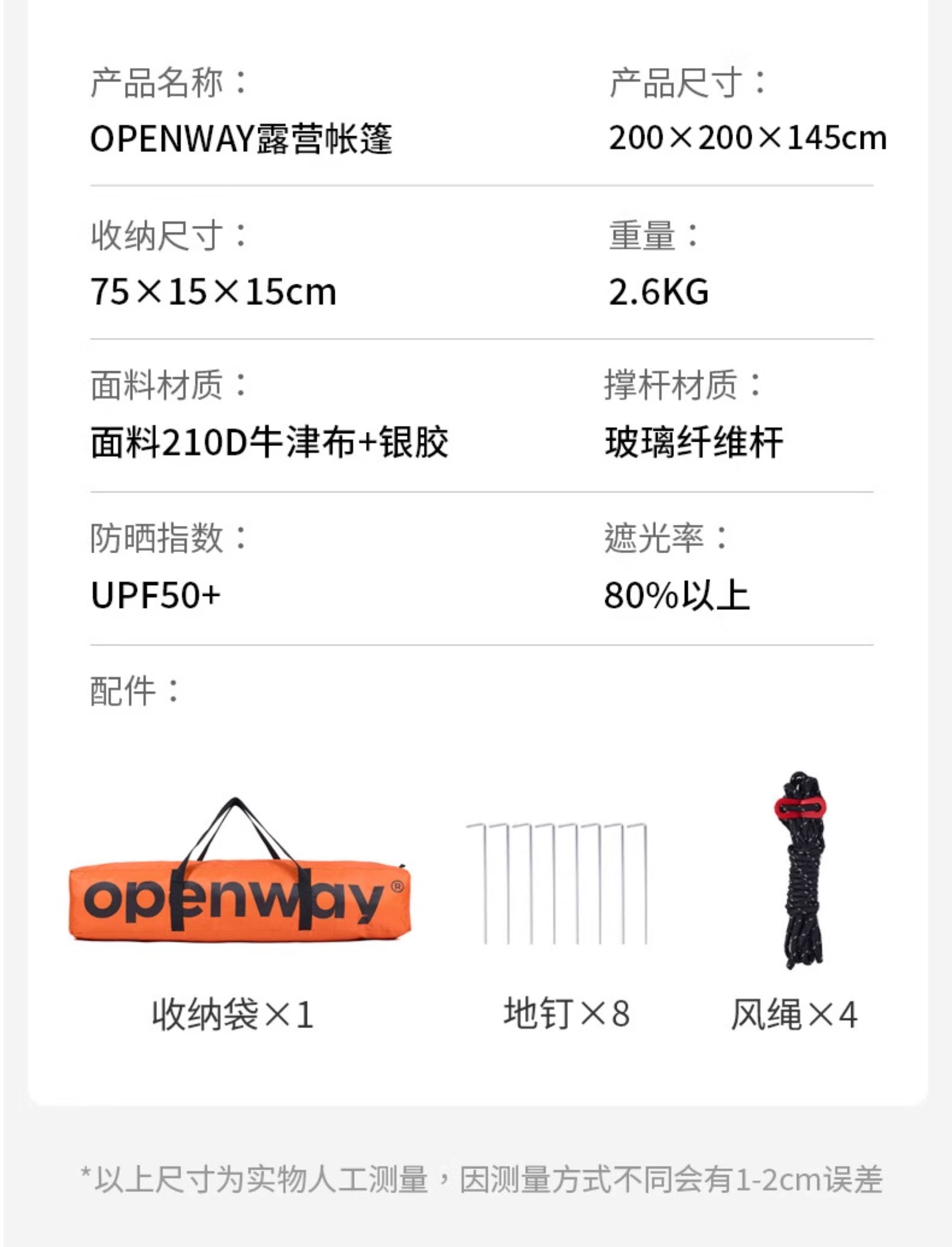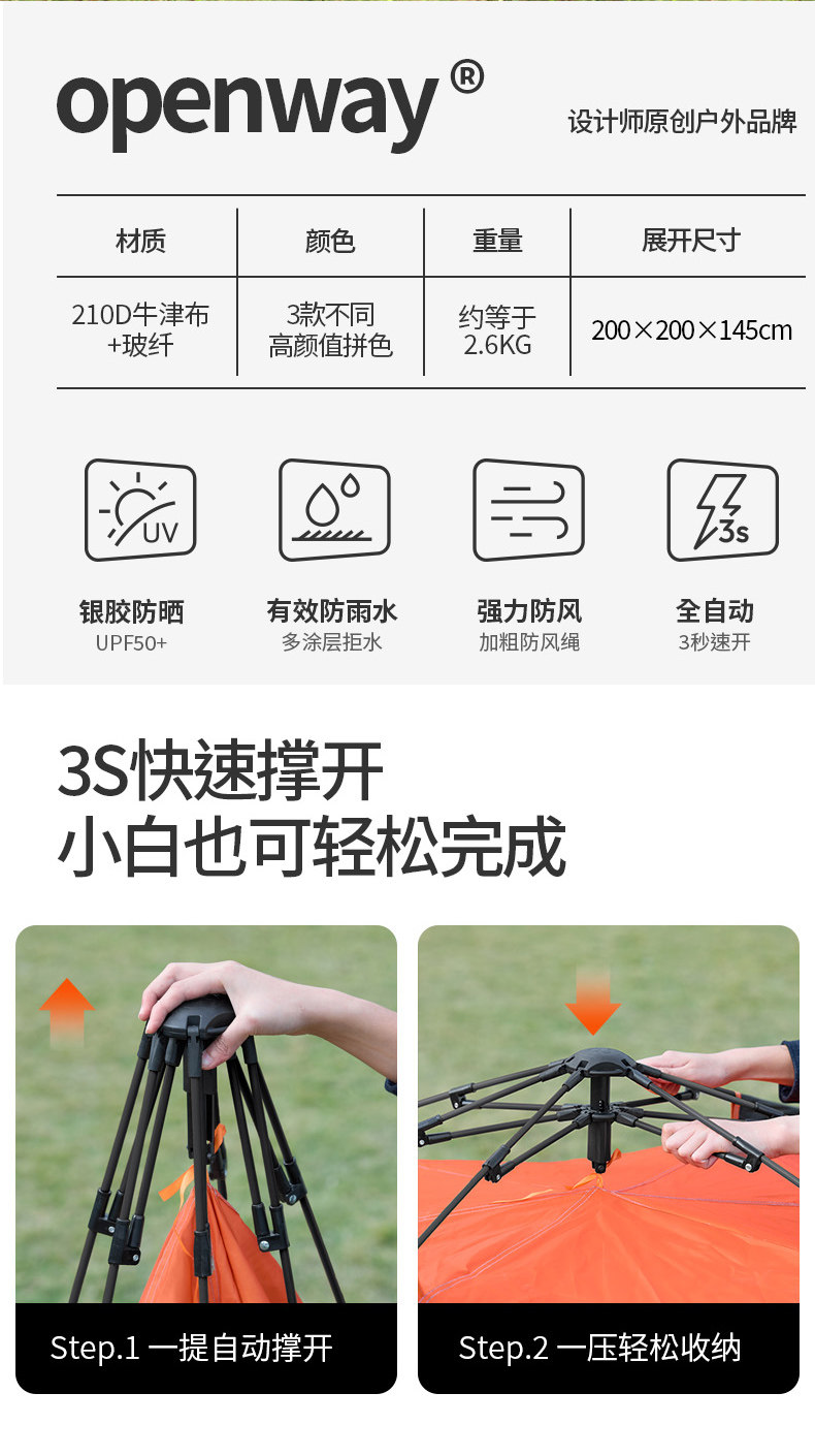 OPENWAY帳篷戶外可攜式折曡露營裝備防曬野營過夜自動速開防雨